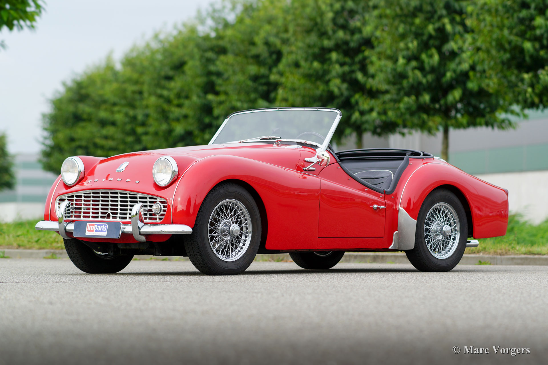 Triumph TR 3a, year 1962. Colour red with a black leather interior, black carpet and a black tonneau cover. This fantastic Triumph TR 3a is in very good condition and the car drives and steers perfectly! The open driving experience is magnificent! The car features chrome wire wheels, overdrive, an electric cooling-fan, and modified steering gear (more precise and much lighter steering). This Triumph TR 3a offers the British sports-car feeling in abundance!