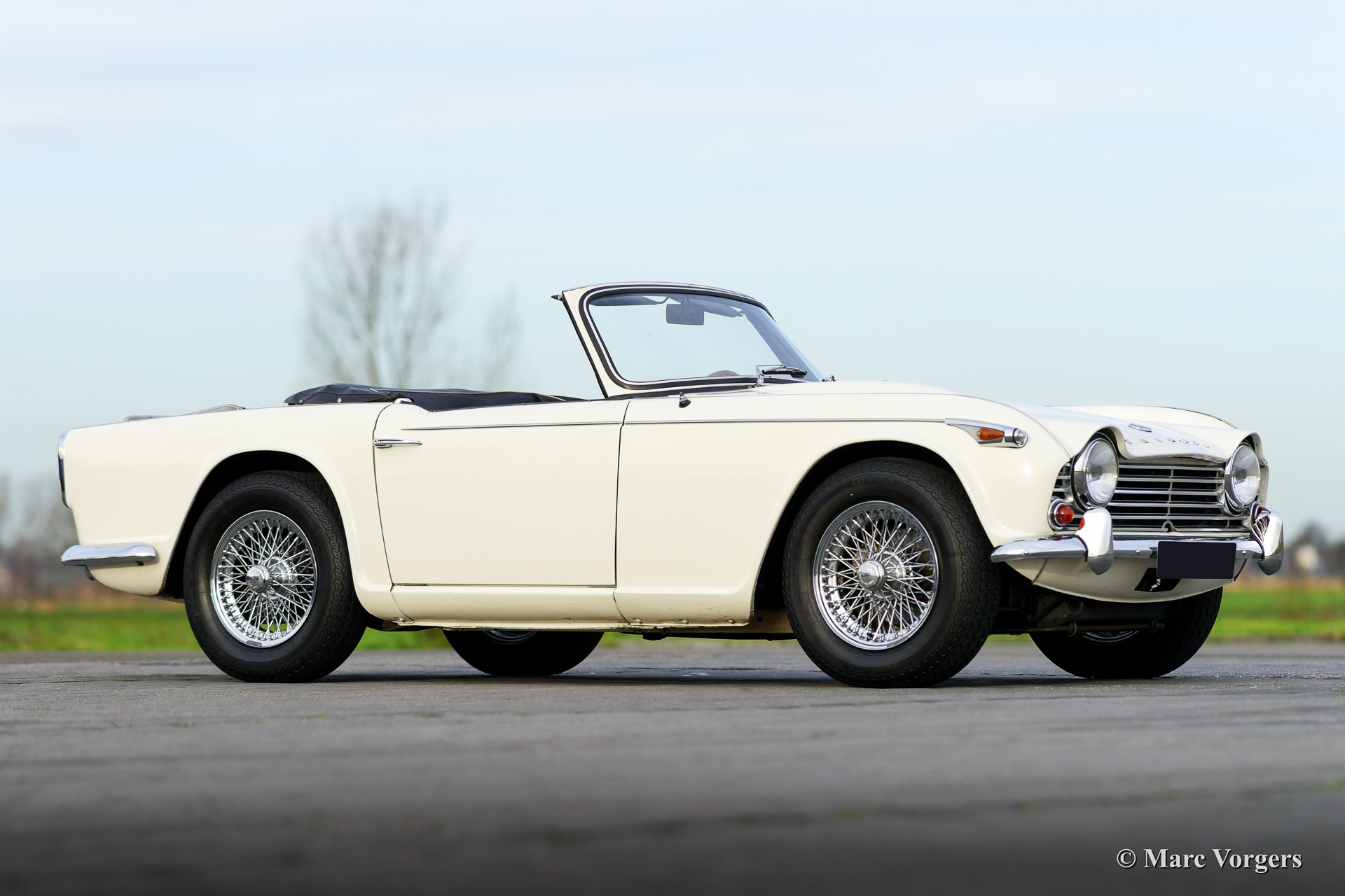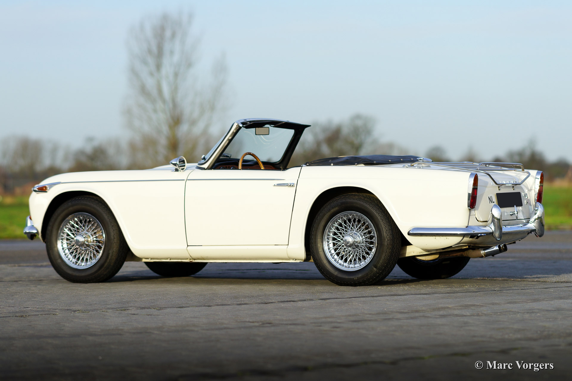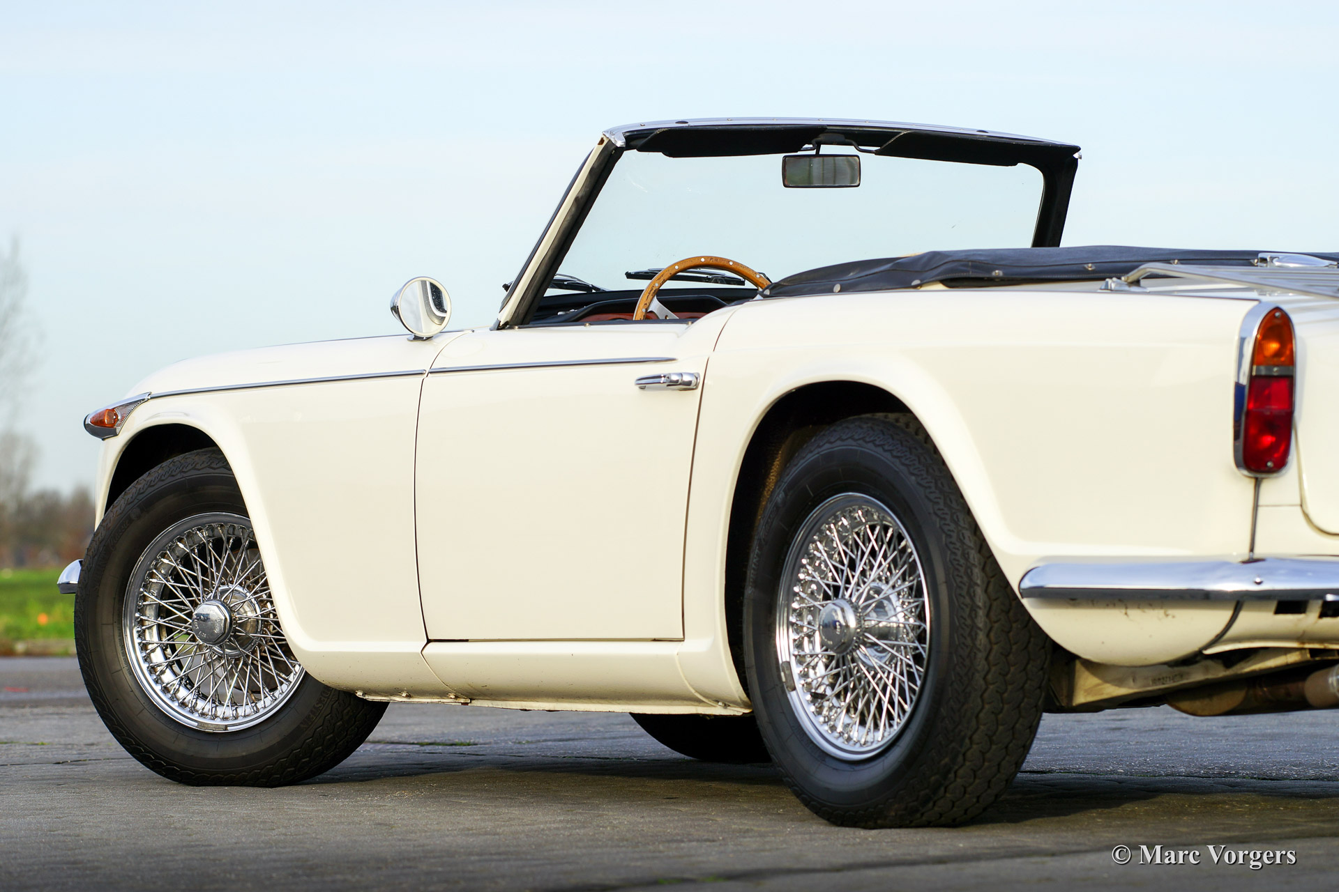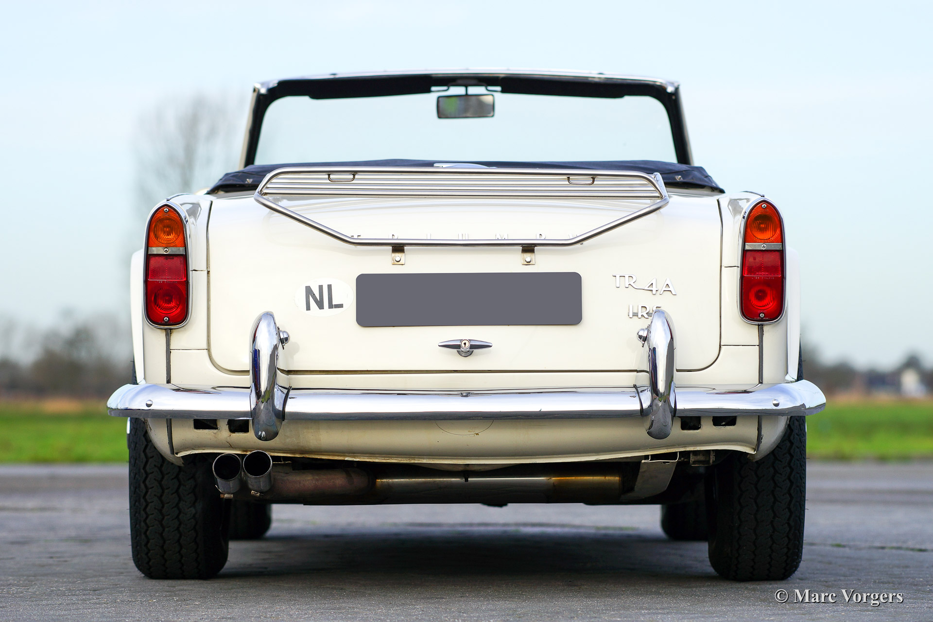Triumph TR 4a IRS, year 1967. Colour white with a black leather interior trimmed with white piping. Black carpet and black soft top. This fine Triumph TR 4a IRS (Independent Rear Suspension) was imported from France in the year 1991. Then the car was extensively 'body off' restored. One owner since 1991 and the car has driven approximately 25.000 km since the restoration. This TR 4a IRS is in very good condition! The engine was slightly tuned and fitted with two twin choke Weber carburettors. Further more the car sports a new mohair soft top, overdrive, chrome wire wheels, chrome luggage rack, a MotoLita steering wheel with wood rim, a period radio and power brakes. A delightful classic!