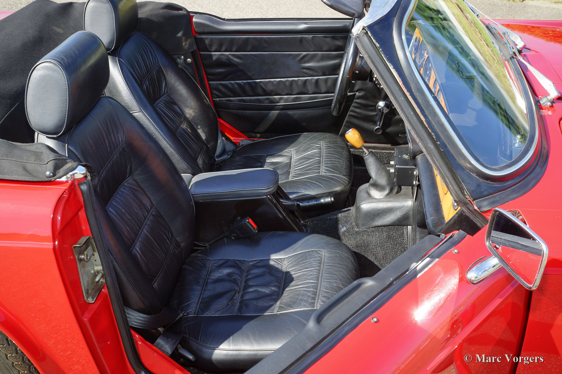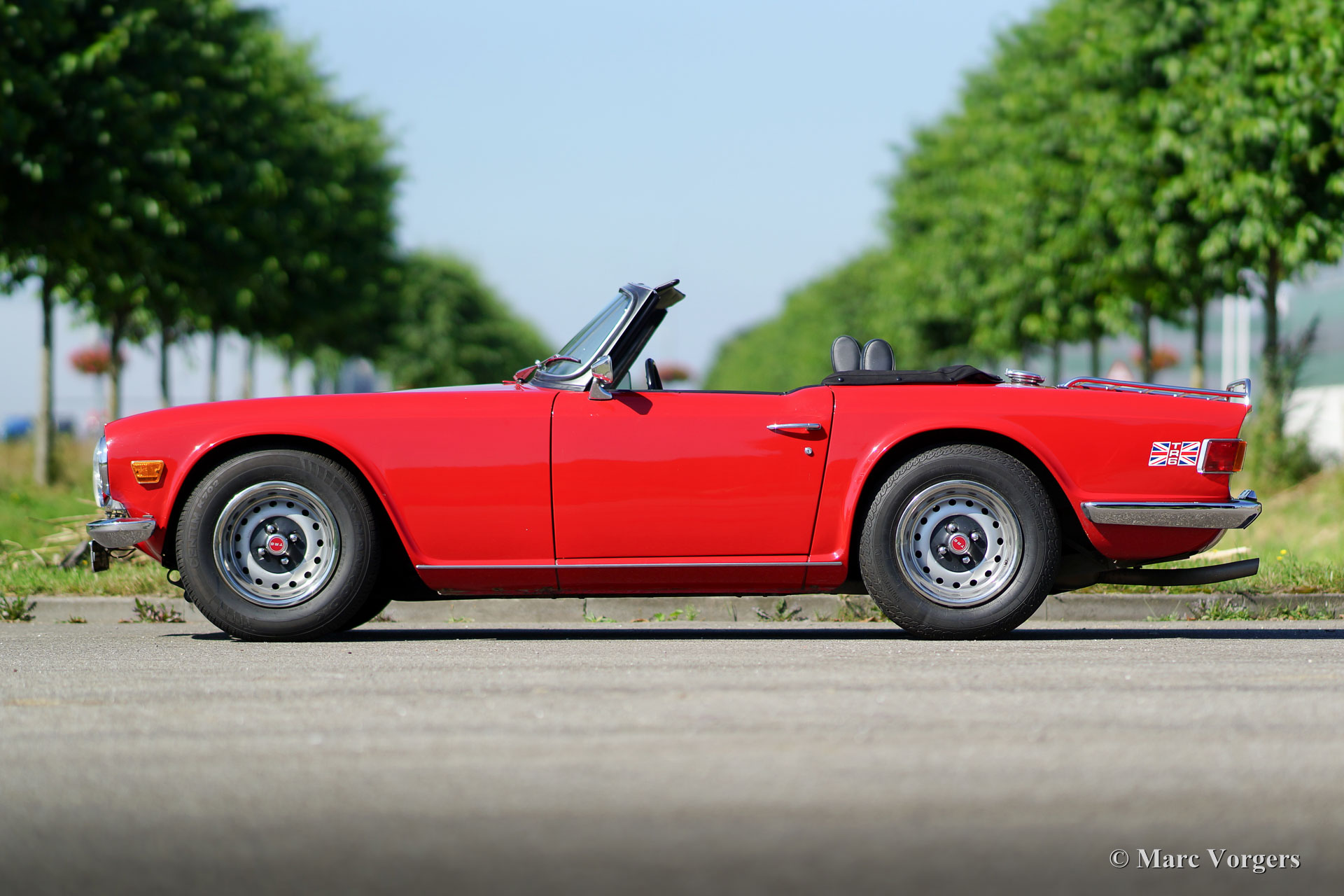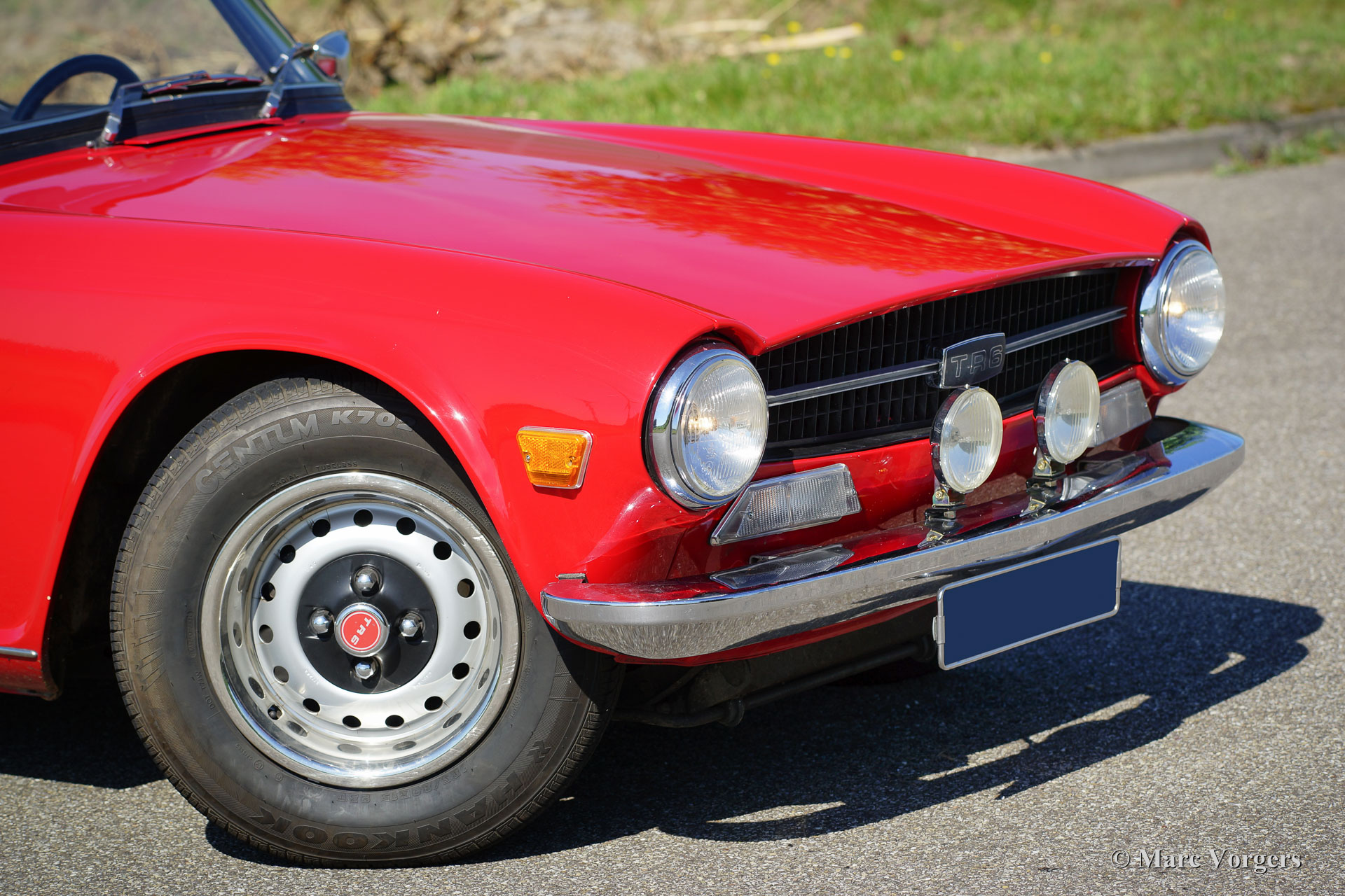 Triumph TR 6, year 1971. Chassis number (VIN) CC6104XX. Colour red with a black leather interior and black carpet. Black vinyl soft-top and a black canvas hood-cover. This masculine Triumph TR 6 was imported to the Netherlands in the year 1991. From 1991 the car has known only one enthusiast owner who has taken excellent care of the car. This TR 6 is in very good condition! The car comes complete with an extensive file containing all the service and overhaul invoices. The invoices show that in the period 2008-2009 the engine, gearbox and overdrive were overhauled. The engine was modified to run on lead-free petrol in the process. Since these rebuilds the car has driven only 7000 miles. This TR 6 features new leather seats, overdrive, a chrome luggage rack, additional lamps at the front bumper and a rally trip meter.