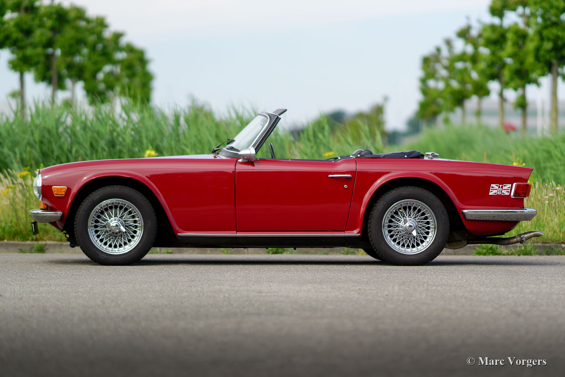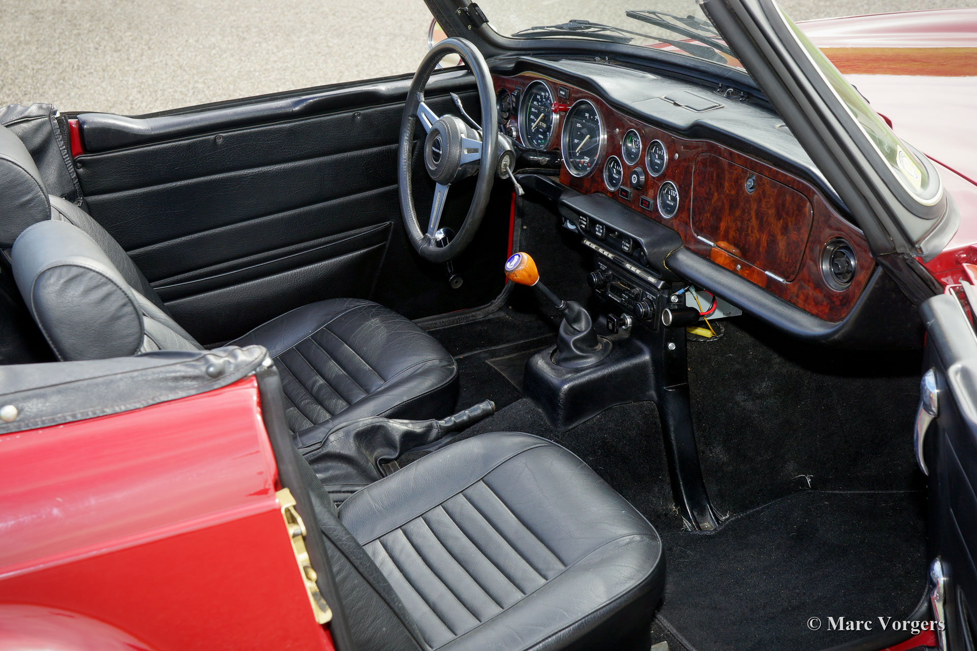 Triumph TR 6, year 1973. Colour Carmine red combined with a black leather interior and black carpet. Black vinyl soft-top and a black hood cover. This fantastic Triumph TR 6 was sold new in the USA. The automobile is in excellent driver condition with only slight traces of normal use. The car drives and sounds perfectly! The carburettor engine is modified to ‘fast road’ specifications incorporating a higher compression ratio, S.U. carburettors and a ‘fast road’ camshaft. The car is also fitted with overdrive, electronic ignition, chrome wire wheels and a walnut veneer dashboard. The Triumph TR 6 is the last in the line of the ‘hairy chested’ British sports cars!