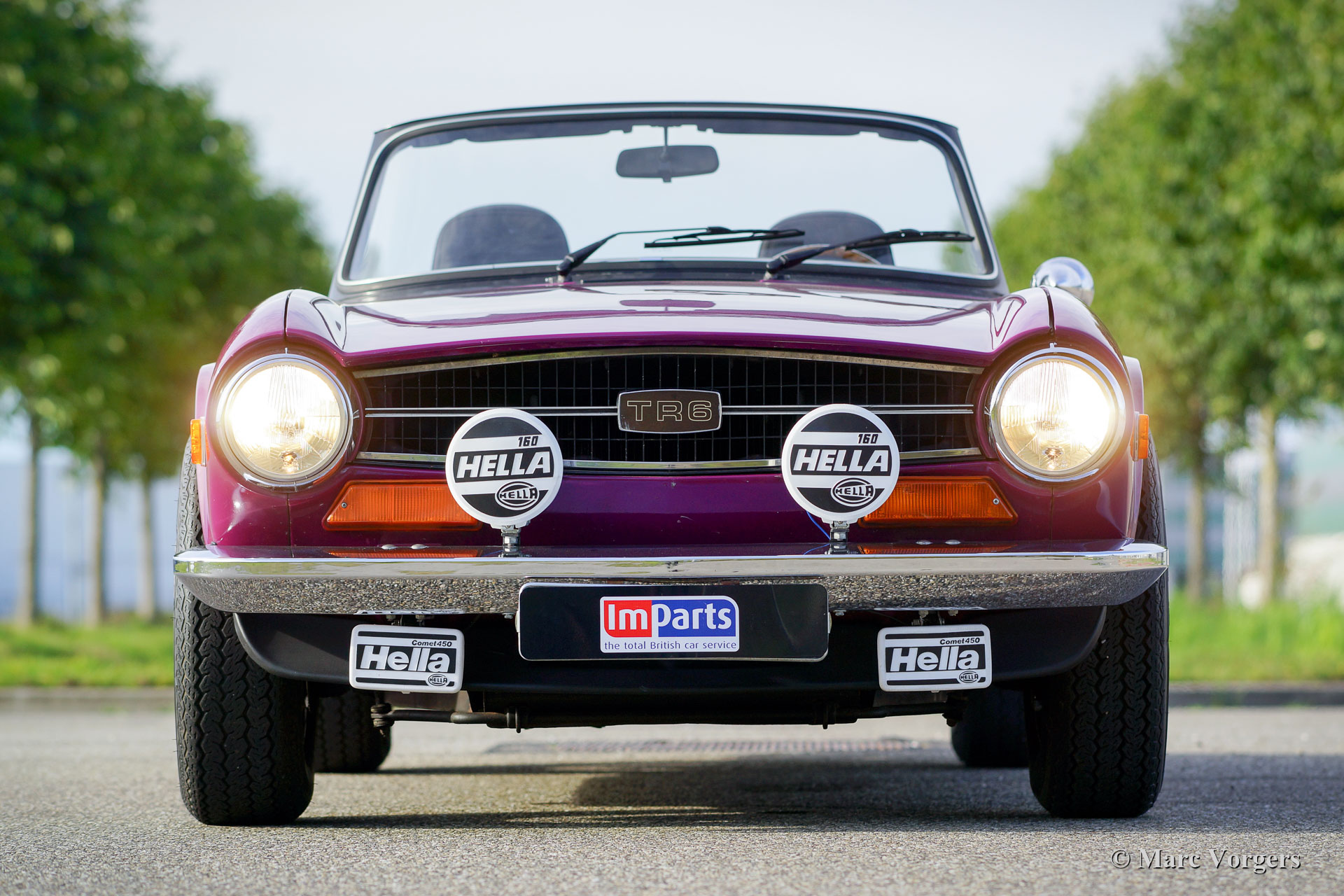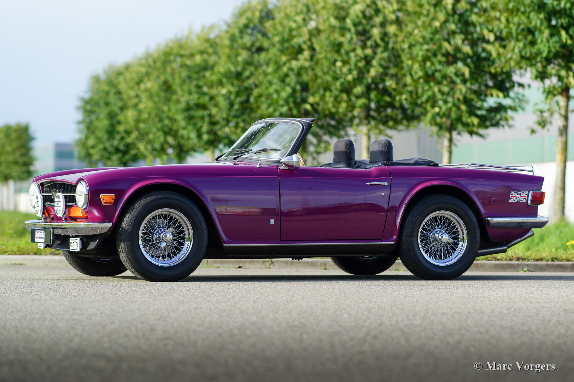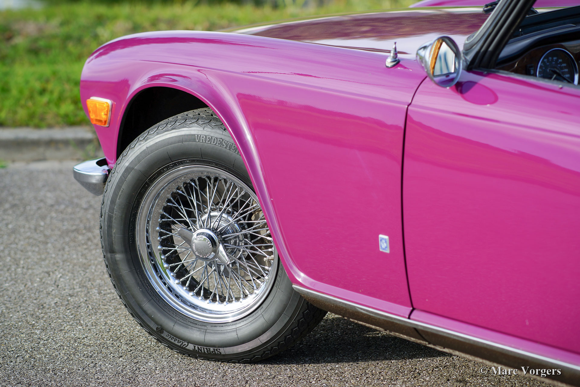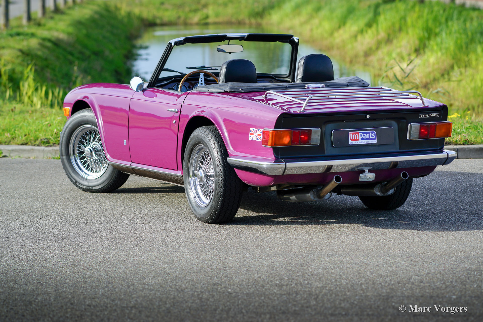 Triumph TR 6, year 1974. Colour Magenta combined with a black interior and a black mohair soft-top. This Triumph features the most extravert Triumph colour of the 1970s; you love it or you hate it, but the fabulously Karmann styled TR6 is one of the rare designs on which Magenta underlines its inner character! This fine Triumph TR6 is in very good condition and it is beautifully serviced and maintained over the years. The engine was overhauled and fitted with two S.U. carburettors and an aluminium rocker cover. The Stainless-Steel exhaust system produces a fantastic six-cylinder exhaust note! The high-back sports-seats with integrated head-rests are non-original but they are a perfect fit. Furthermore, this TR6 features overdrive, wide chrome wire wheels (fitted last year), additional Cibié fog and spot lamps at the front (with original covers), a wood rimmed steering wheel, a walnut veneer dashboard panel, an arm-rest with storage space, seat-belts, a black vinyl tonneau cover, 12V socket and a chrome luggage rack on the boot-lid. This is a perfectly driving and super complete Triumph TR6!