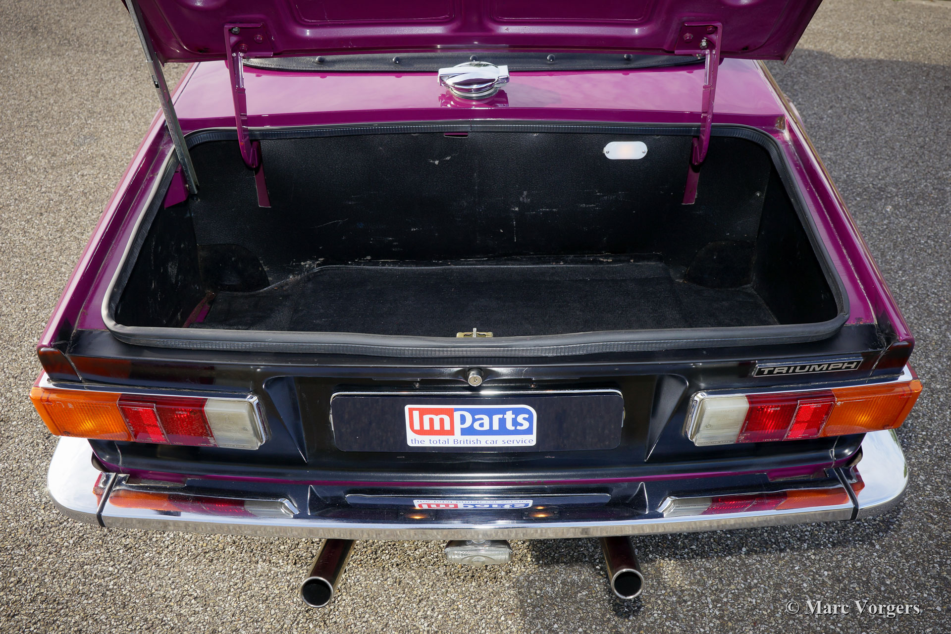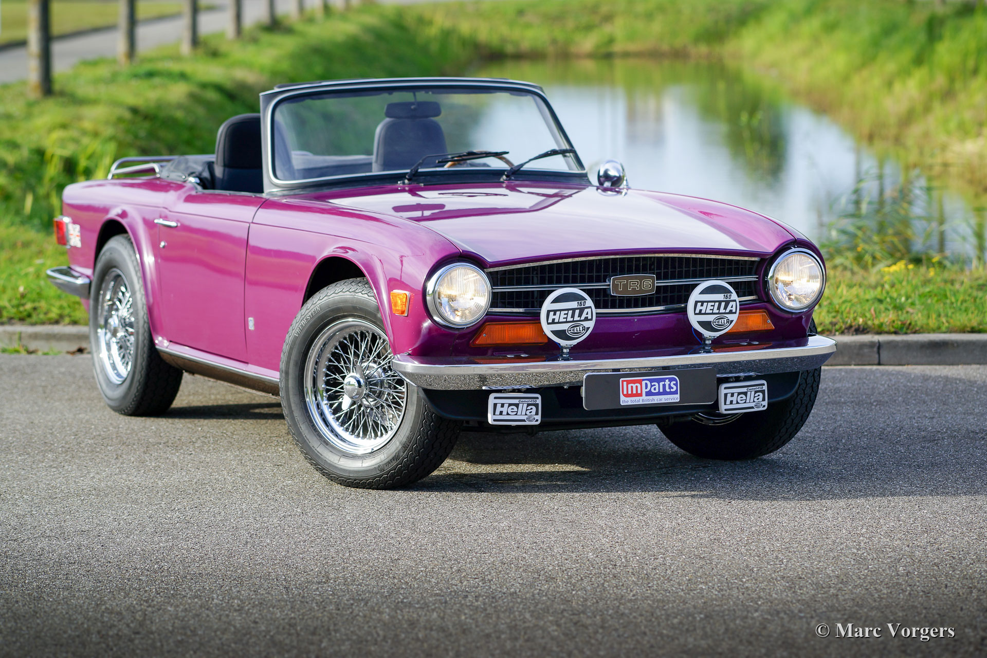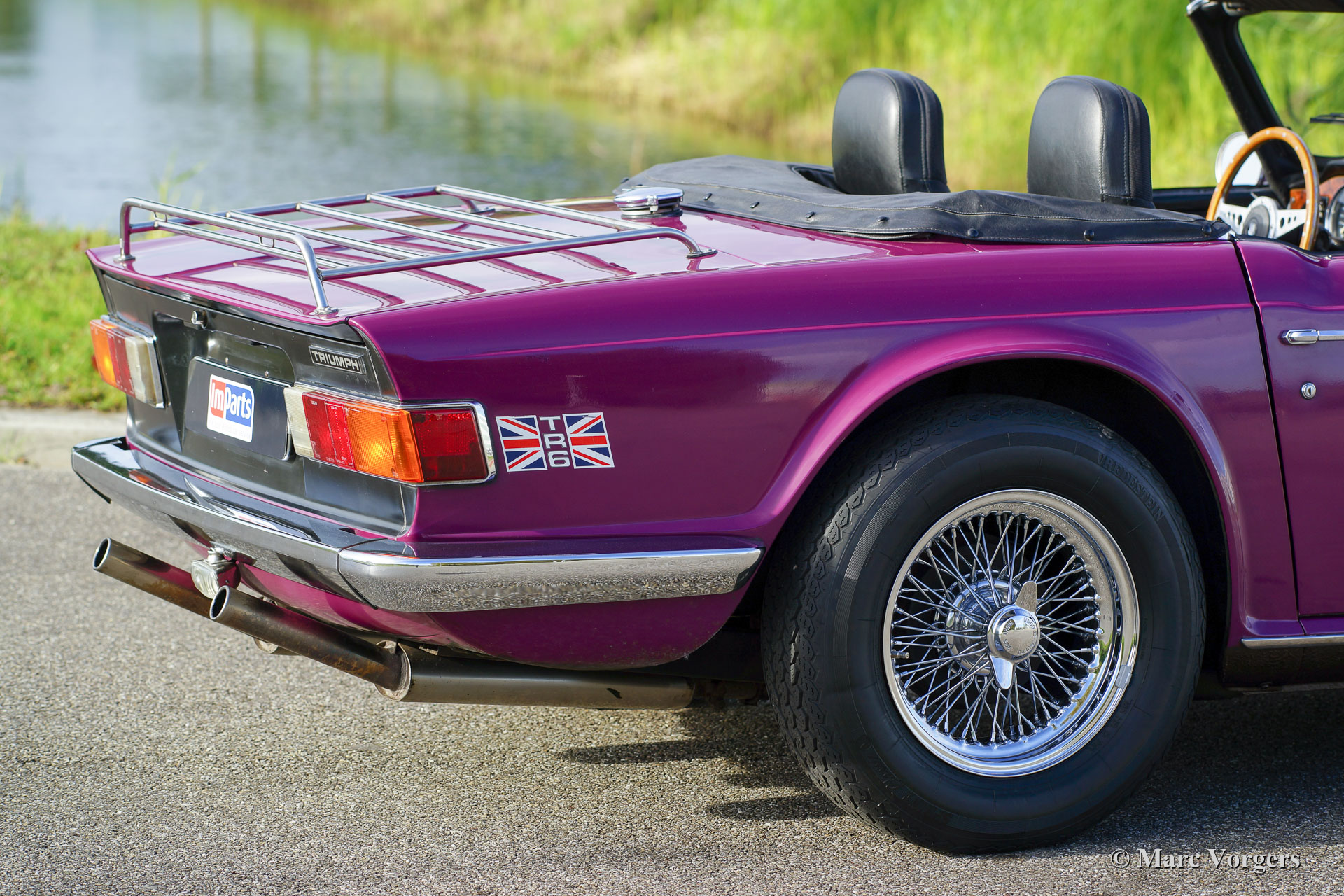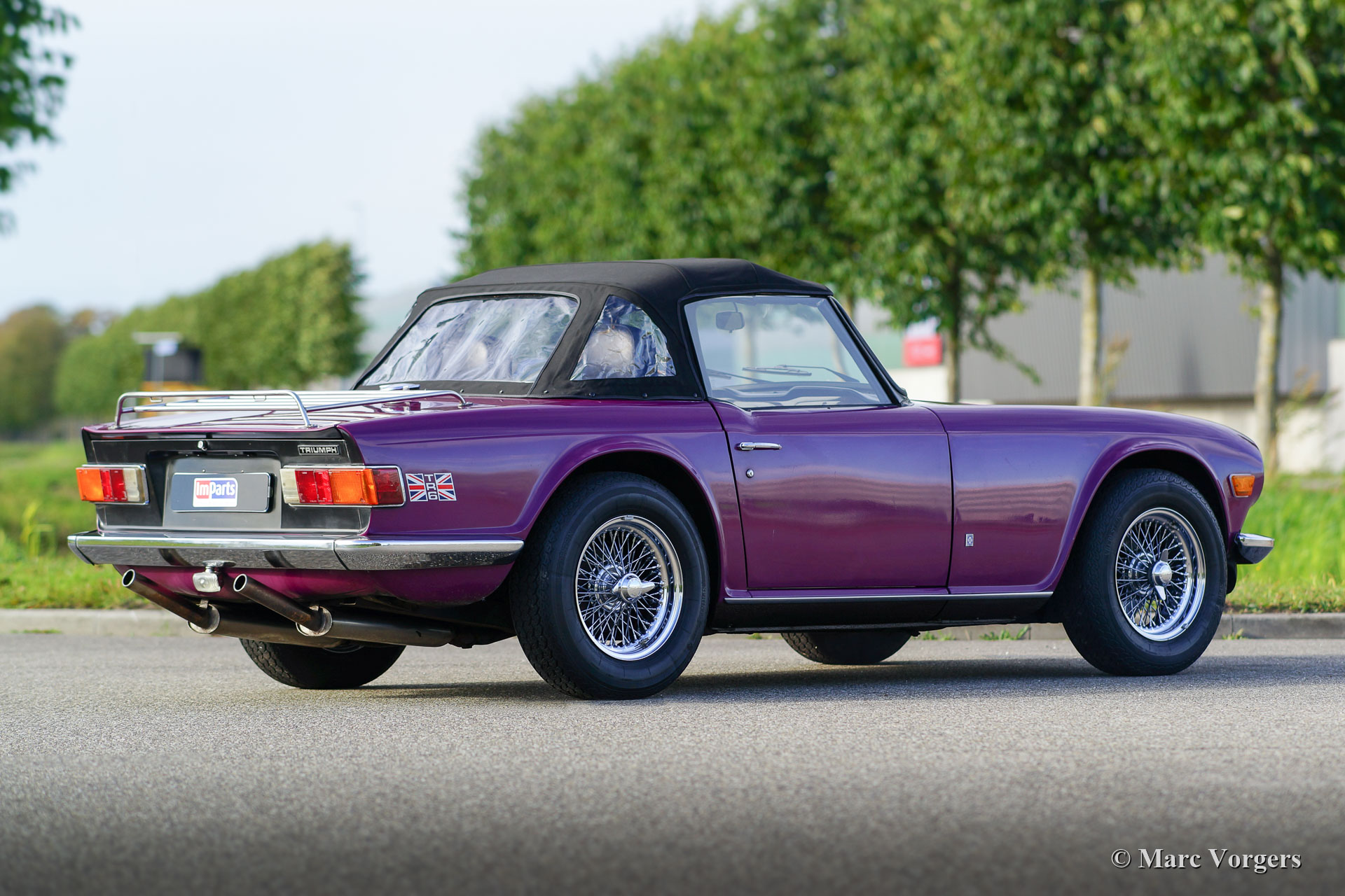 Triumph TR 6, year 1974. Colour Magenta combined with a black interior and a black mohair soft-top. This Triumph features the most extravert Triumph colour of the 1970s; you love it or you hate it, but the fabulously Karmann styled TR6 is one of the rare designs on which Magenta underlines its inner character! This fine Triumph TR6 is in very good condition and it is beautifully serviced and maintained over the years. The engine was overhauled and fitted with two S.U. carburettors and an aluminium rocker cover. The Stainless-Steel exhaust system produces a fantastic six-cylinder exhaust note! The high-back sports-seats with integrated head-rests are non-original but they are a perfect fit. Furthermore, this TR6 features overdrive, wide chrome wire wheels (fitted last year), additional Cibié fog and spot lamps at the front (with original covers), a wood rimmed steering wheel, a walnut veneer dashboard panel, an arm-rest with storage space, seat-belts, a black vinyl tonneau cover, 12V socket and a chrome luggage rack on the boot-lid. This is a perfectly driving and super complete Triumph TR6!