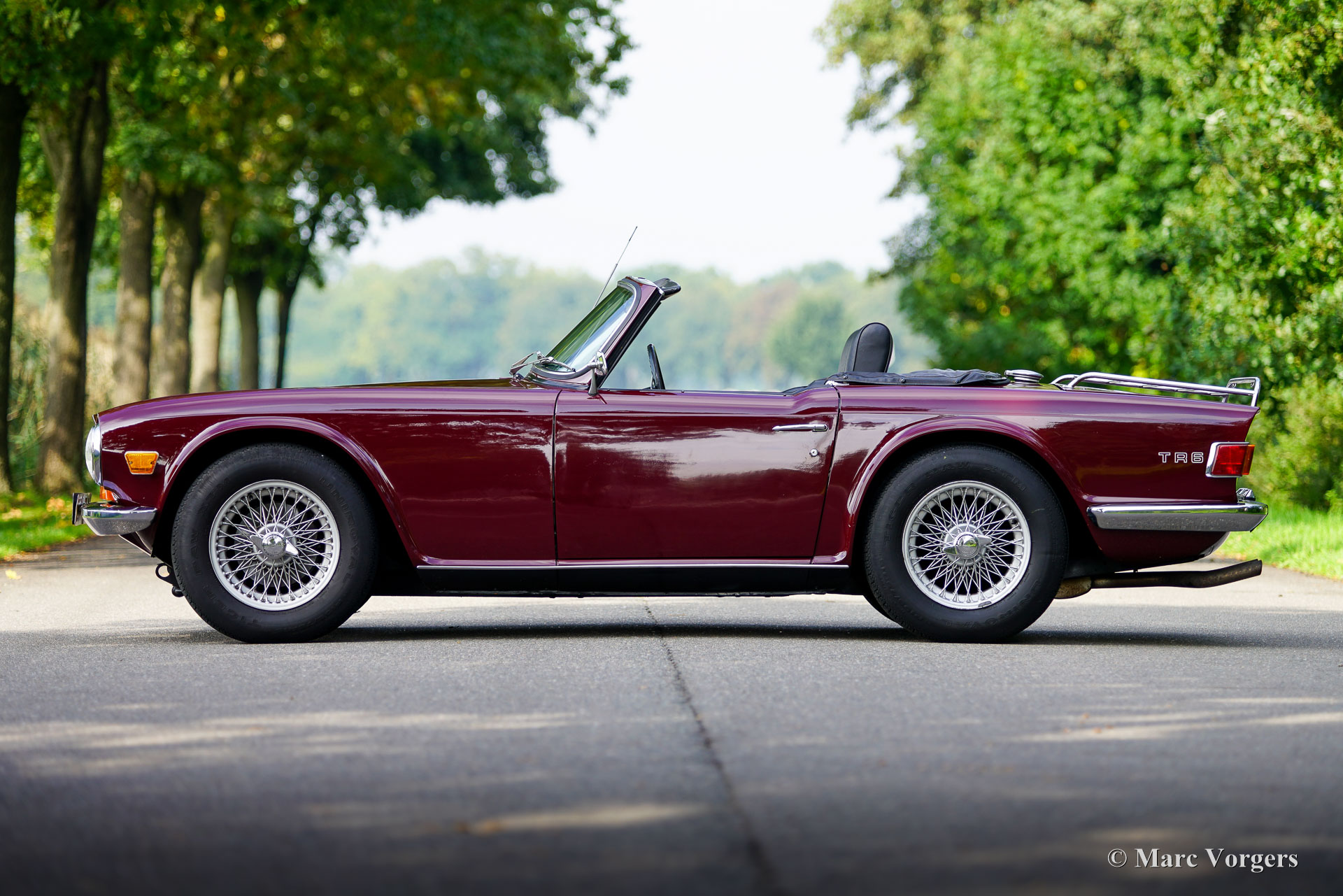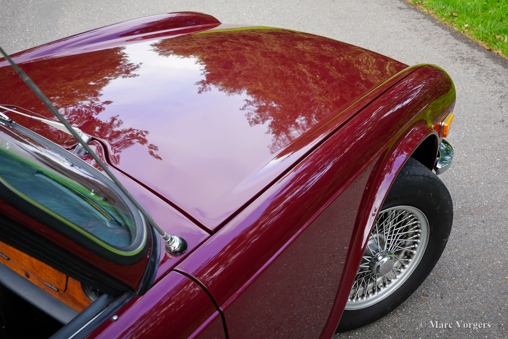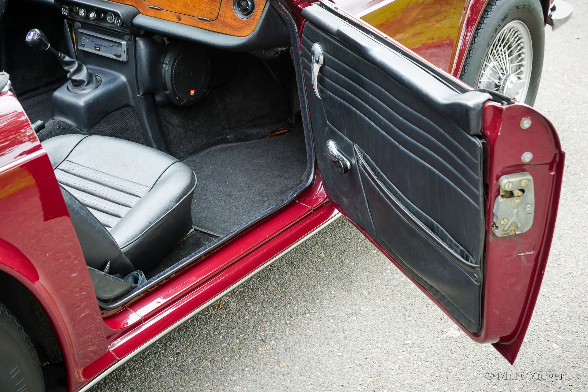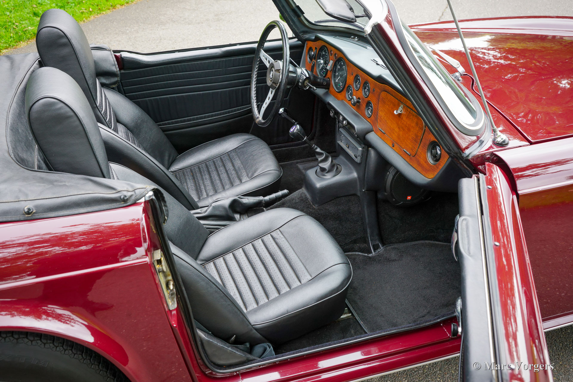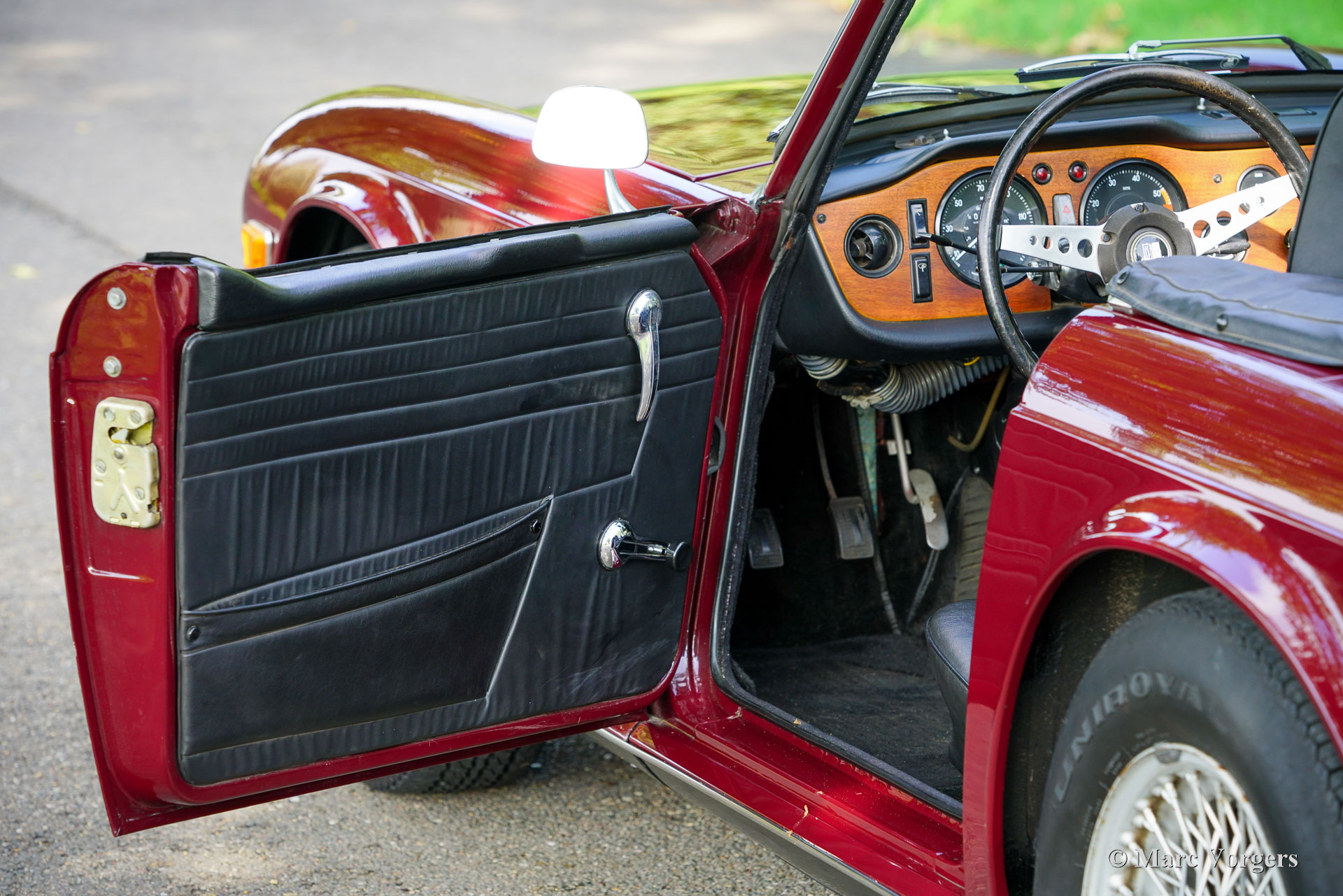 Triumph TR6, year 1969. Bodywork finished in dark red (Damson) combined with a black faux leather interior and a black mohair soft-top. This fantastic Triumph TR6 was sold new in the USA and imported to the Netherlands in 1999. The car has known only one caring owner ever since. This Triumph TR6 is a seldom seen early version still sporting unique details like the safety seats with the high headrests and the unique 3-spoke steering wheel with holes in the spokes. The headrests are foldable to make it possible to fit a tonneau cover. The car was fully repainted and given new upholstery and carpet in the past. SU carburettors were fitted, electronic ignition, and sports air-filters. The suspension was fitted with ‘road-spec’ polyurethane bushes. This magnificent early TR6 shows all the original details, it drives and sounds delightfully and is in a very good condition! Cars coming from long year caring active ownership are the best driver cars you can buy in our opinion. This wonderful example features the coveted overdrive option and silver metallic painted wire wheels with chrome ‘knock on’ wheel nuts and a chrome baggage rack. A British Motor Heritage certificate is also present. The Triumph TR6 is the British sports car that gives the most driving fun for its money, and it is practical and comfortable enough to be enjoyed for weekend road trips and ‘pan European’ holiday trips!