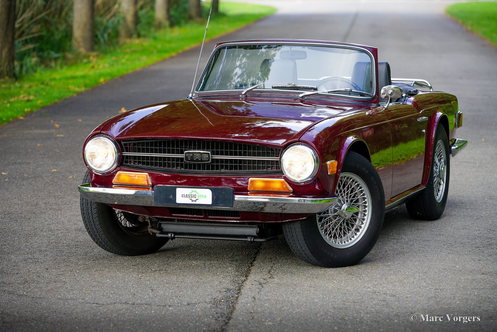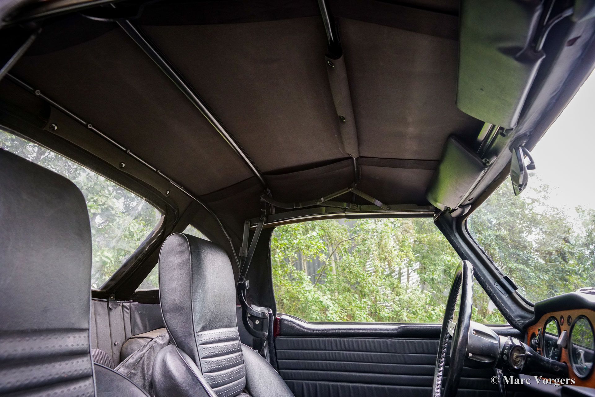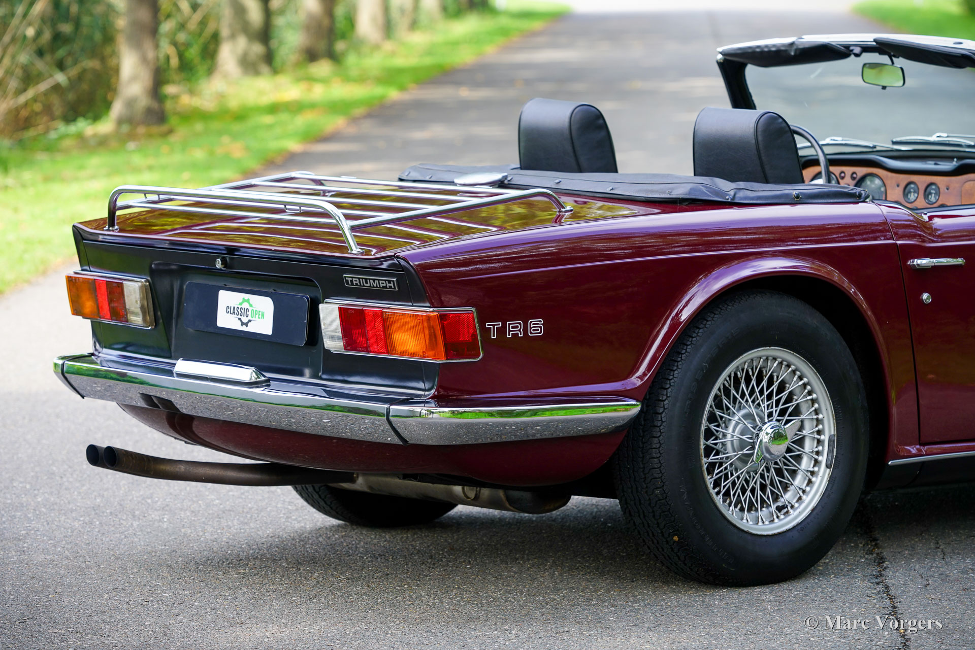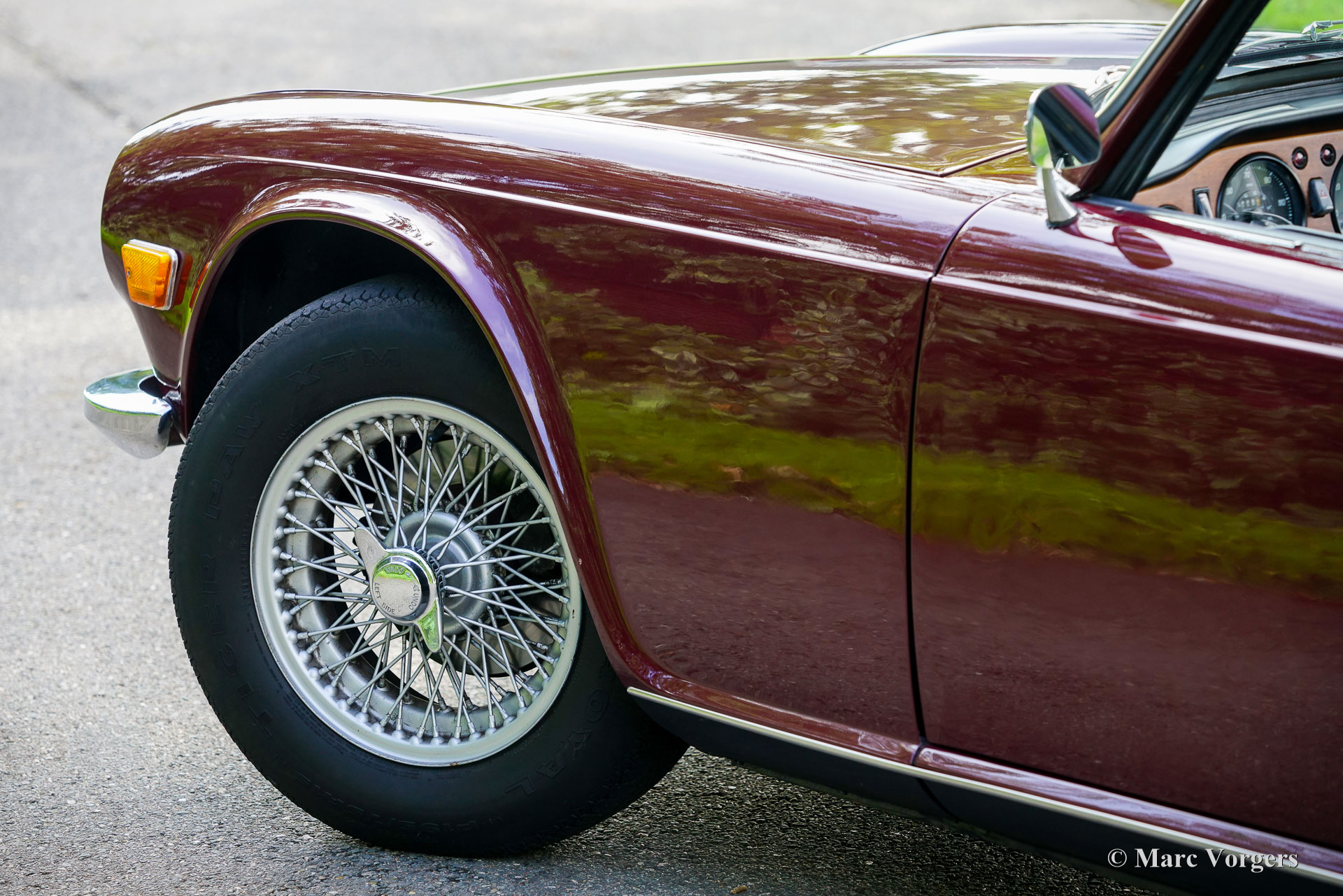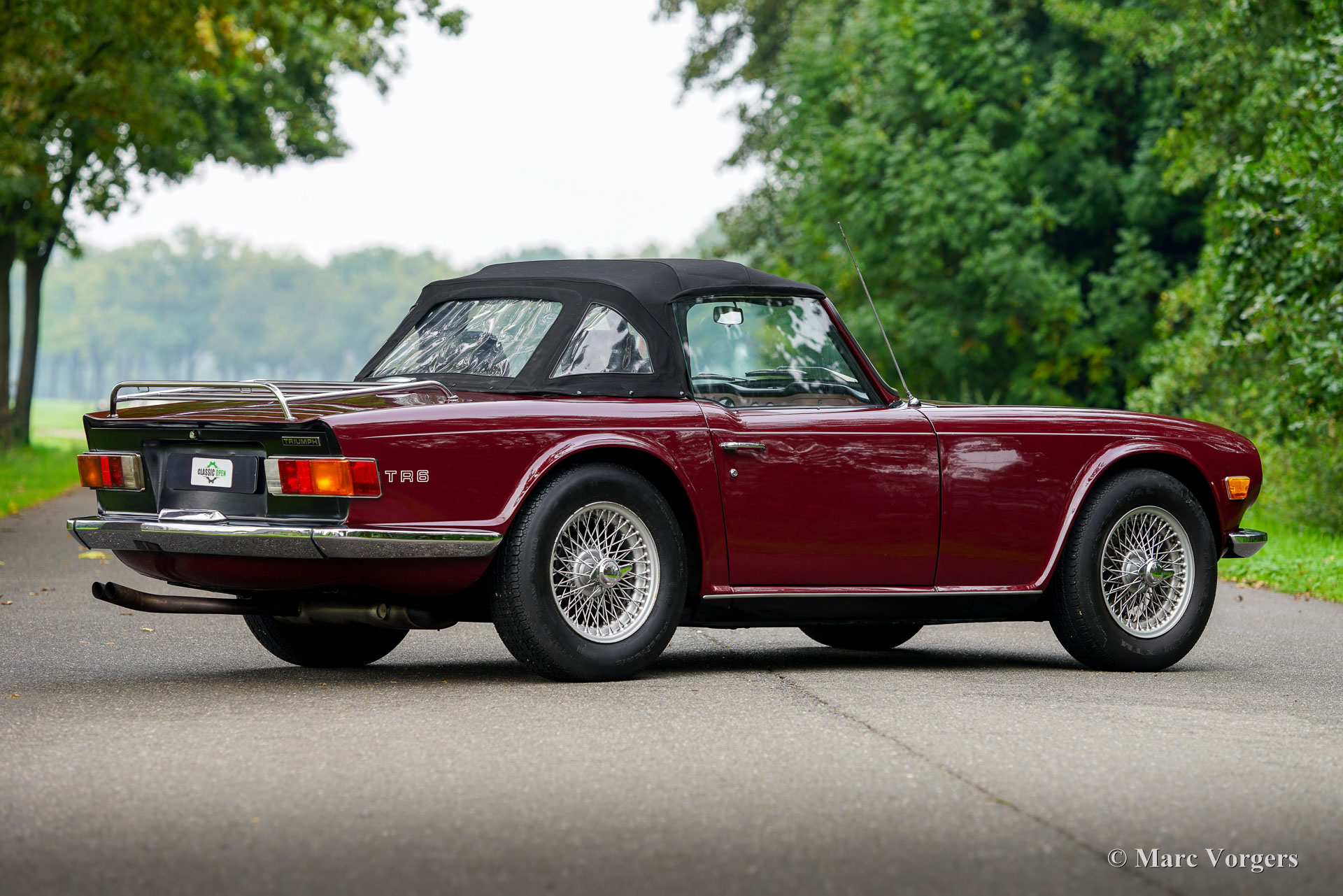 Triumph TR6, year 1969. Bodywork finished in dark red (Damson) combined with a black faux leather interior and a black mohair soft-top. This fantastic Triumph TR6 was sold new in the USA and imported to the Netherlands in 1999. The car has known only one caring owner ever since. This Triumph TR6 is a seldom seen early version still sporting unique details like the safety seats with the high headrests and the unique 3-spoke steering wheel with holes in the spokes. The headrests are foldable to make it possible to fit a tonneau cover. The car was fully repainted and given new upholstery and carpet in the past. SU carburettors were fitted, electronic ignition, and sports air-filters. The suspension was fitted with ‘road-spec’ polyurethane bushes. This magnificent early TR6 shows all the original details, it drives and sounds delightfully and is in a very good condition! Cars coming from long year caring active ownership are the best driver cars you can buy in our opinion. This wonderful example features the coveted overdrive option and silver metallic painted wire wheels with chrome ‘knock on’ wheel nuts and a chrome baggage rack. A British Motor Heritage certificate is also present. The Triumph TR6 is the British sports car that gives the most driving fun for its money, and it is practical and comfortable enough to be enjoyed for weekend road trips and ‘pan European’ holiday trips!