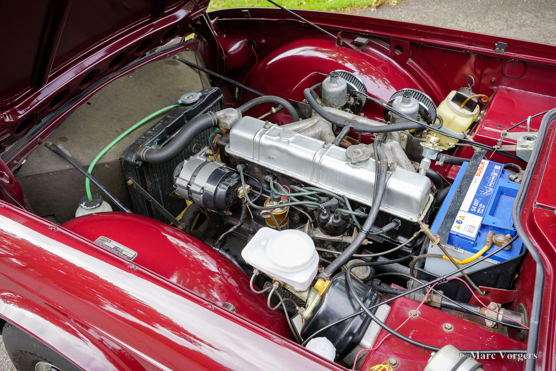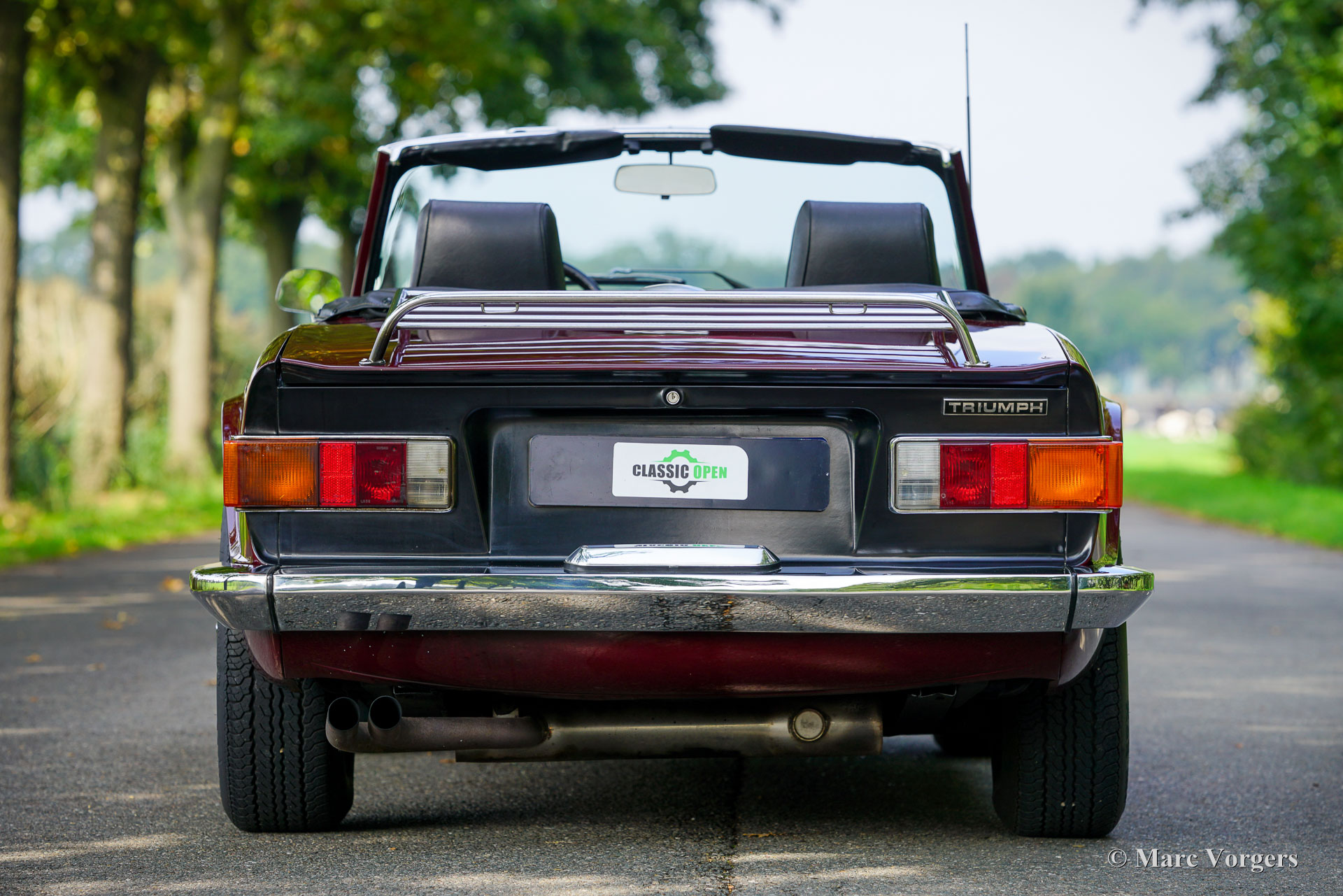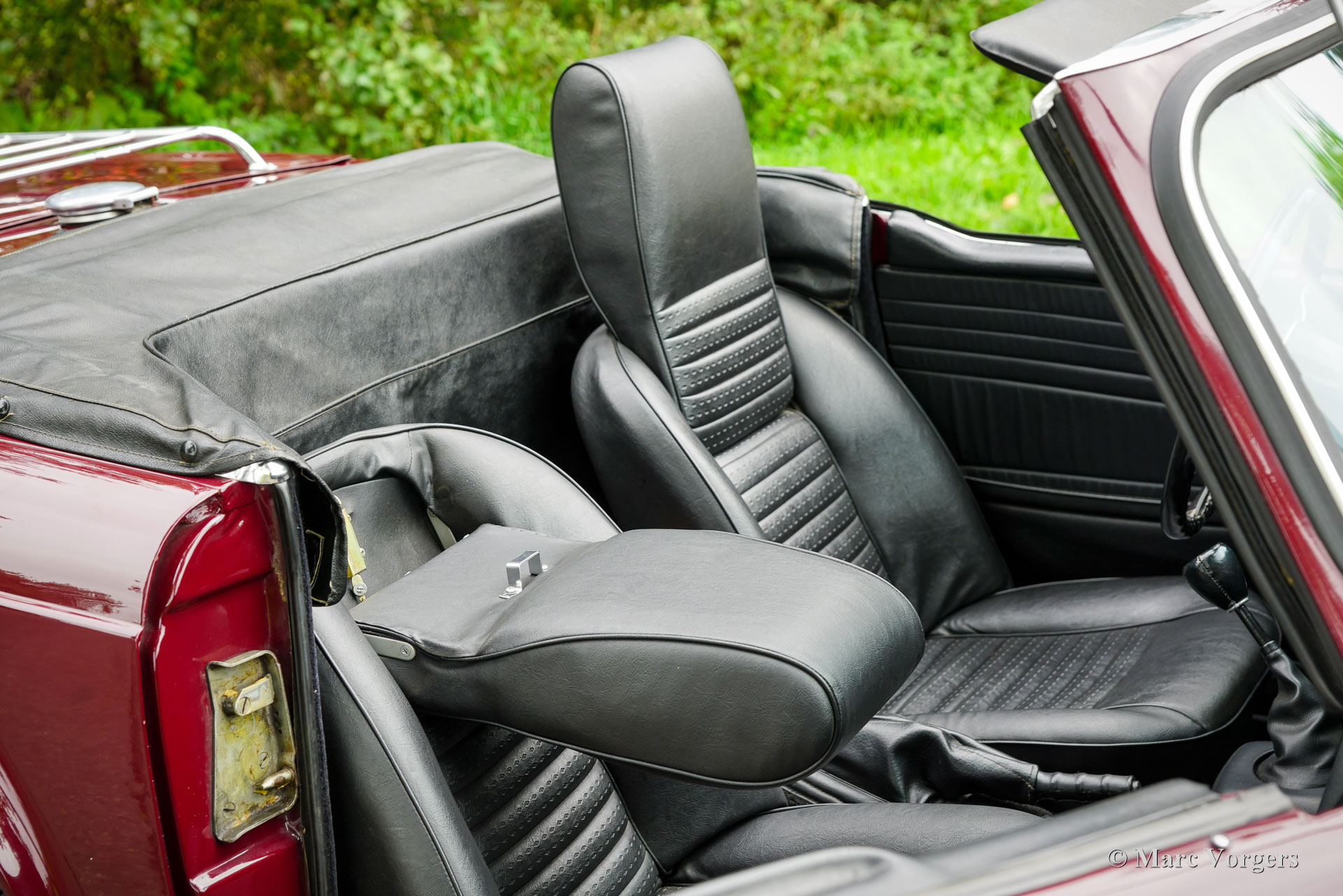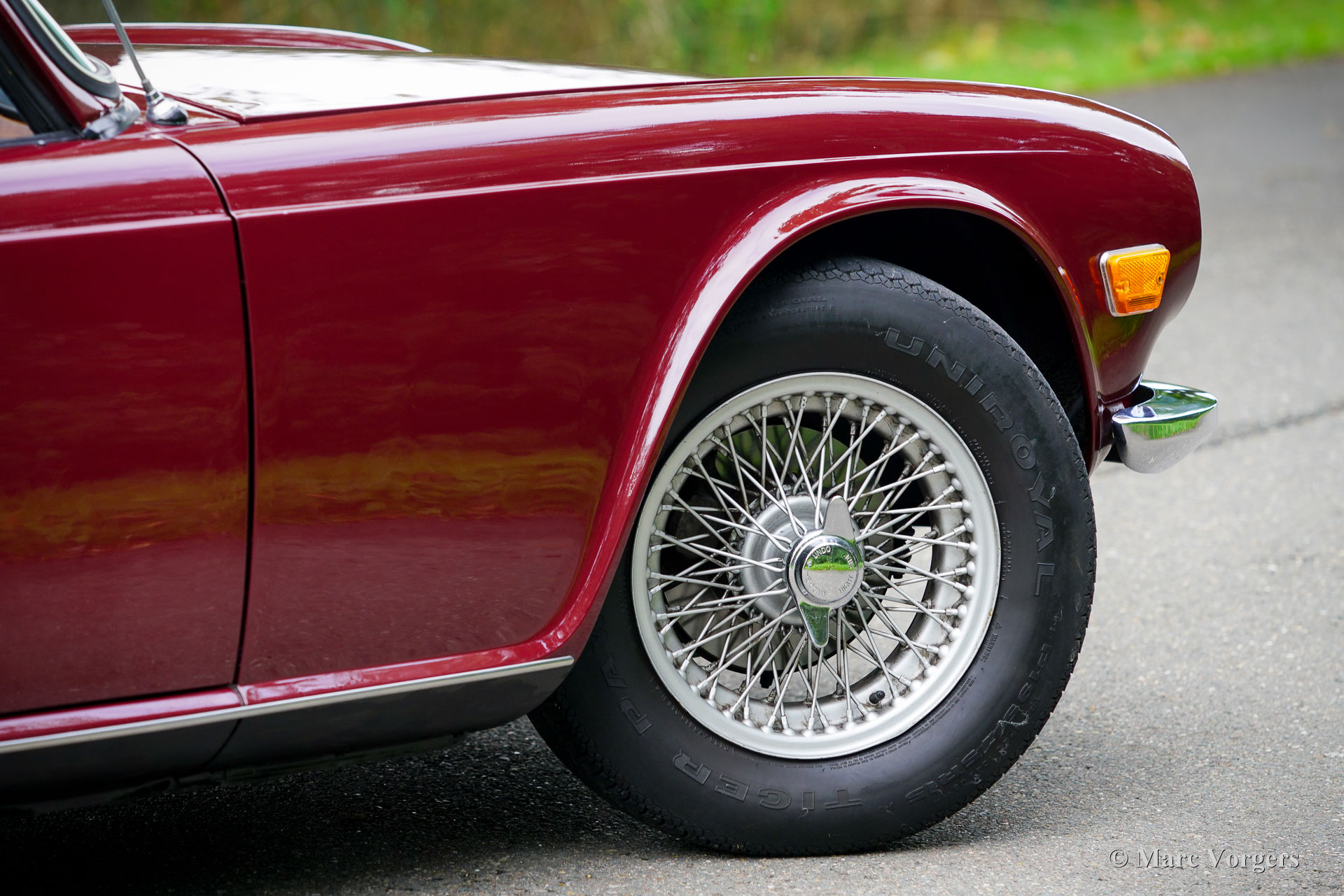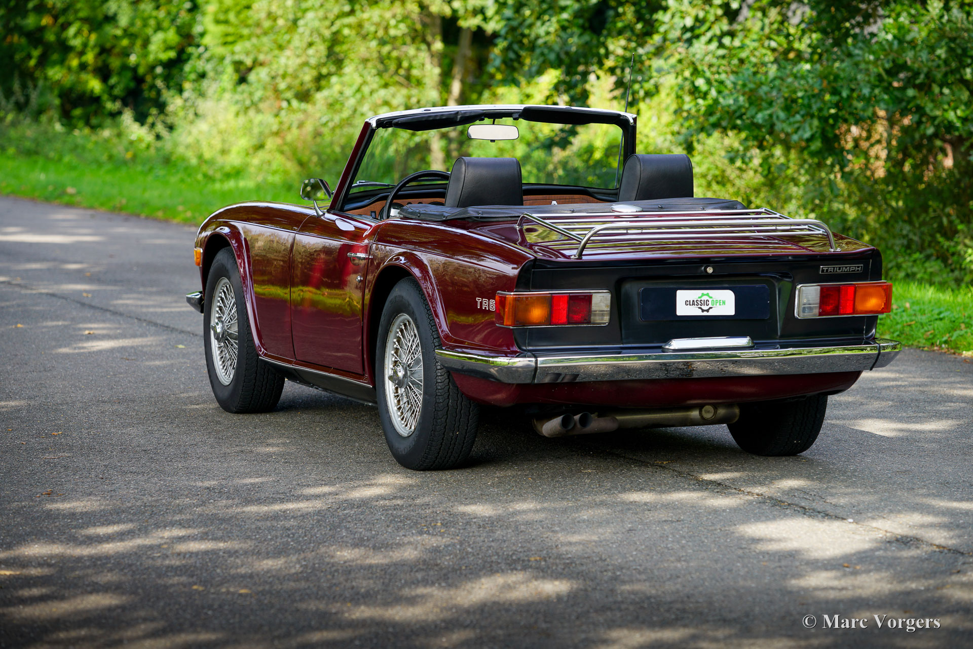 Triumph TR6, year 1969. Bodywork finished in dark red (Damson) combined with a black faux leather interior and a black mohair soft-top. This fantastic Triumph TR6 was sold new in the USA and imported to the Netherlands in 1999. The car has known only one caring owner ever since. This Triumph TR6 is a seldom seen early version still sporting unique details like the safety seats with the high headrests and the unique 3-spoke steering wheel with holes in the spokes. The headrests are foldable to make it possible to fit a tonneau cover. The car was fully repainted and given new upholstery and carpet in the past. SU carburettors were fitted, electronic ignition, and sports air-filters. The suspension was fitted with ‘road-spec’ polyurethane bushes. This magnificent early TR6 shows all the original details, it drives and sounds delightfully and is in a very good condition! Cars coming from long year caring active ownership are the best driver cars you can buy in our opinion. This wonderful example features the coveted overdrive option and silver metallic painted wire wheels with chrome ‘knock on’ wheel nuts and a chrome baggage rack. A British Motor Heritage certificate is also present. The Triumph TR6 is the British sports car that gives the most driving fun for its money, and it is practical and comfortable enough to be enjoyed for weekend road trips and ‘pan European’ holiday trips!