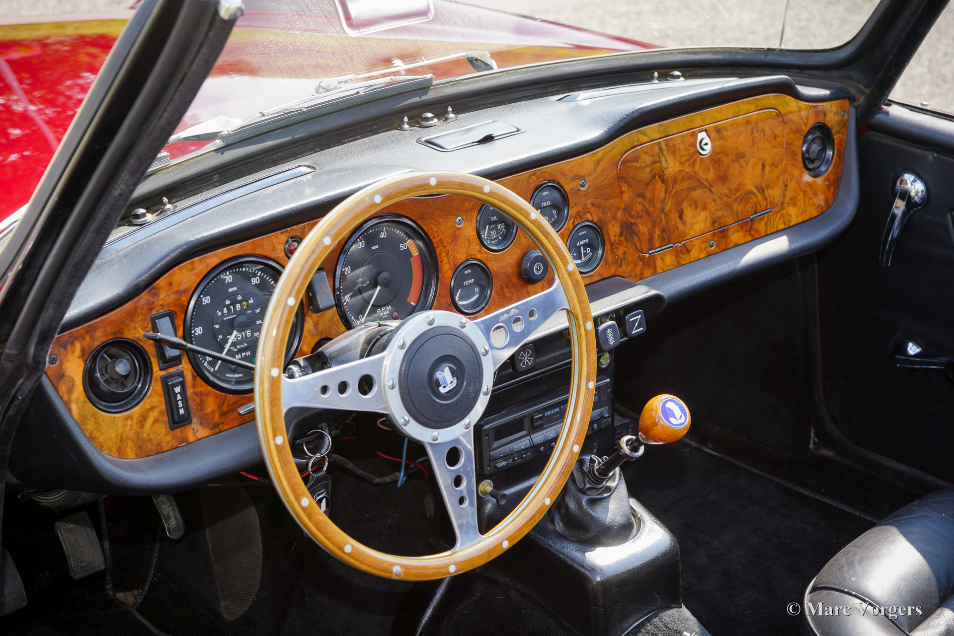 Triumph TR 6, year 1970. Colour dark red (Damson Red) combined with a black leather interior trimmed with black carpet. Black mohair soft-top and a black vinyl hood cover. This magnificent Triumph TR 6 was sold new in the United States. The car was imported to the Netherlands in 1991 and was cherished by one owner ever since. After arrival in the Netherlands the TR 6 was extensively and beautifully restored, a photo report of the restoration is present. During restoration the engine, gearbox, and overdrive were fully overhauled. This wonderful Triumph TR 6 is in a very good condition, and the car drives and sounds perfectly! Service and repairs were always done by an experienced mechanic. The Triumph TR 6 was produced from 1969 until 1976. The previous TR 4 and 5 Michelotti design was given a new front and rear styling by Karmann of Germany giving the TR 6 a modern and purposeful sporty appearance. This combined with the lusty straight six engine, it’s wonderful exhaust note, the comfy yet sporty interior made the TR 6 the most successful and popular TR to that date. This gorgeous example shows the wonderful original steel wheels and the seats with integrated head rests. The car is fitted with very good and expensive Michelin XVS tyres, special additional bodywork protectors on the bumpers, a MotoLita sports steering wheel with wood rim, a wood shift knob, an aluminium rocker cover, K&N sports air-filters, a Stainless Steel 6 in 1 sports exhaust, S.U. carburettors, and electronic ignition. This TR 6 is a very desirable driver car in a very good condition! This fine British sports car will bring a large and lasting grin to the face of the true enthusiast!