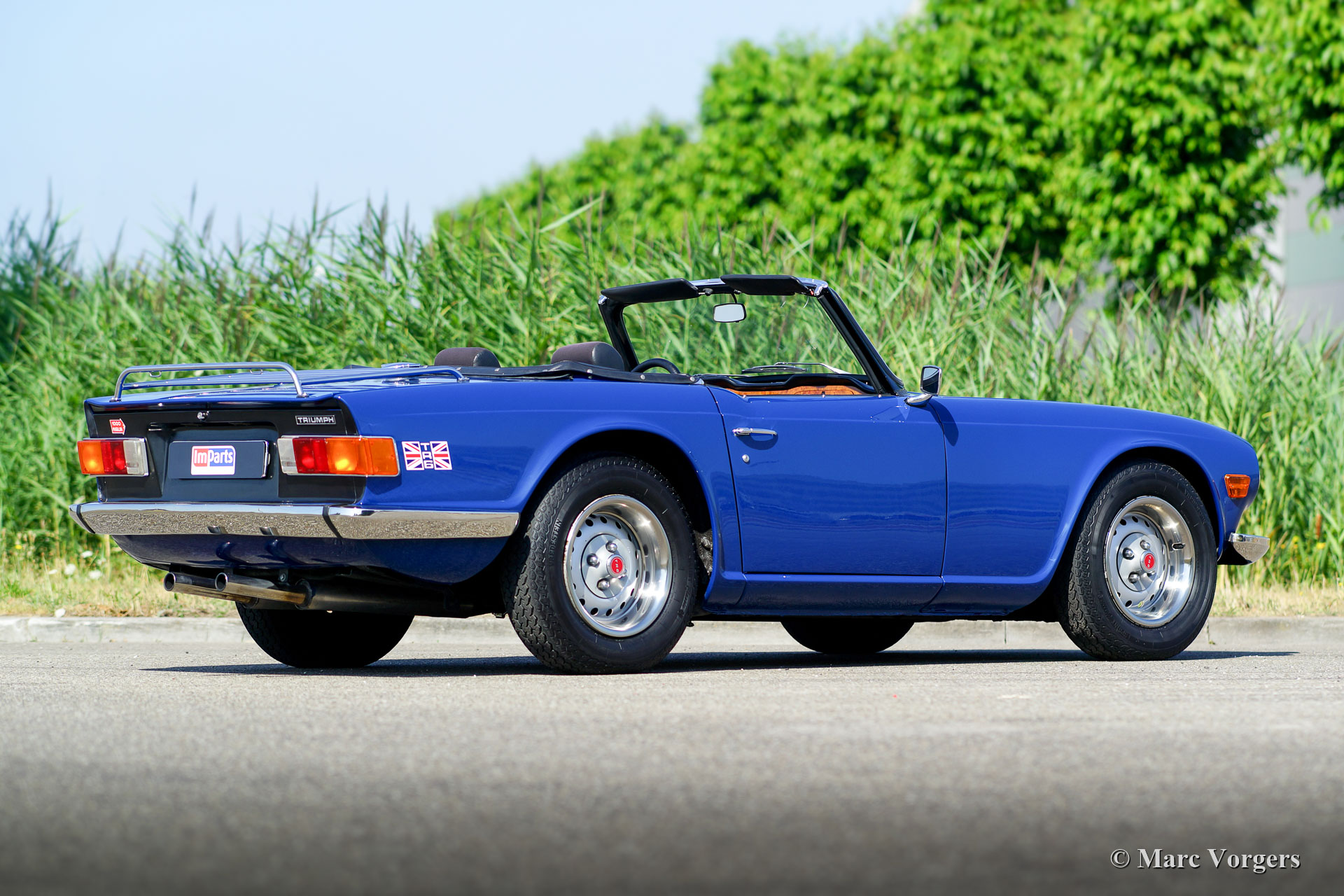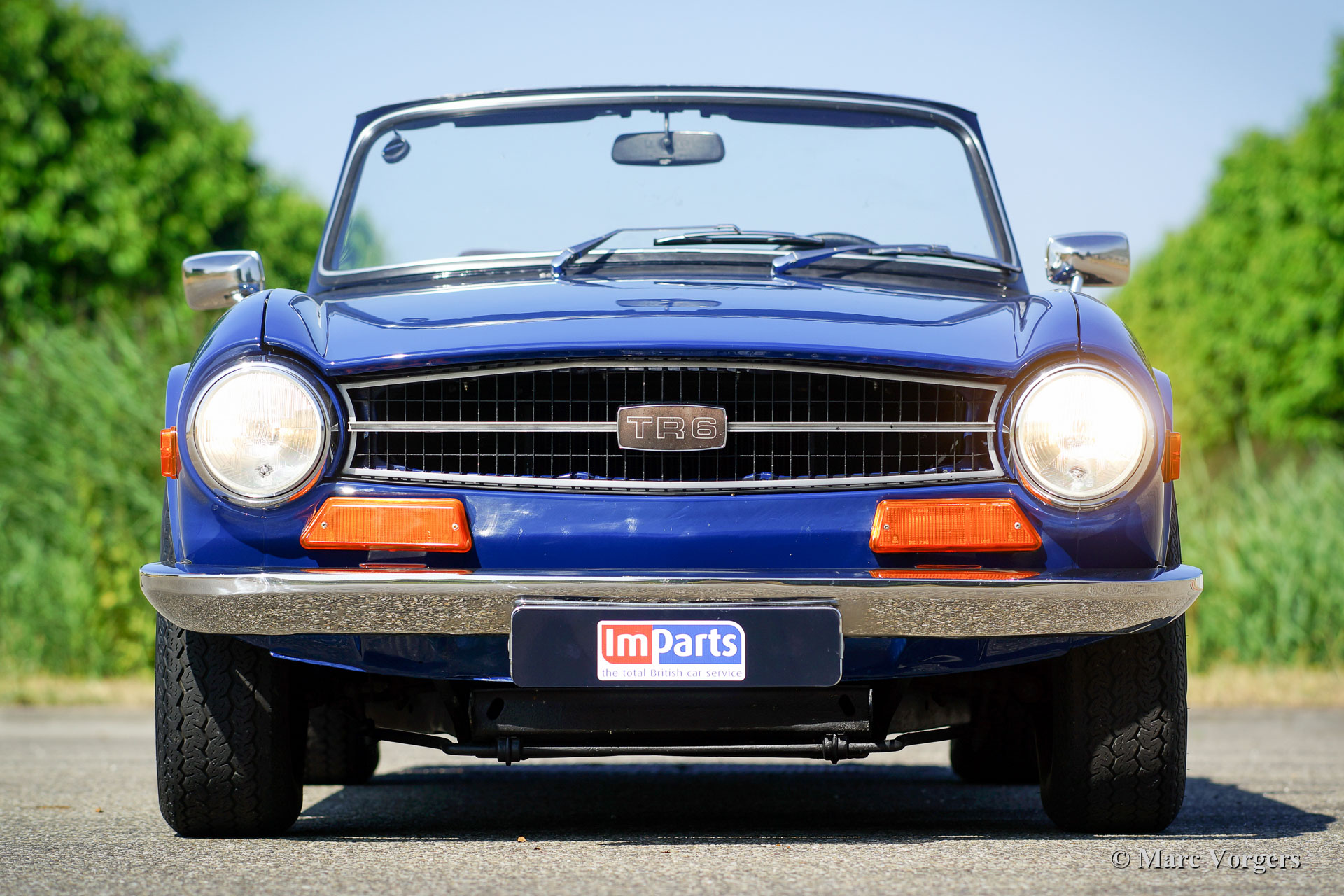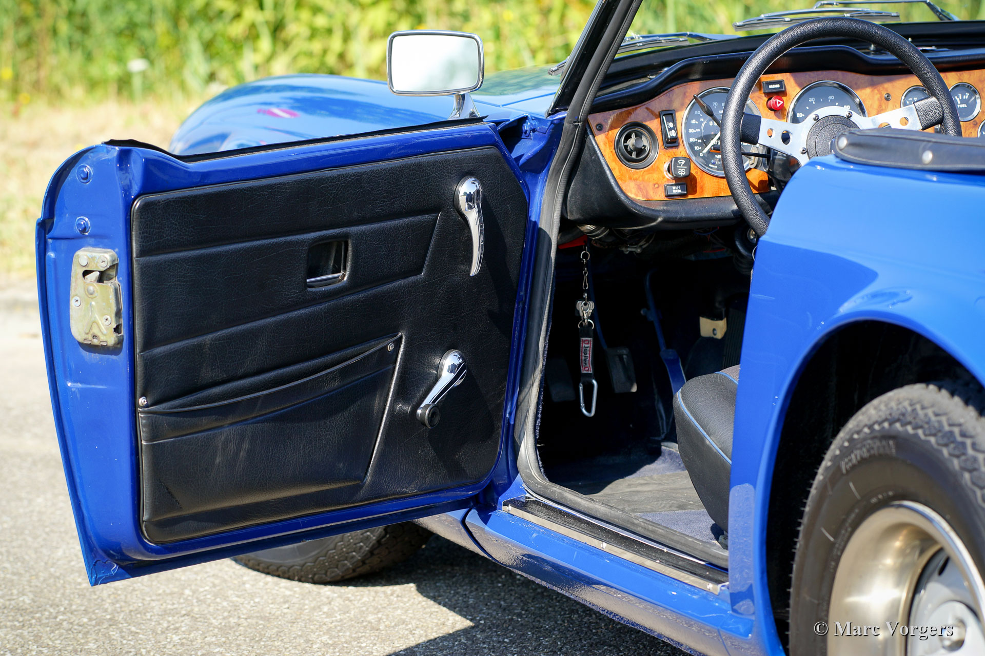 Triumph TR6, year 1974. Colour Delft Blue with a black leathercloth/ cloth interior and black carpet. Black mohair soft-top and hood cover. This fantastic Triumph TR6 was extensively restored in the past, the car is in a very good condition and the car drives superbly! The seats were upholstered with cloth seat centres for more comfort in hot weather conditions. The wood dashboard with the many gauges is a hallmark of the TR4 – TR6 range, it is one of the finest cockpits you will ever find in a classic sports car! This TR6 features a tuned 2.5 litre straight-six engine, the engine revs-up and pulls greedily! The engine is fitted with new S.U. carburettors and a Stainless-Steel sports exhaust. Furthermore, this TR6 is fitted with overdrive, new Stainless-Steel bumpers, Halogen head-lamps, electronic 123 ignition, an automatic electric cooling-fan, a mains-switch and a chrome baggage rack.