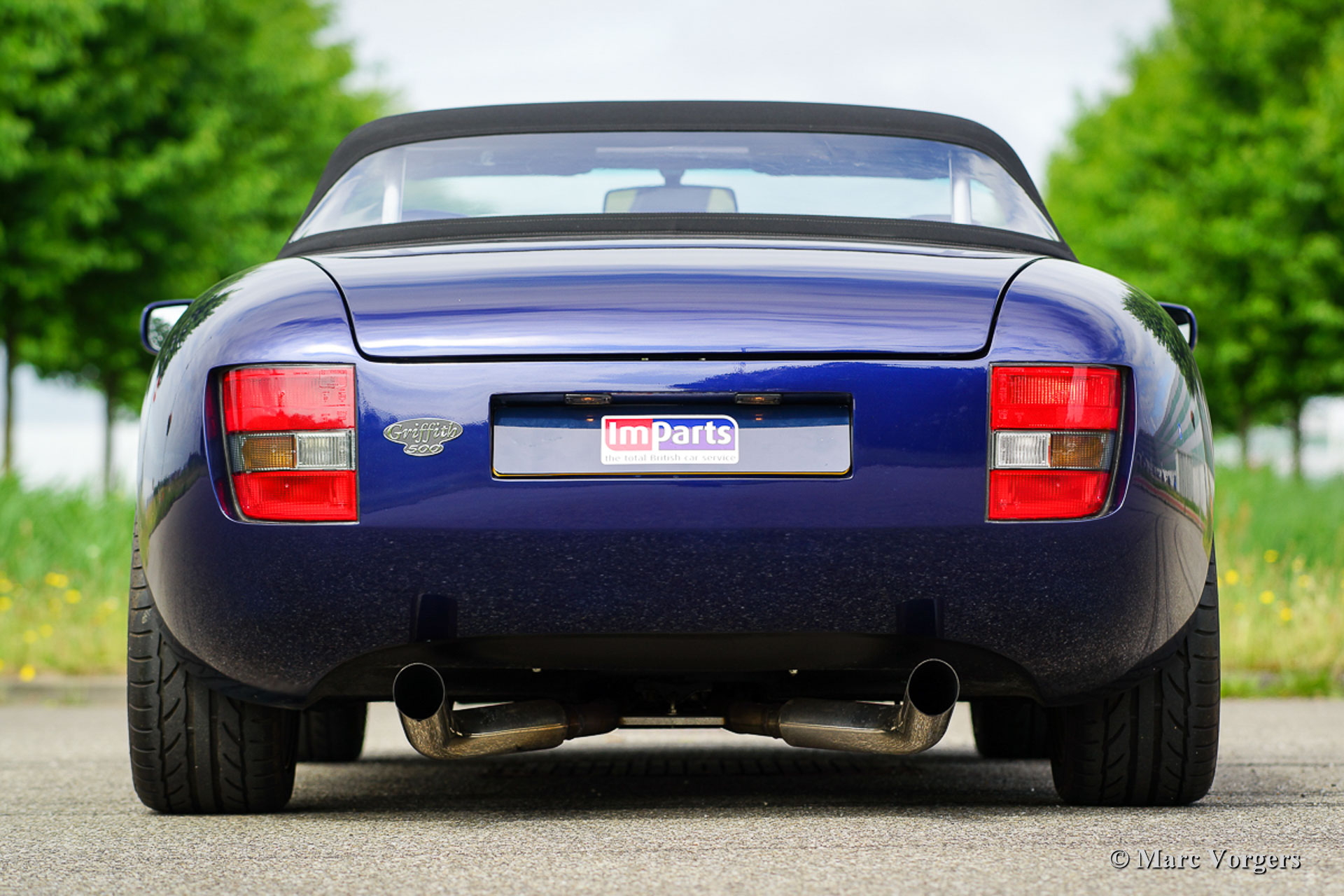 TVR Griffith 500, year 1999. Colour blue metallic with a blue leather interior. This magnificent TVR Griffith is a rare and sought after ‘500’ model fitted with the most powerful 340 bhp 5 Litre V8 engine. From new the car has driven only 45.000 kilometres. This TVR is in superb original condition and the car drives perfectly. The Griffith offers a true sports car driving experience and looks, combined with a beautiful and comfortable / sporty interior. The roof top is a unique TVR design; it consists of a foldable ‘targa’ part and a detachable roof-panel which fits snugly in the boot. This is a top-specimen!
