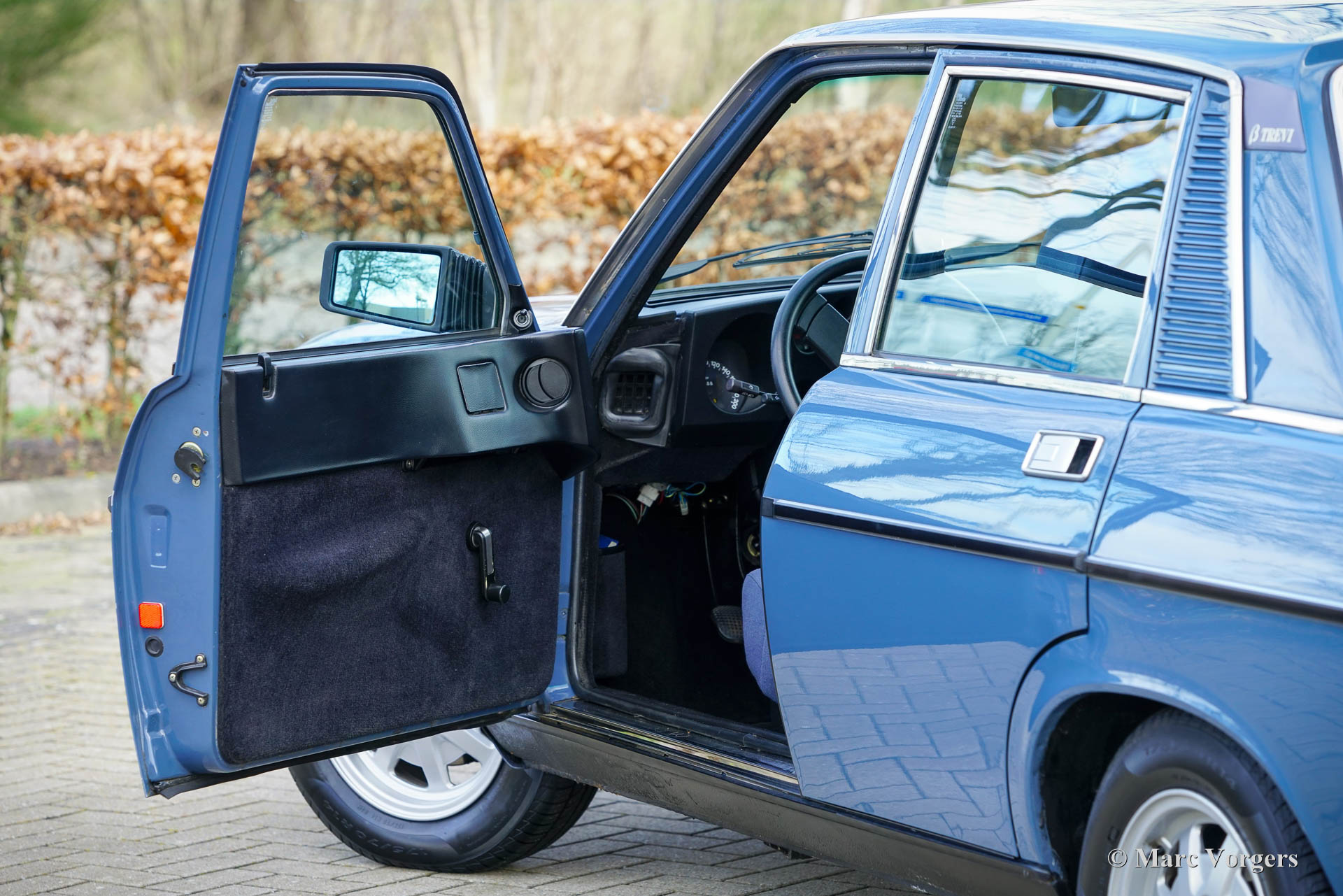 Lancia Beta Trevi 1600, year 1982. Chassis number ZLA828DB00923593, engine number FF2VS62*4371507*. Colour blue (Azzurro Antibes) combined with a blue cloth interior trimmed with black carpet and blue head lining. This rare Lancia Beta Trevi from the first series was sold new in Italy, and it was imported to the Netherlands by Montagna d’Oro in the year 2017 (with the odometer reading 14.292 km). Ever since, the car has known only one caring owner who has cherished and (had) serviced this super original car perfectly! This Beta Trevi is a fantastic time capsule in very good to excellent original condition! The odometer reads 26.367 kilometres. Only the paint on the front valance and the pedal rubbers disclose that the car has driven 126.367 from new. The car shows only the slightest signs of previous use. The cloth interior is sublime, as is the original carpet. The bodywork and the paint are in a very good and wonderful condition. The engine compartment and the boot look pristine! It will be hard to find a nicer example! The Lancia Beta Trevi is the ‘three-box’ version of the Beta Berlina/saloon featuring a separate boot. The ‘TREVI’ name comes from the Italian “TRE VOLUMI”. Designer Mario Bellini gave the Lancia Beta Trevi a completely new designed roof and rear side. Mechanically the car was identical to the Berlina/saloon. The interior is a ‘masterclass’ of modern 1980s Italian car interior design with many original form and function solutions. The Lancia Beta Trevi is a rare car, only 12.836 1600 models were built. This is a wonderful and super original example for the true enthusiast, try to find a nicer one!