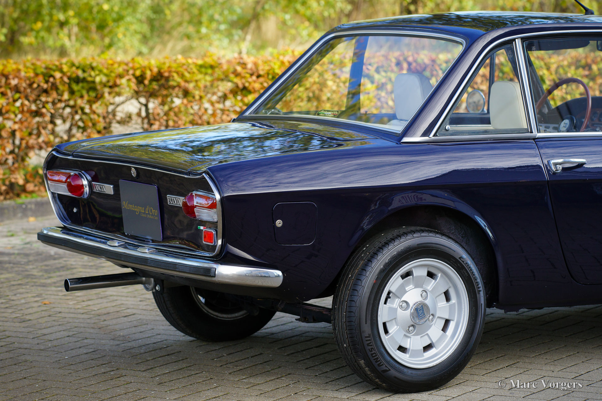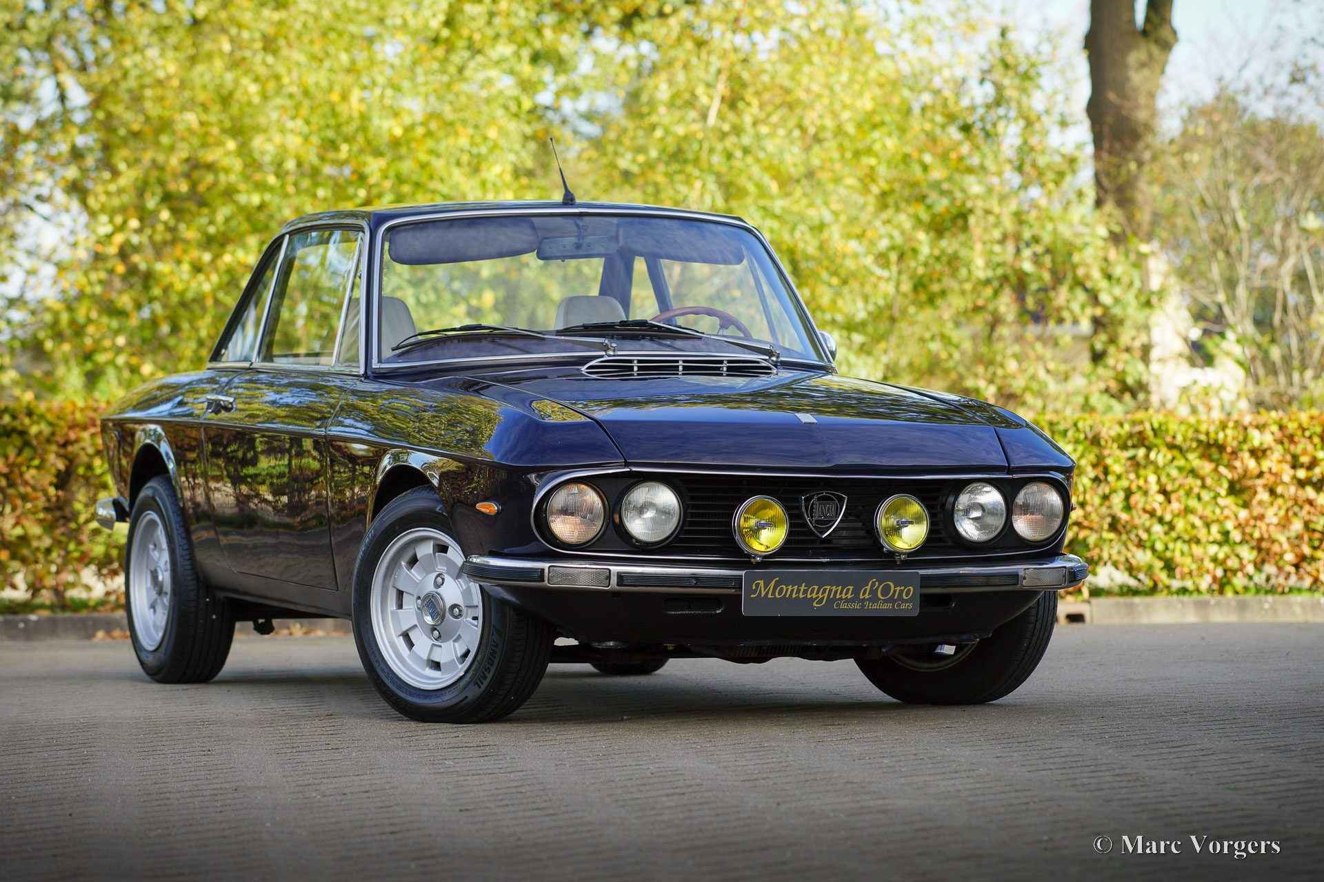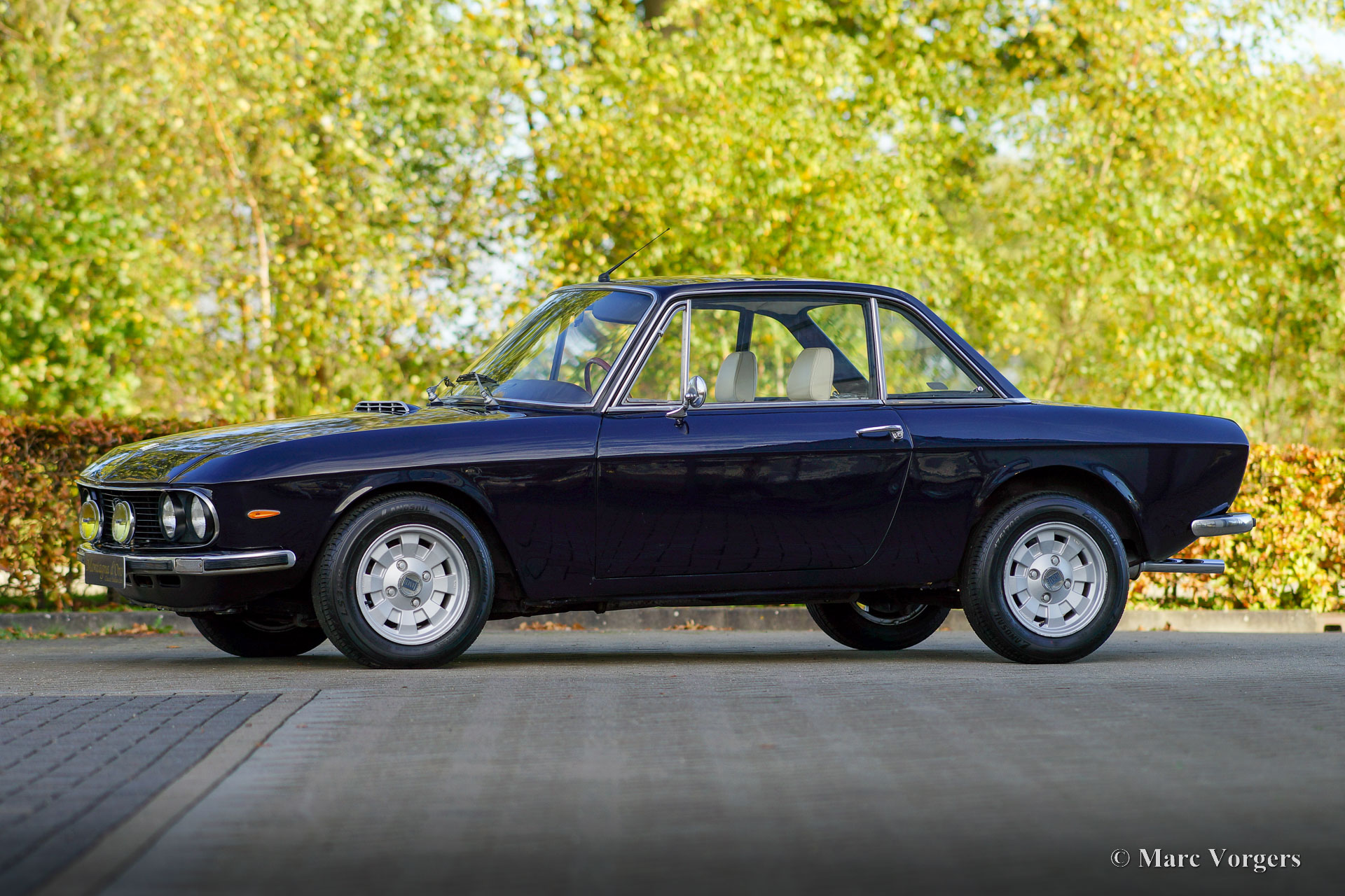 Lancia Fulvia Coupé 1.3 S (3rd series), 1976. Colour dark blue combined with a crème leather interior, light beige vinyl door-trim, and black carpet. This beautiful Lancia Fulvia coupé was sold new in Italy. The car was recently imported from Italy by Montagna d’Oro. The series 3 Fulvia was presented in 1973, and it can be distinguished by the black grille. The interior and instrumentation had received some upgrades over the previous model, but performance figures stayed the same. This very handsome coupe is in a good driver condition with some sighs of use and age to the paint and bodywork. The interior is in a very good condition, and the seats were newly upholstered with leather. The car drives and handles delightfully, and the V4 engine runs beautifully.