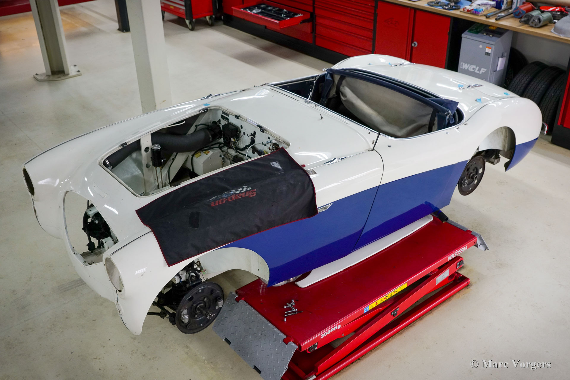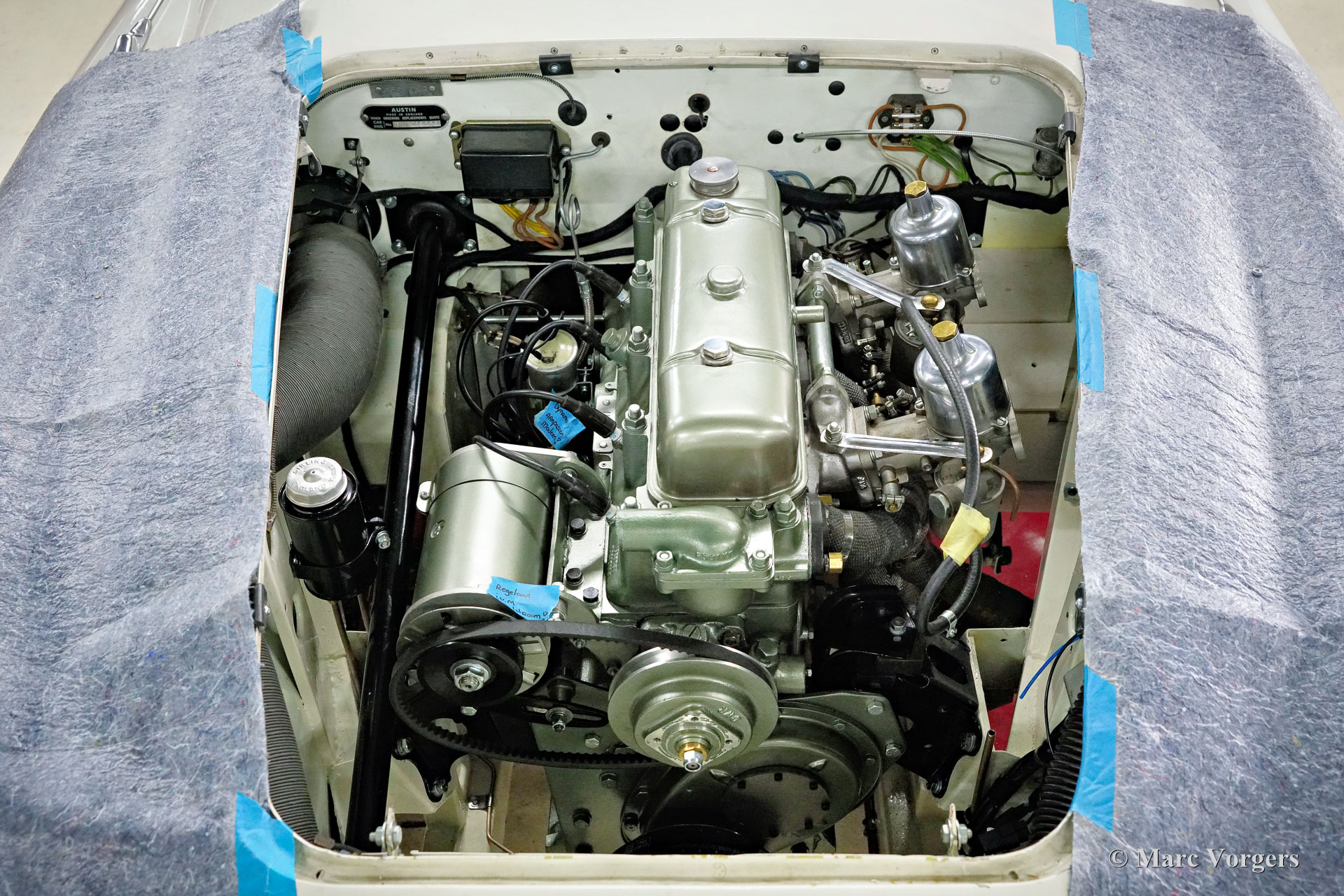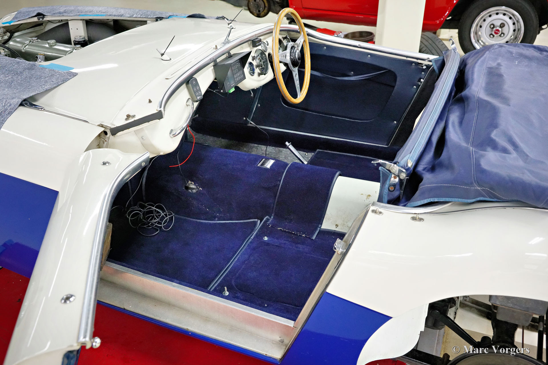 The former Healey models were more Spartan and featured fully detachable soft tops with separate side screens which could be stowed away in the booth.