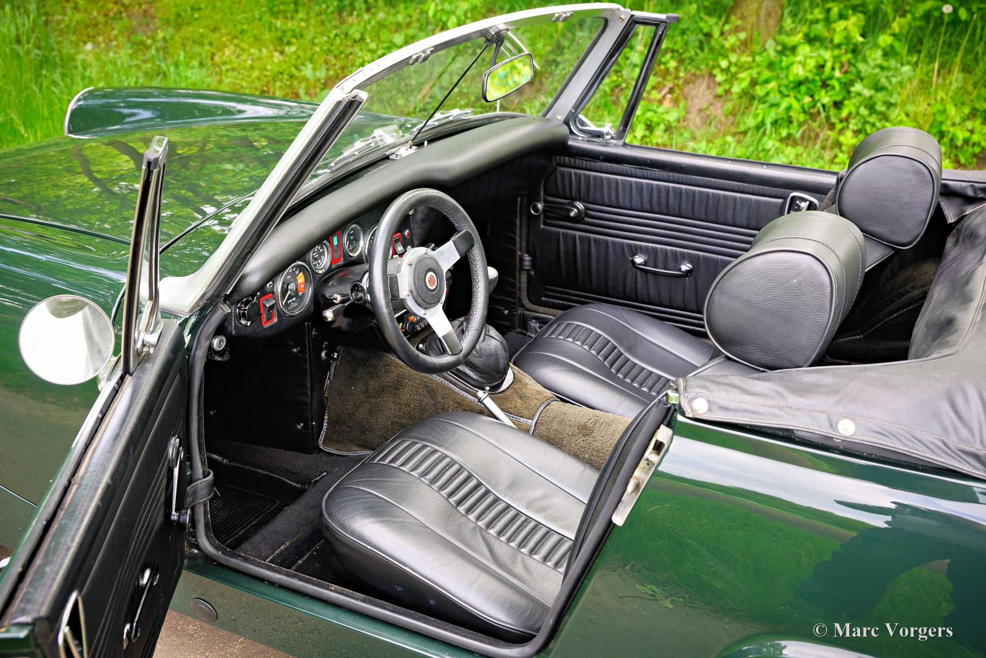 MG Midget MK III, year 1970 (first registration 1 July 1970). Colour British Racing Green combined with a black leatherette interior and anthracite coloured carpet. Black vinyl hood and hood cover. This delightful MG Midget MK III “split bumper” model was sold new in Germany and imported to the Netherlands in May 2001. Over the last 23 years the car has known five enthusiast owners. The last owner regretfully damaged the bodywork in a moment of inattention. The car was purchased by S2 Classic Cars, in 2023 the sheet metal was repaired, and the body was restored in our workshop. The car was repainted in the original colour. Furthermore, the car was brought up to date (inclusive the fitment of a new rear axle) and extensively serviced. The 62 bhp 1275 cc MG A-series engine runs beautifully, and the exhaust note is sporty but never tiring. The compact interior offers ample space for a driver of up to 6 feet (185 cm) tall. The car is fitted with Minilite style alloy wheels sporting dark grey metallic painted centres and spokes, original headrests, a sports steering wheel with leather rim, a radio console with period correct radio and speaker, K&N sports air-filters, and an aluminium rocker cover. This MG Midget looks wonderful, and it drives delightfully. A wonderful find for the person or couple loving the British drive- and lifestyle!