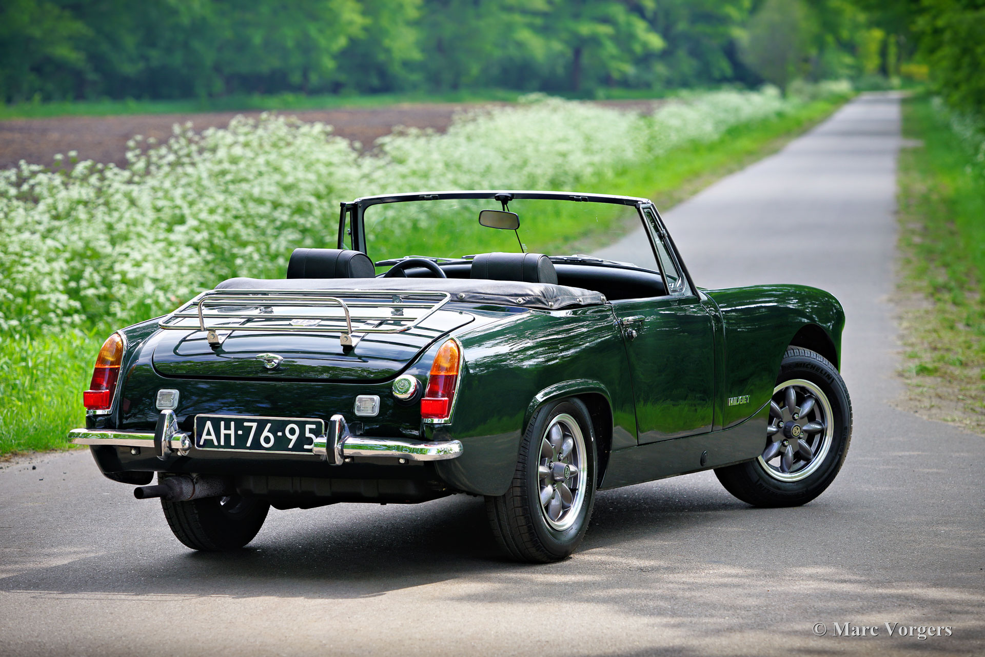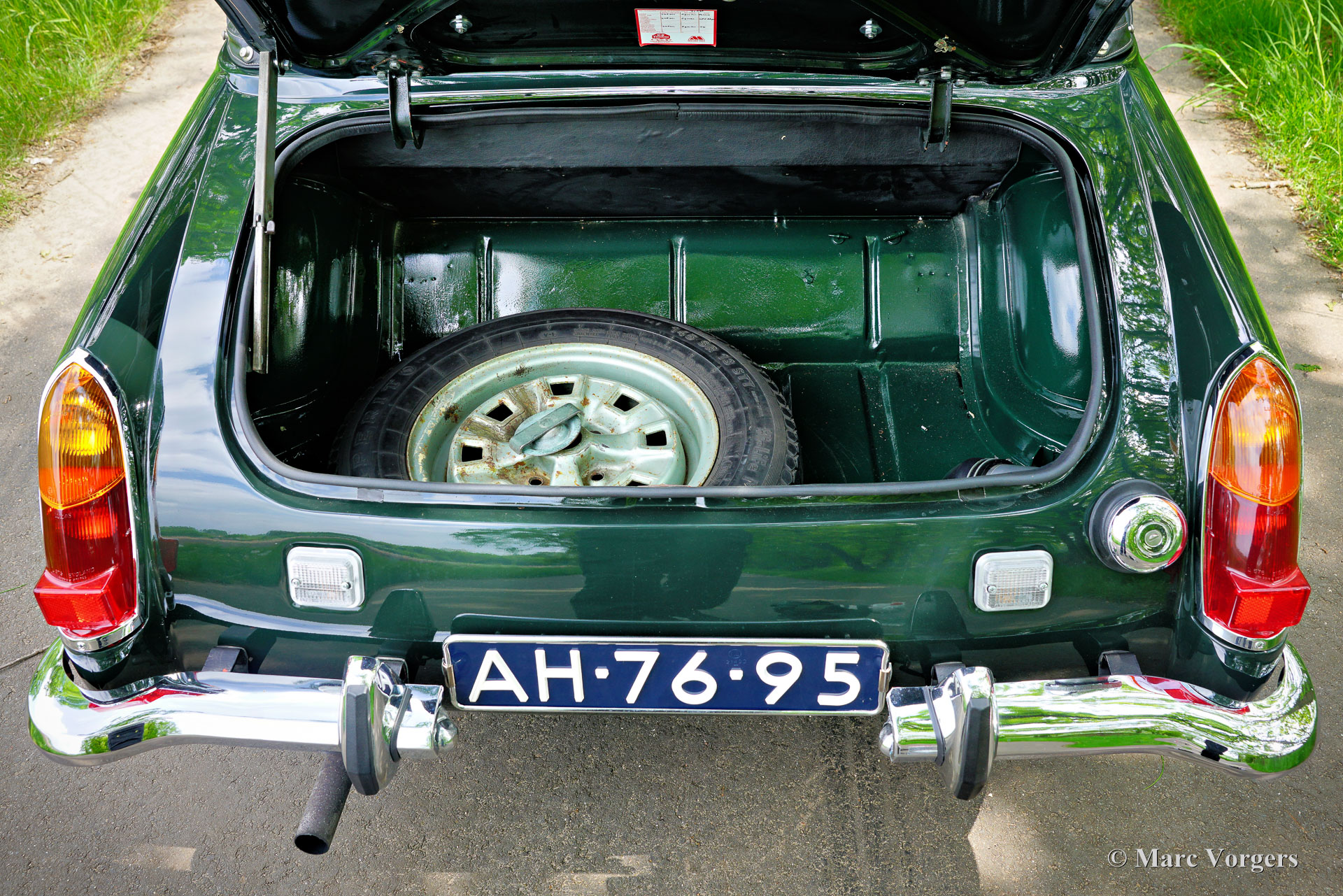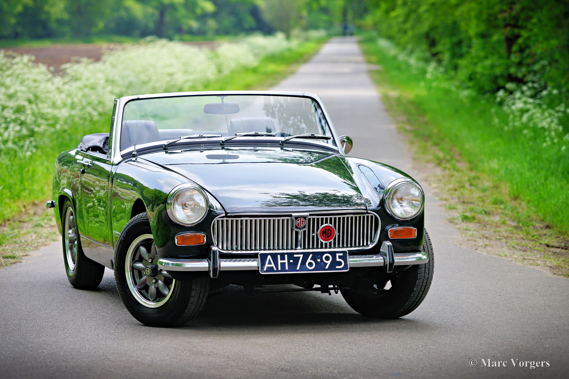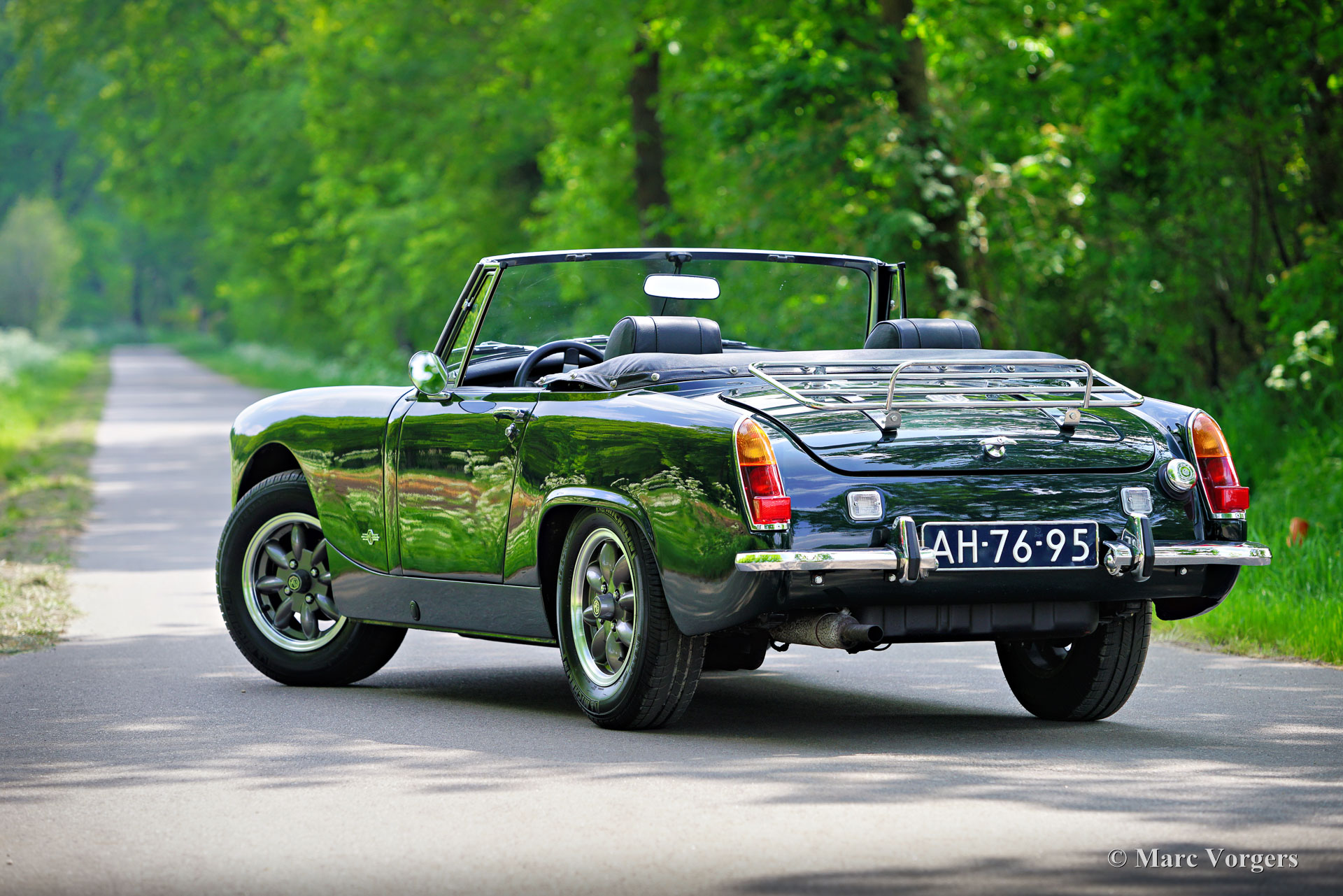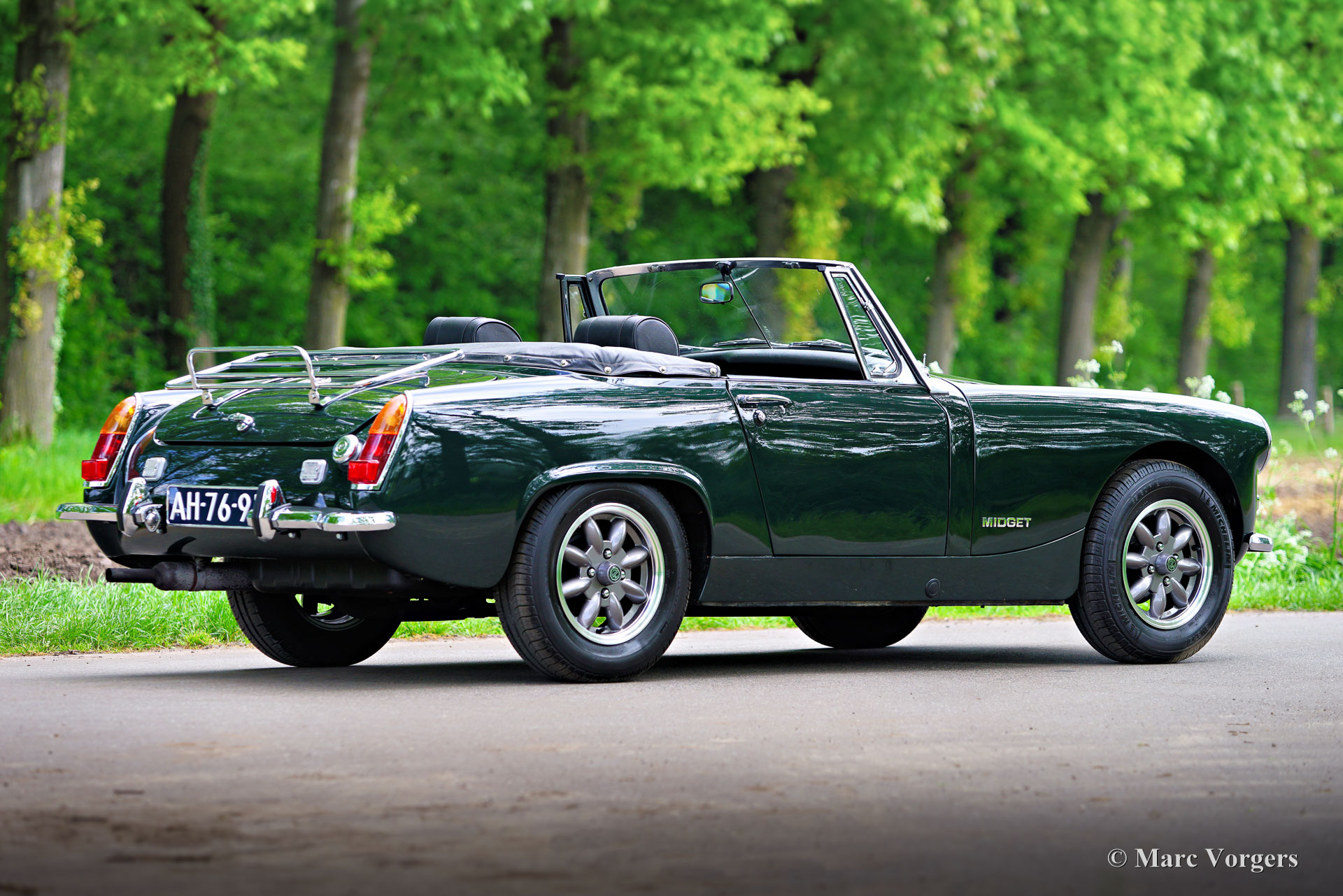 In 1964 the MG Midget MK II was introduced. The MK II was a more "luxurious" little sports car fitted with roll-up windows, door handles and locks (!) and improved semi-elliptic springs at the rear. In 1966 the MK III succeeded the MK II. The Midget became a larger, stronger engine; 1275 cc. and 65 bhp. were available now. Also the soft-top construction improved. The top remained on the car when folded and could be folded down easily now. In 1969 the Midget MK III evaluated again (MK III phase 2); the grille changed and the car was up-rated with slicker bumpers. In the year 1971 the sister model Austin Healey Sprite was taken out of production. In 1972 the MG Midget became round rear wheel arches and a larger petrol tank (MK III phase 3). The final MG Midget version, the MK IV, was built between 1974 and 1979. The MK IV was equipped with a 1493 cc., 66 bhp. engine. Also the car was fitted with thick rubber safety bumpers according to US safety regulations.