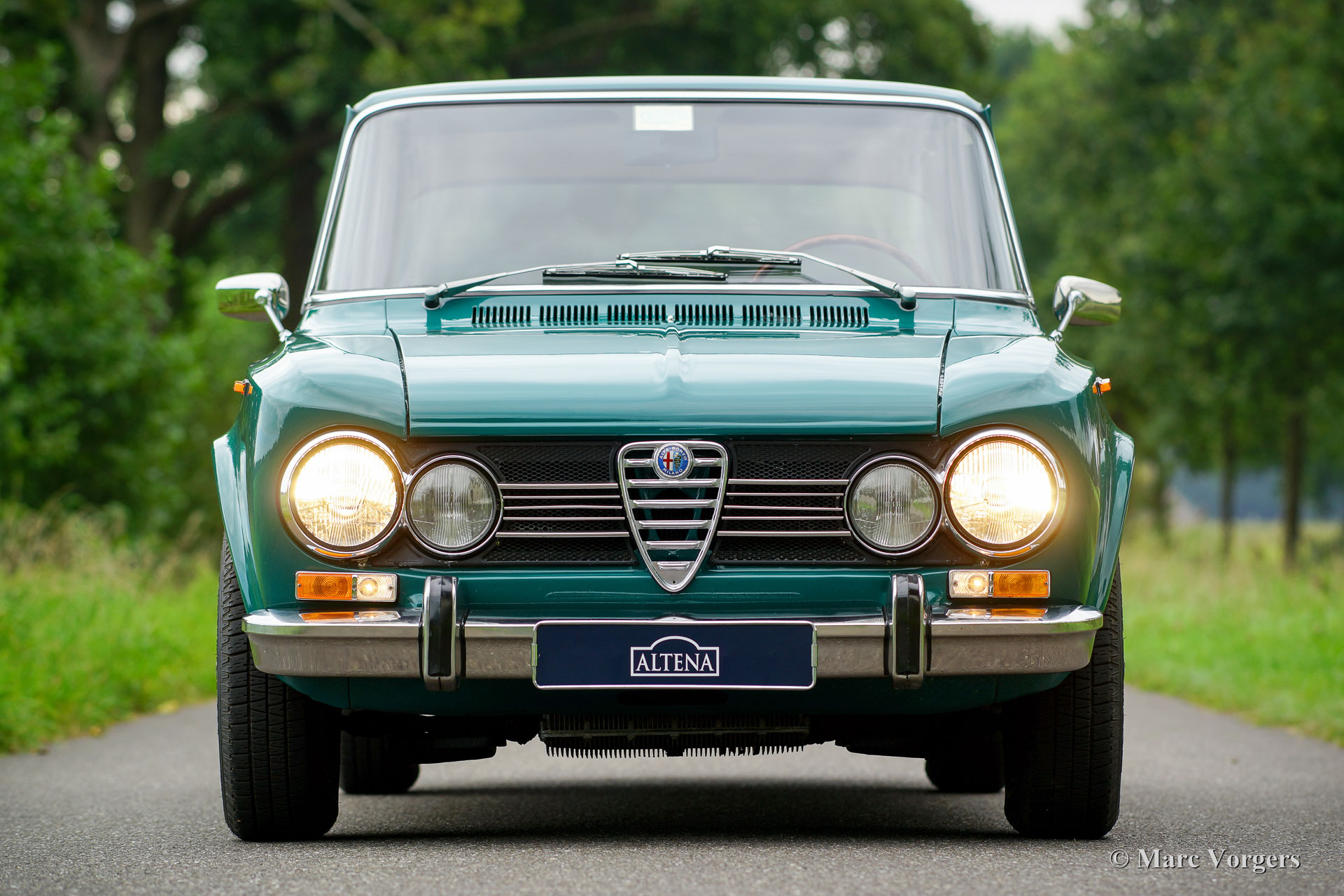 Alfa Romeo Giulia 1300 Super ‘Lusso’, year 1973. Colour Pine Green (Pino Verde) with a cognac colour (Wild Boar) leatherette interior and black rubber carpet. This magnificent Giulia Super comes from a car collection. The Alfa Romeo is in superb TOP-condition; like new! The car has driven only 63.000 kilometres since it left the factory gates. In the past, the car was given perfect new paint in the original colour, the bodywork shows crisp panel fit, superb bright-work, and the underside is just as impressive! The Alfa Romeo was perfectly serviced and maintained, cherished by its owner which becomes is obvious in every detail. The 1300 cc four-cylinder engine with twin overhead camshafts runs beautifully and the five-speed gearbox shifts smooth and direct. This Giulia Super shows all the beautiful original details. The car features the original 14-inch steel wheels, Vredestein tyres, two door mounted rear-view mirrors, a beautiful radio-cover-plate, a wood gear-lever knob and the original crick. The original user manual is also present. This is a magnificent TOP-specimen!