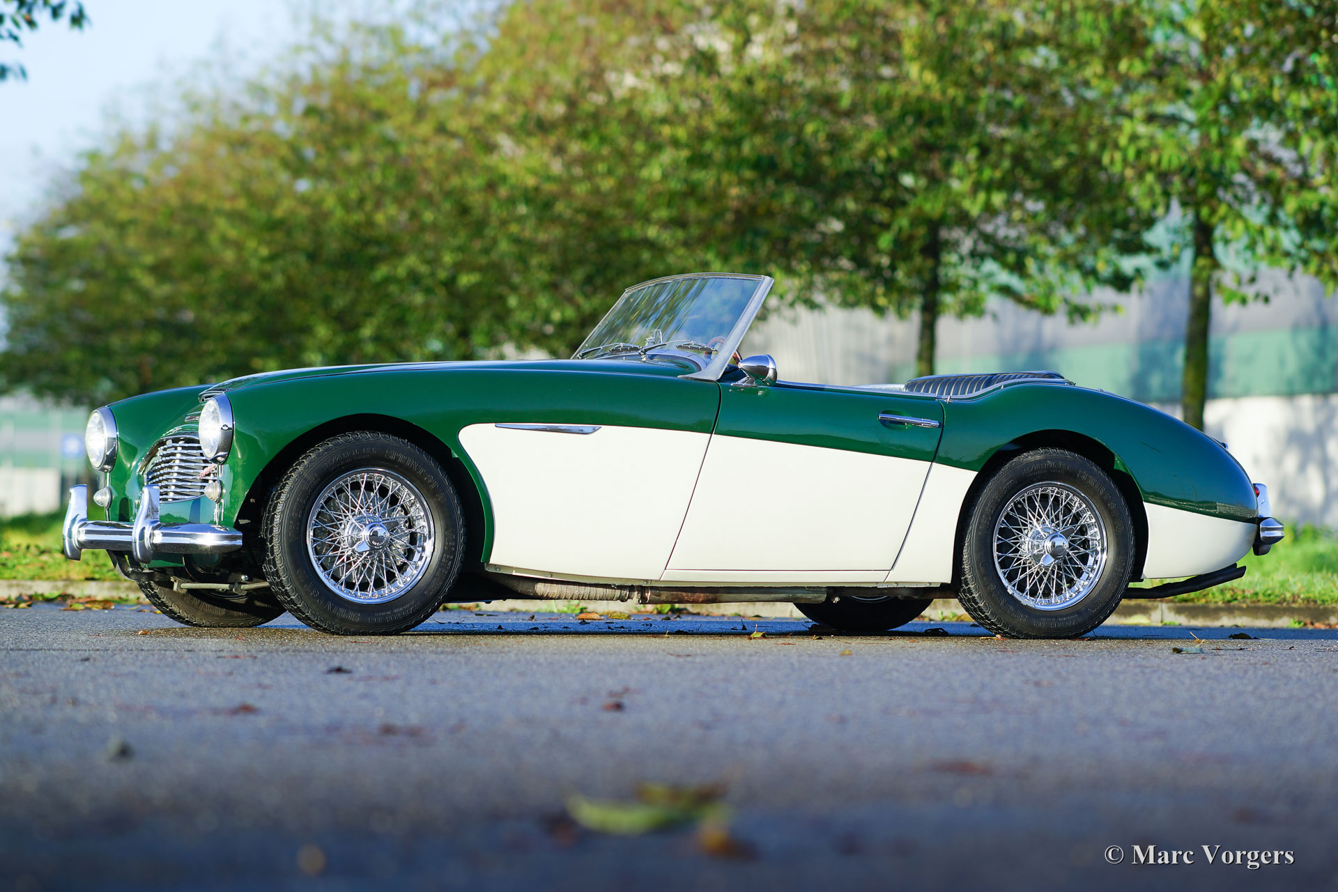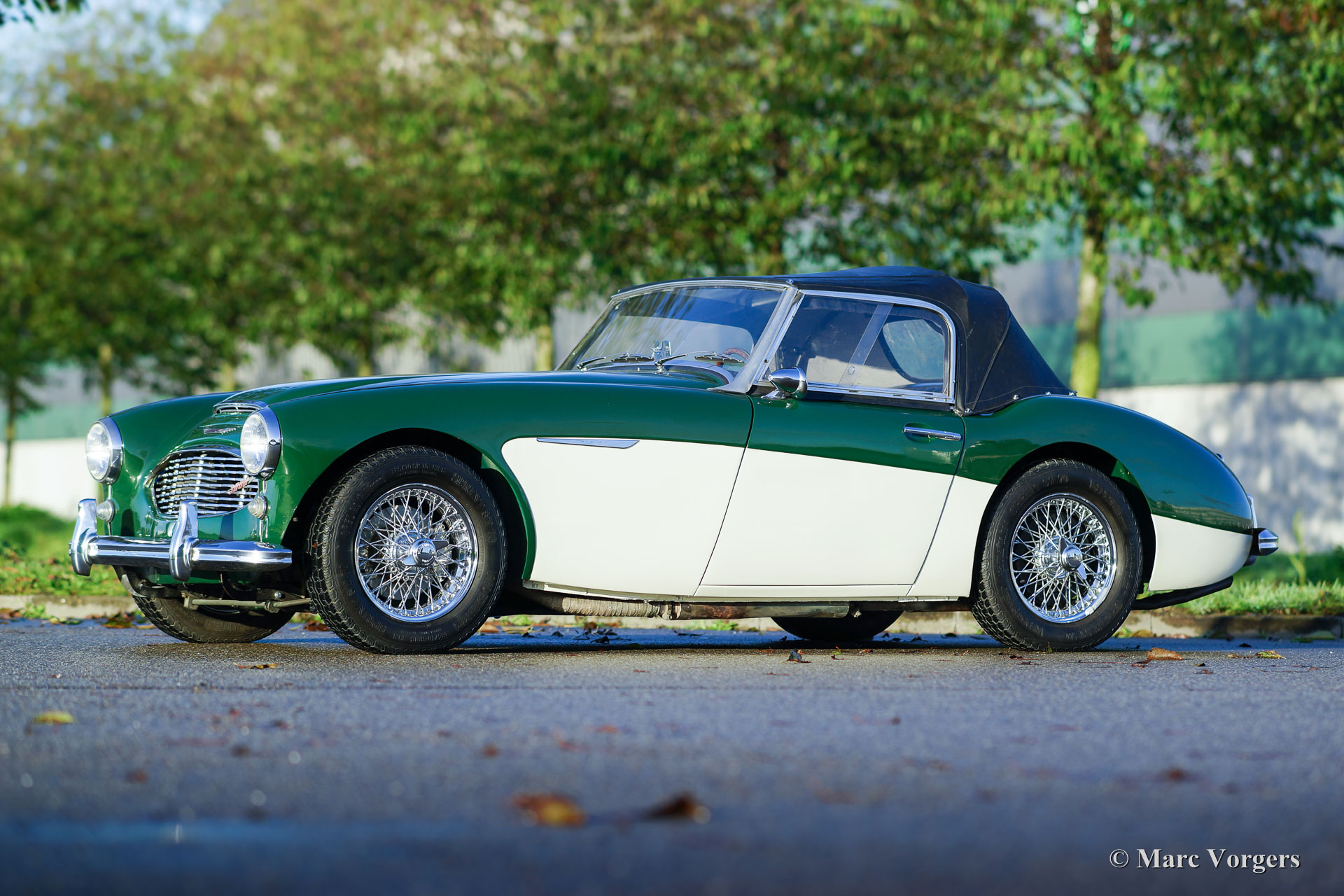 Austin Healey 3000 Mk I (type BT7), year 1961. Colour dark green over crème white. Black leatherette interior with black carpet. Black vinyl soft-top and tonneau-cover. This gorgeous ‘Big Healey’ is in very good and beautiful driver condition. The big six-cylinder engine runs and sounds splendidly, and the robust four speed gearbox is fitted with overdrive. The automobile is currently registered in Belgium. EU documents are present. To a Dutch buyer the car will be delivered with Dutch registration. This Austin Healey features overdrive, chrome wire wheels, good Vredestein 185/70-15 tyres, electronic 123 ignition, alternator, modern (high-torque) starter, Stainless-Steel exhaust, aluminium petrol tank, side-curtains with aluminium frames, sports steering wheel with wood rim and a black tonneau cover. This is a magnificent driver car in very good condition.