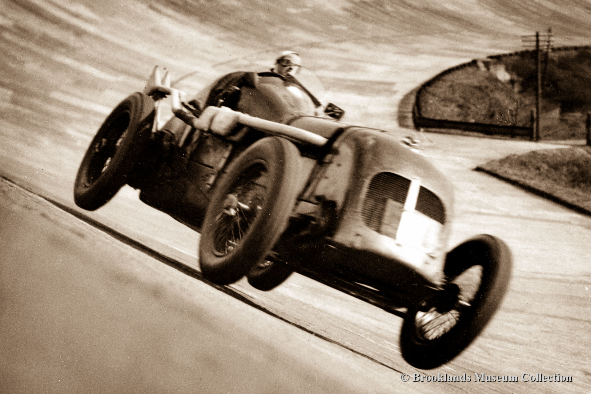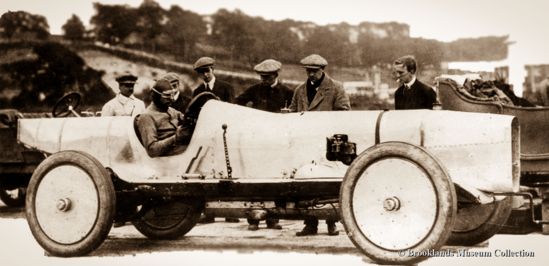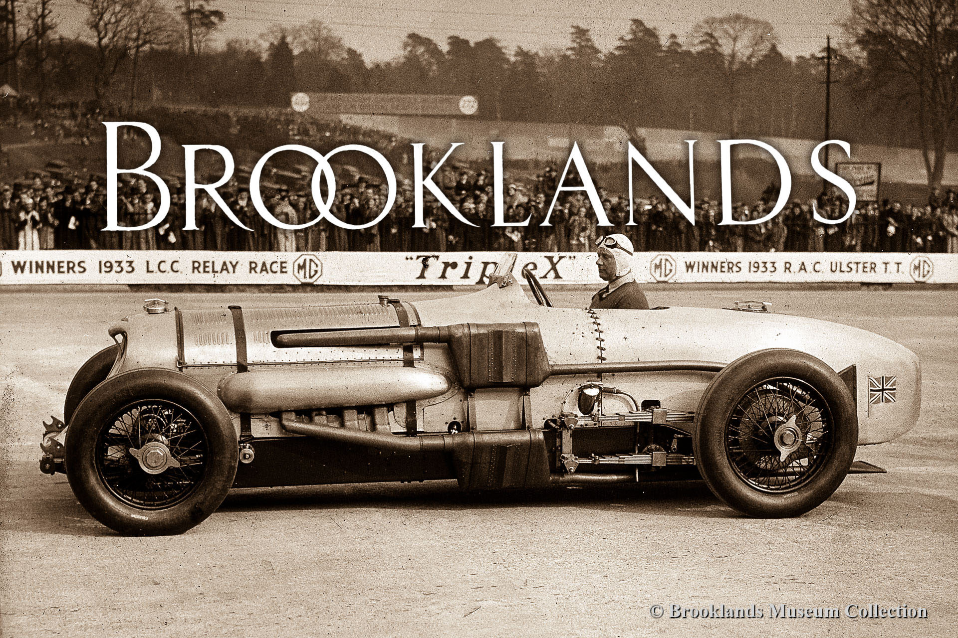 Brooklands Giants: original photos and old films on the history of Brooklands race course and a presentation on the Brooklands Museum. The photo reportage presents a chronological account of the high-lights which occurred on the worlds first purpose build race track from 1907 until 1939. You get acquainted with all the giants: the men and their machines! The original photographs have been generously supplied by the Brooklands Museum. Today you can re-live these golden days in the Brooklands Museum which is located in the clubhouse and hangars at the remains of the old circuit; a fabulous step back in time! In the museum you can sample the atmosphere and see a beautiful collection of old racíng cars. This including John Cobbs legendary Napier Railton which was designed by Reid Railton and built by Thomson & Taylor at Brooklands. Since last year the Brooklands museum has a unique new attraction: The Napier Railton 4D experience. Now you can ‘take the cement’ and sample a high speed lap in the Napier Railton! We did and we were impressed! See the video farther below!