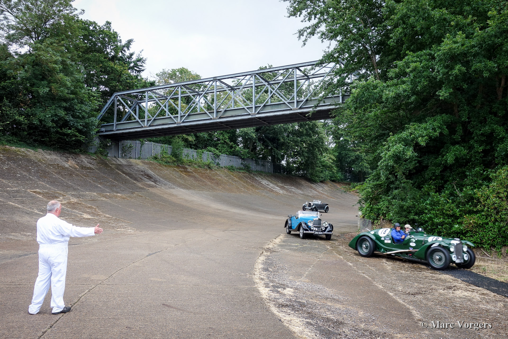 93-100 Photos taken at the Brooklands Museum site. The old clubhouse and the 'members banking' with the 'members bridge' as most famous Brooklands landmark. These photos were taken during the Brooklands Members Reunion on Sunday 13 Juli 2014