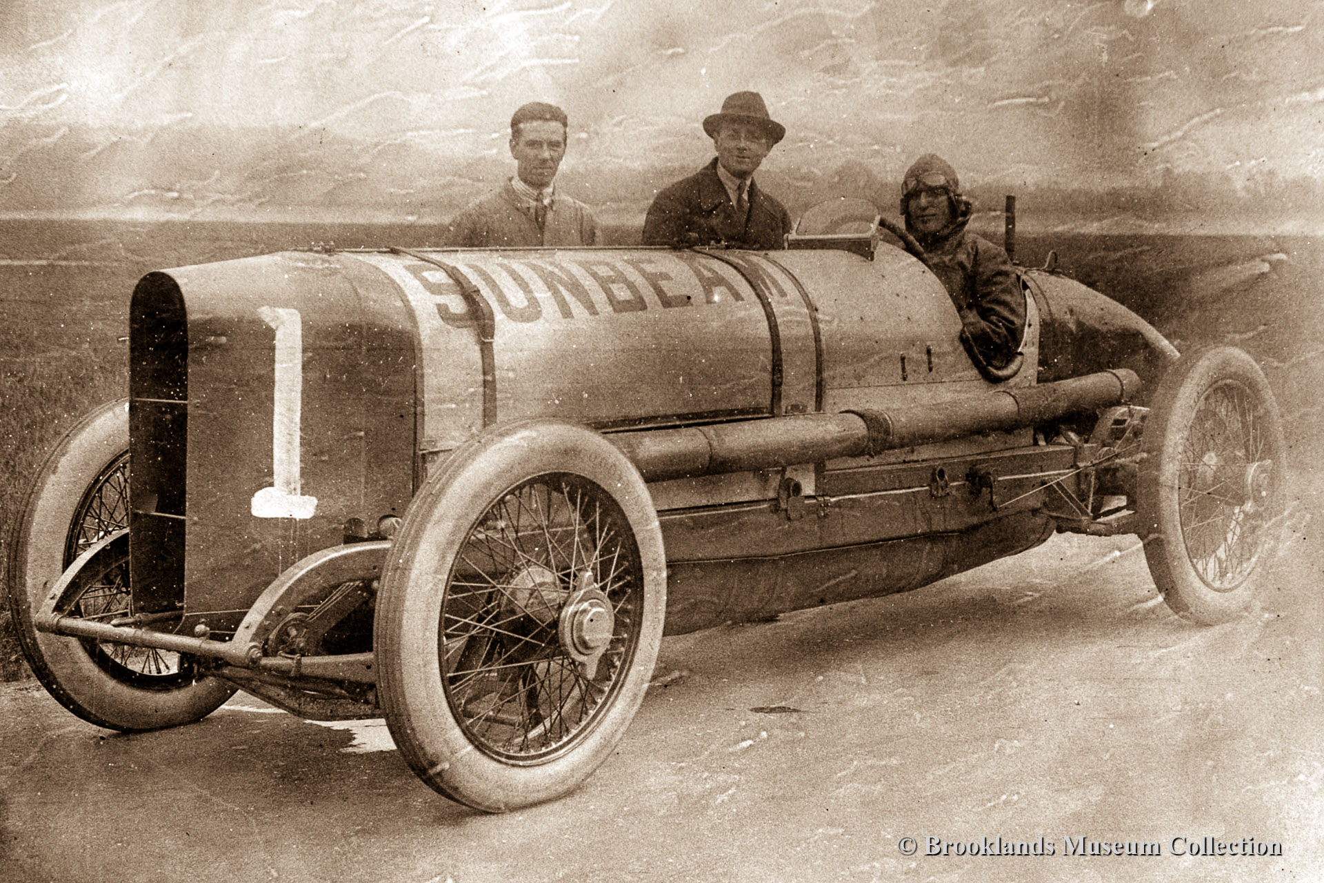 19 Sunbeam 350 HP record car. Designer Coatalen with hat and Sammy Davis behind the wheel. In May 1922 Kenelm Lee Guinnes set three records driving the 350 HP Sunbeam. The Brooklands lap record at 123.30 mph (198.43 km/h), then the world land speed record over a mile at 129.17 mph (207.88 km/h) and over a kilometre at 133.75 mph (215.25 km/h) – this was the last land speed record to be set on the Brooklands track.