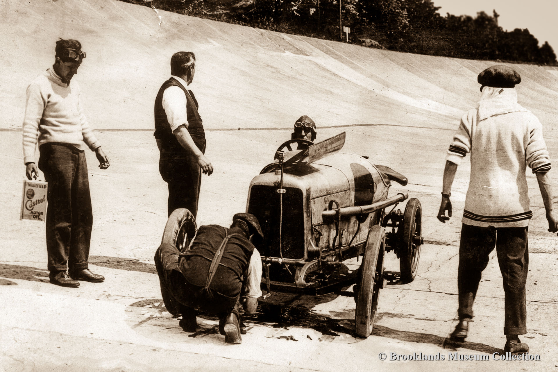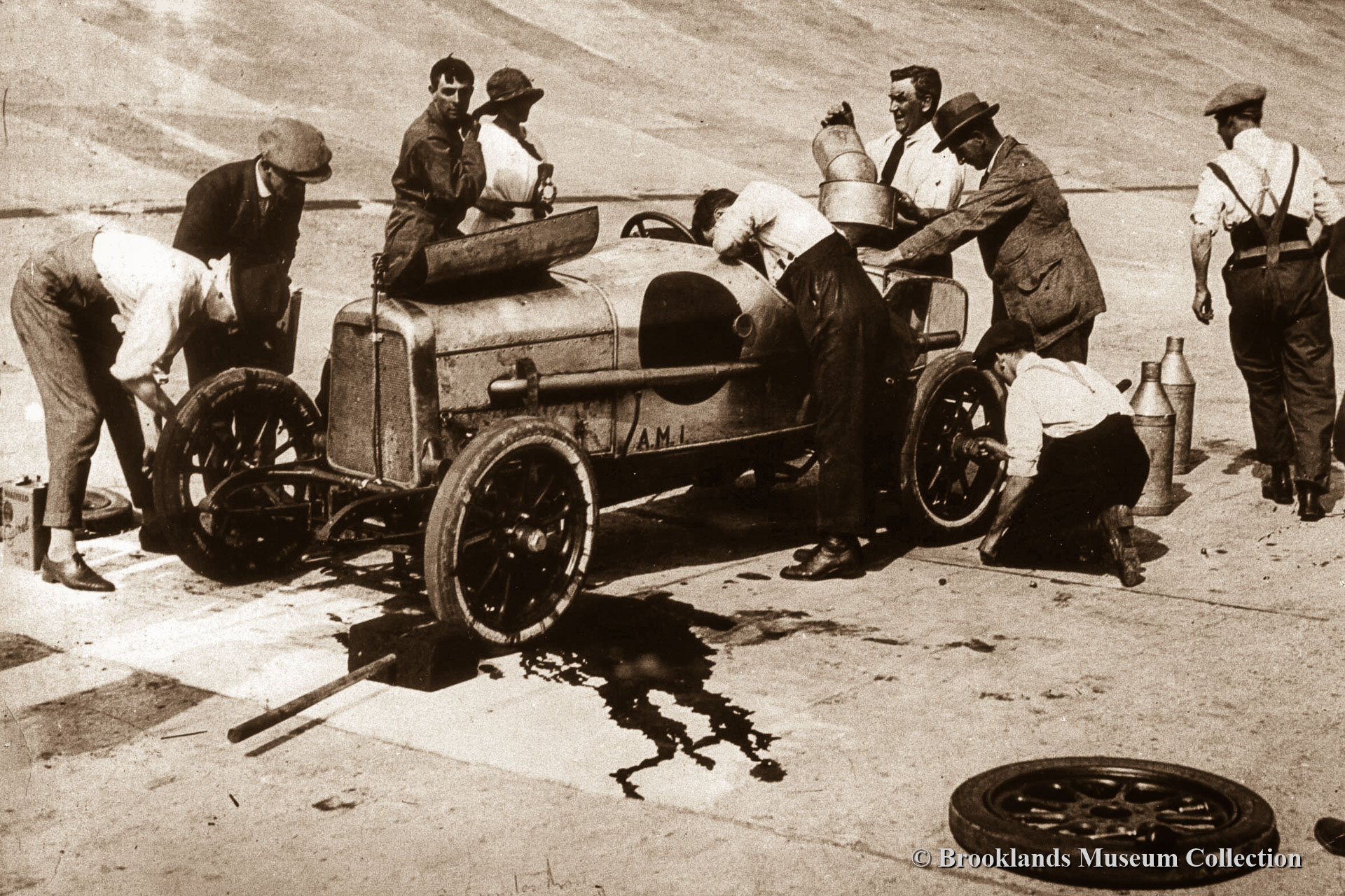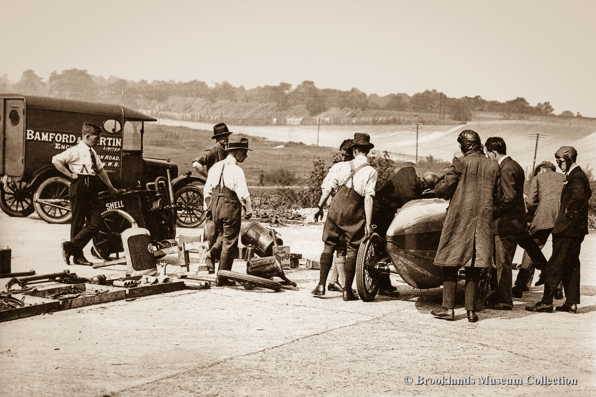 23-25 Aston Martin world records at Brooklands 1922. Actually Bamford & Martin at that date. The car is the first Aston, A.M. 1. Lionel Martin in white shirt and black tie