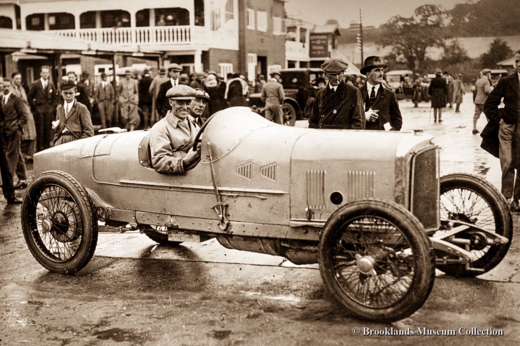 22 Brooklands Giant Chitty 1 with Zborowski at the wheel in front of the clubhouse.