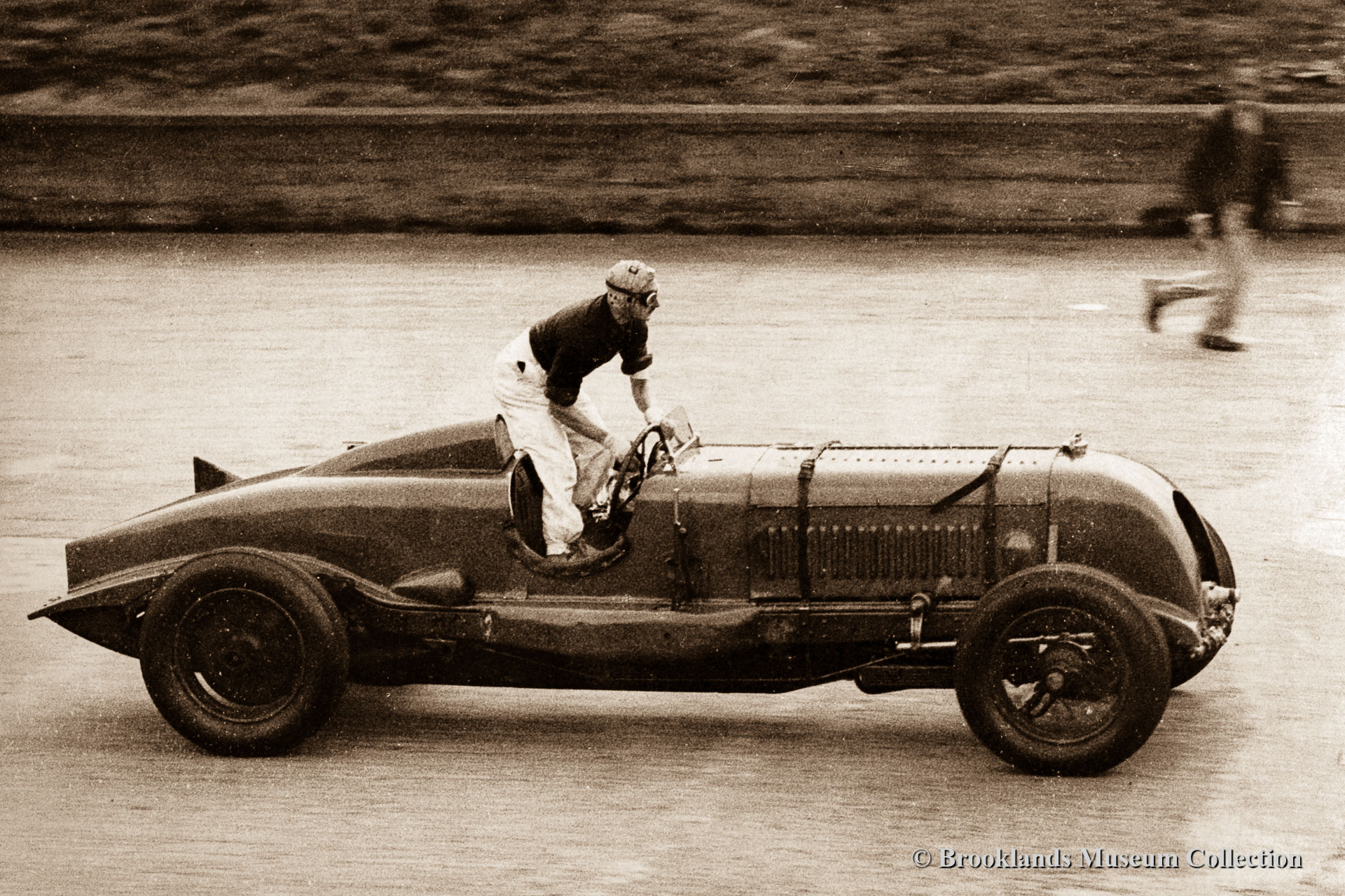 28 Indianapolis Sunbeam emerging from under the 'members bridge'. Malcolm Campbell and mechanic Leo Villa in the car