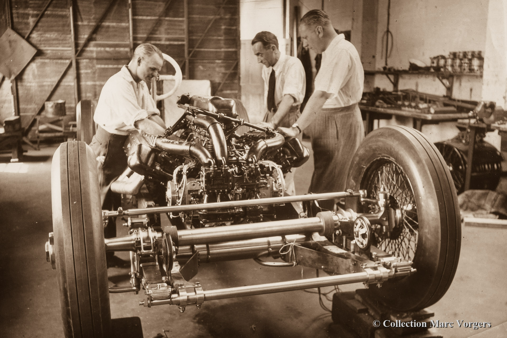 60 Building John Cobbs Napier Railton record car at Thomson & Taylor Brooklands 1932. Ken Taylor, Reid Railton and John Cobb are in the picture