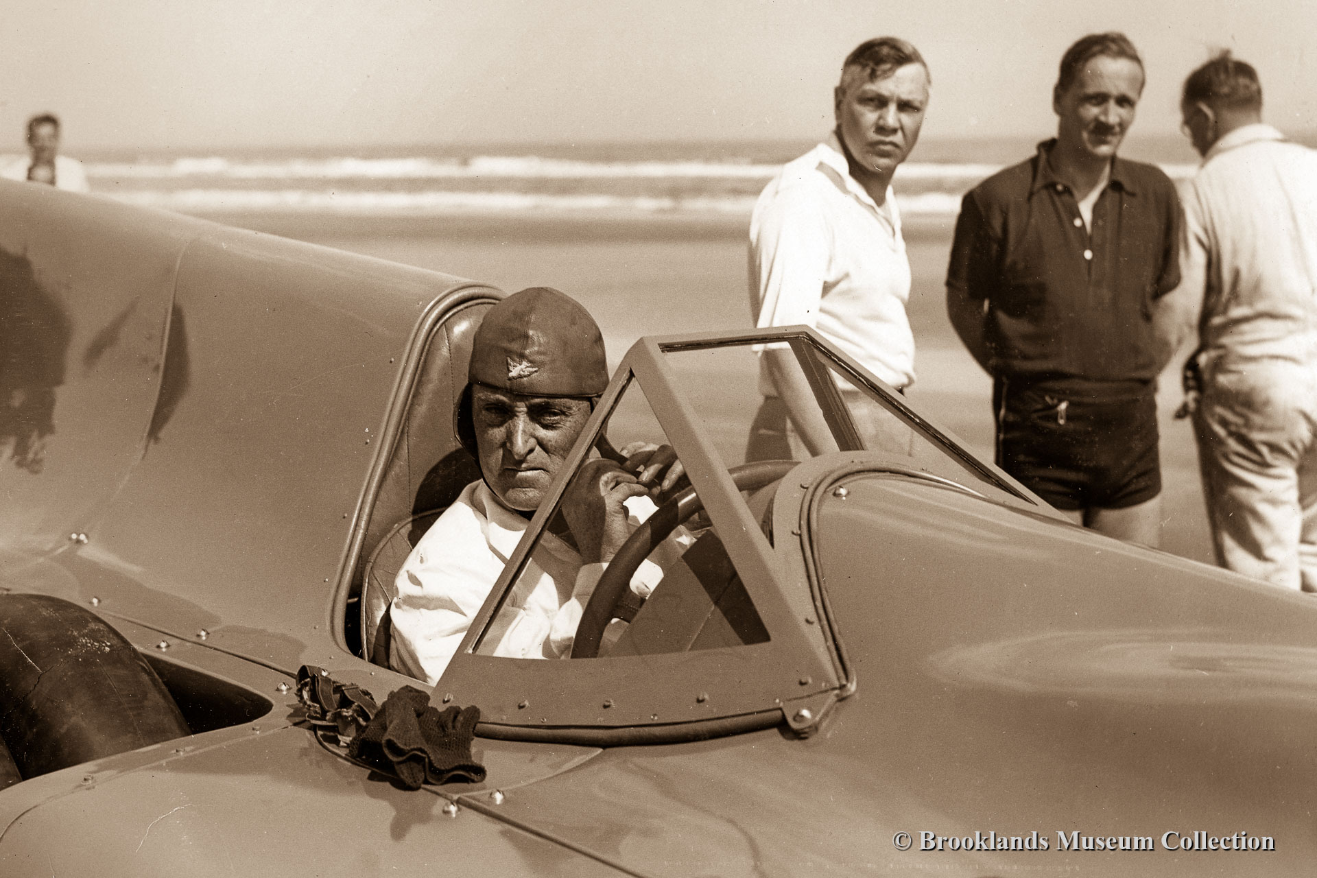 71 Malcolm Campbell in blue Bird after his successful record bid of over 301 mph. (481,8 km/h.) 3 September 1935 at Daytona Beach, Florida, USA