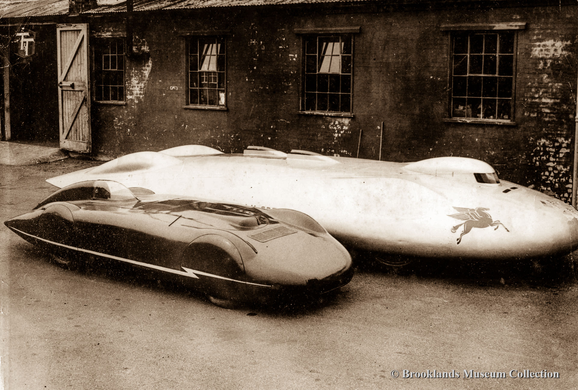 89 The Railton-Special (now Railton Mobil Special) and the MG EX-135 outside the workshops of Thomson & Taylor just after World War 2