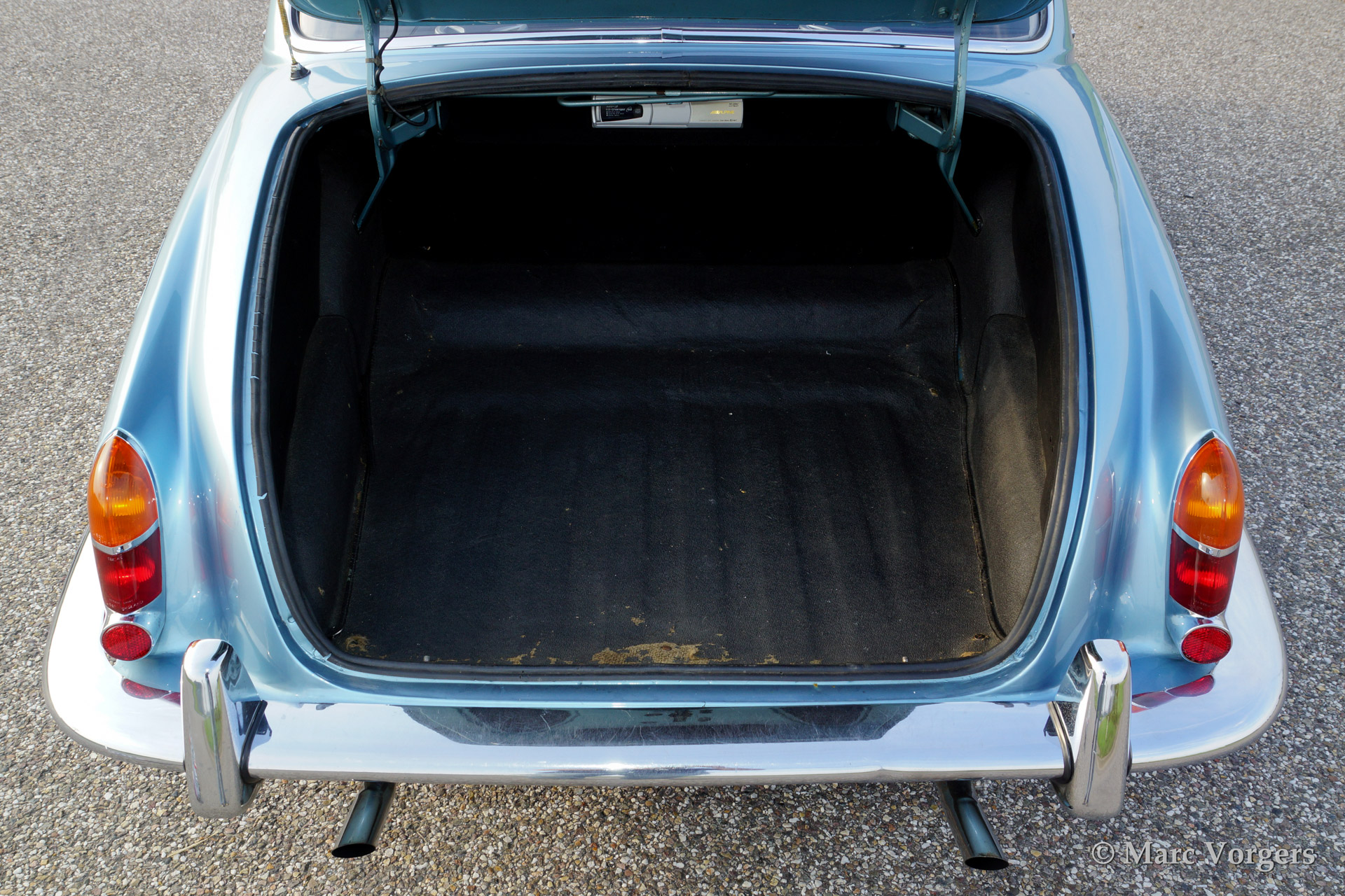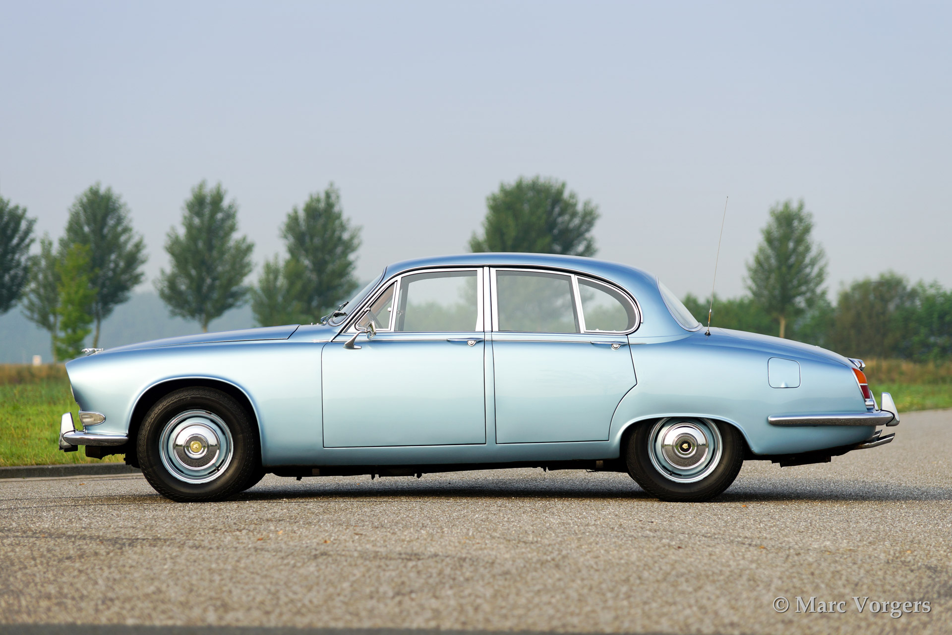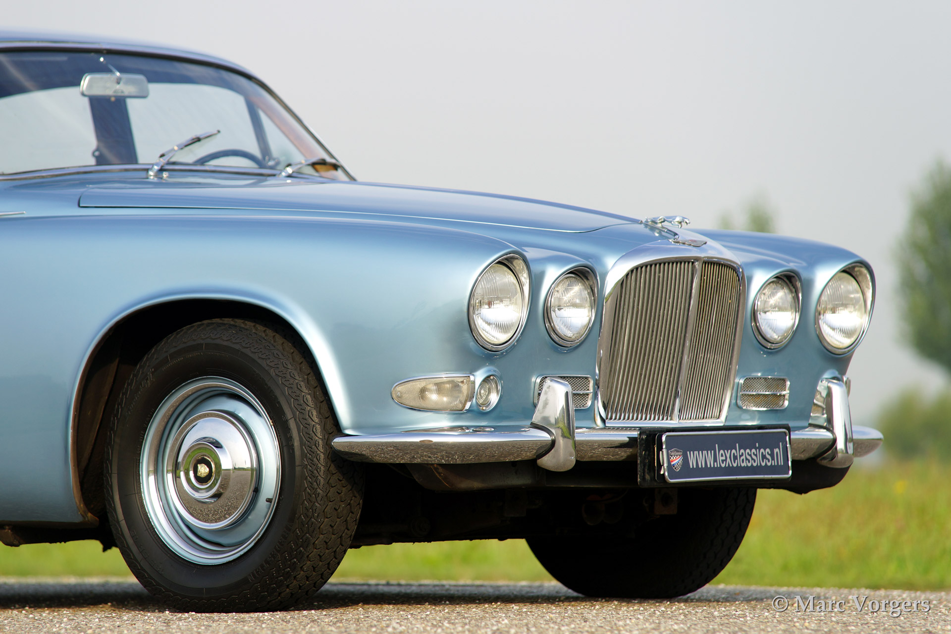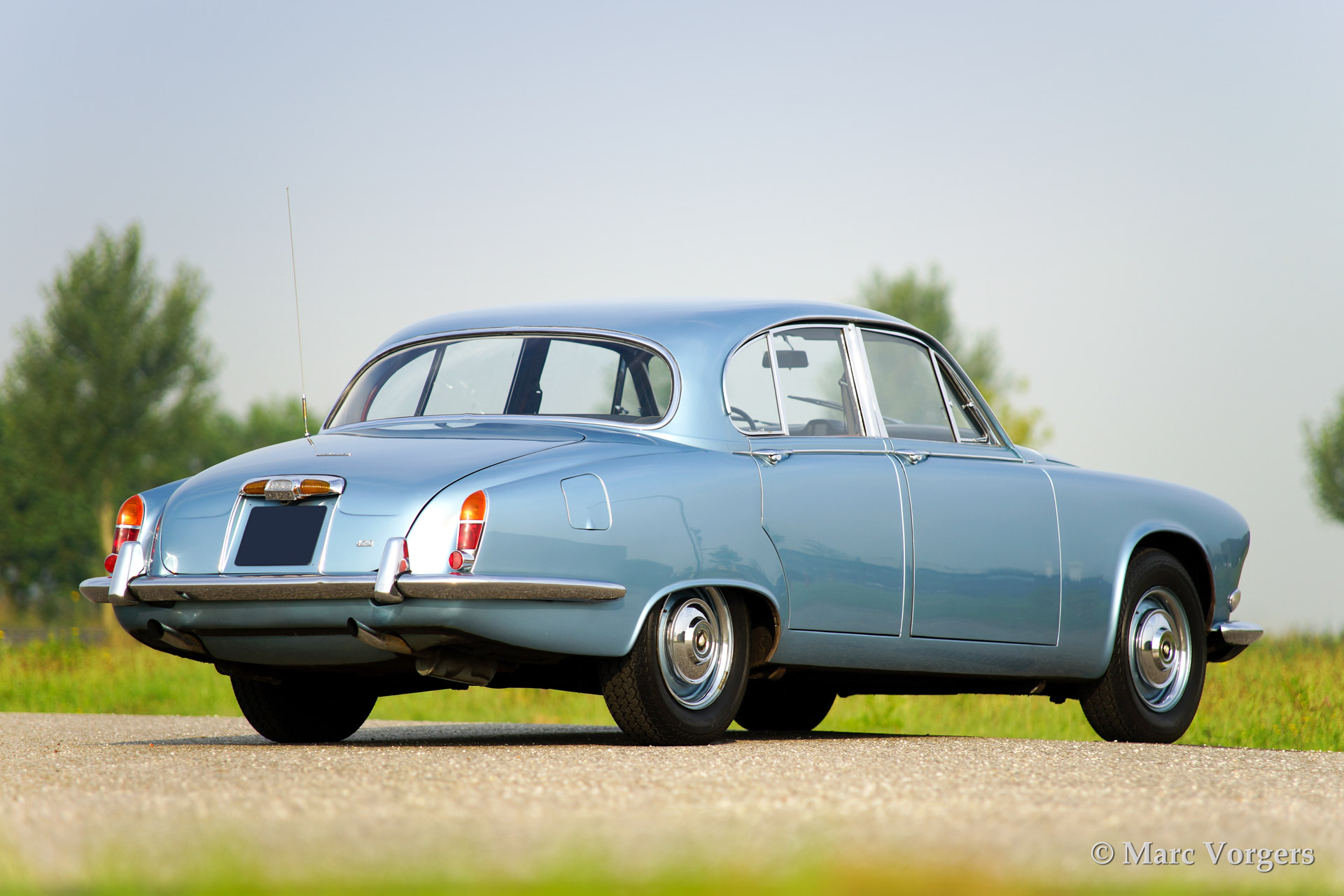Jaguar 420, year 1969. Colour opalescent light blue (metallic) with a dark blue leather interior. The automobile has undergone partial restorations in the past, very good condition., This Jaguar 420 features a 4-speed manual gearbox and overdrive, a delightful combination! Driving the 420 you can feel that the car is more refined than the older Mk II, especially because of the independent rear suspension and the better sound insulation. This 420 is fitted with hydraulic power steering and a modern hifi system with CD-changer of with an external display has been beautifully integrated in the dashboard.