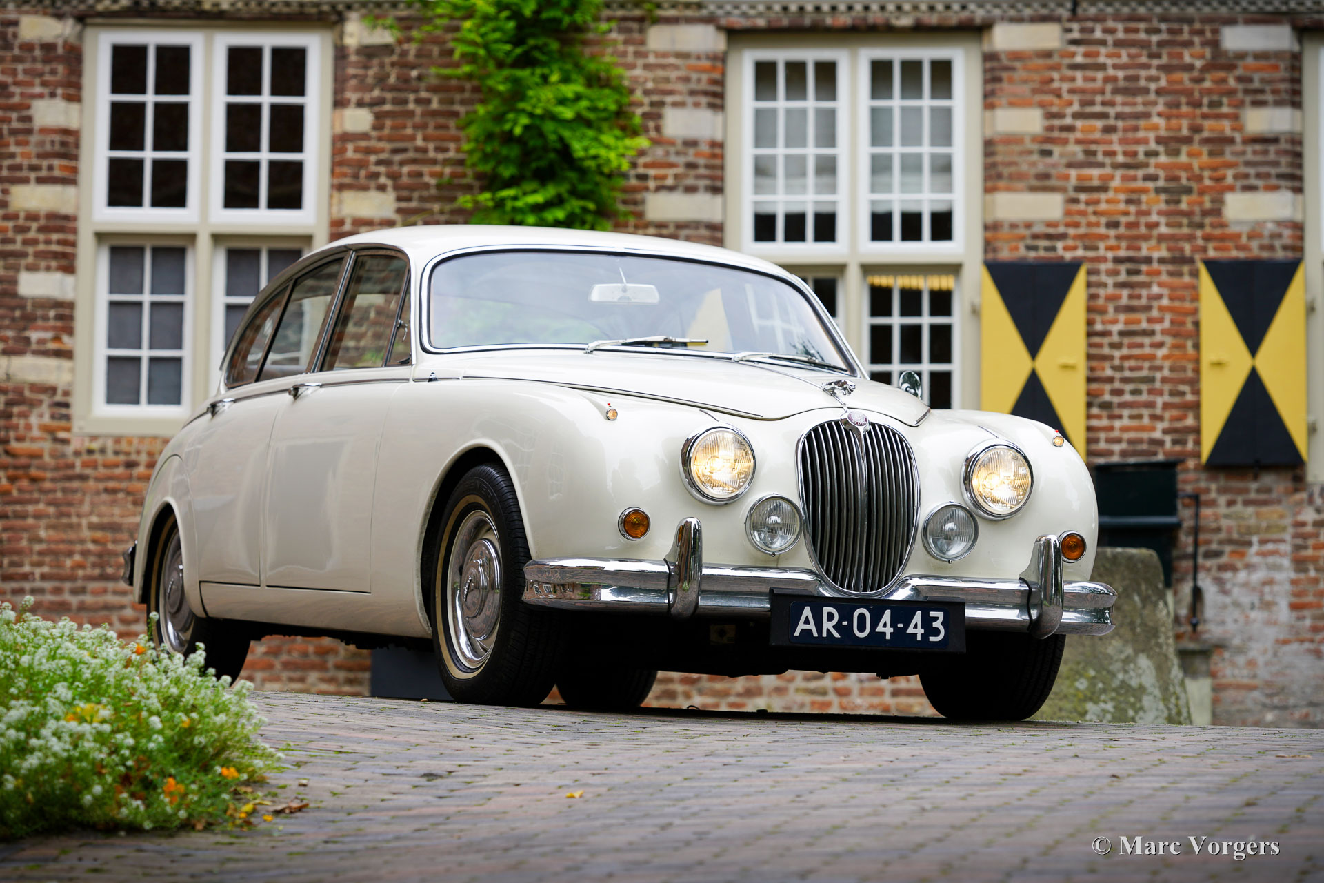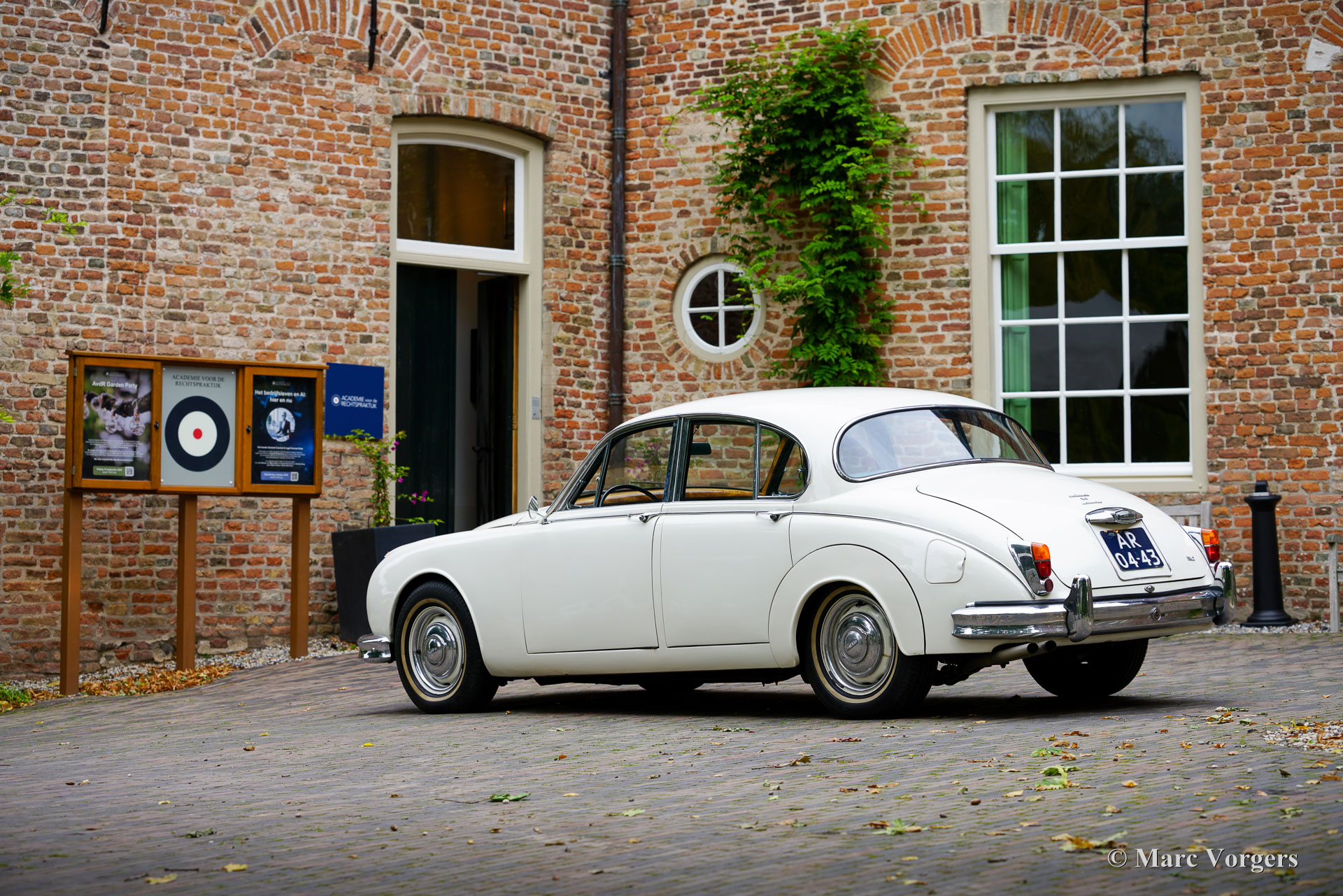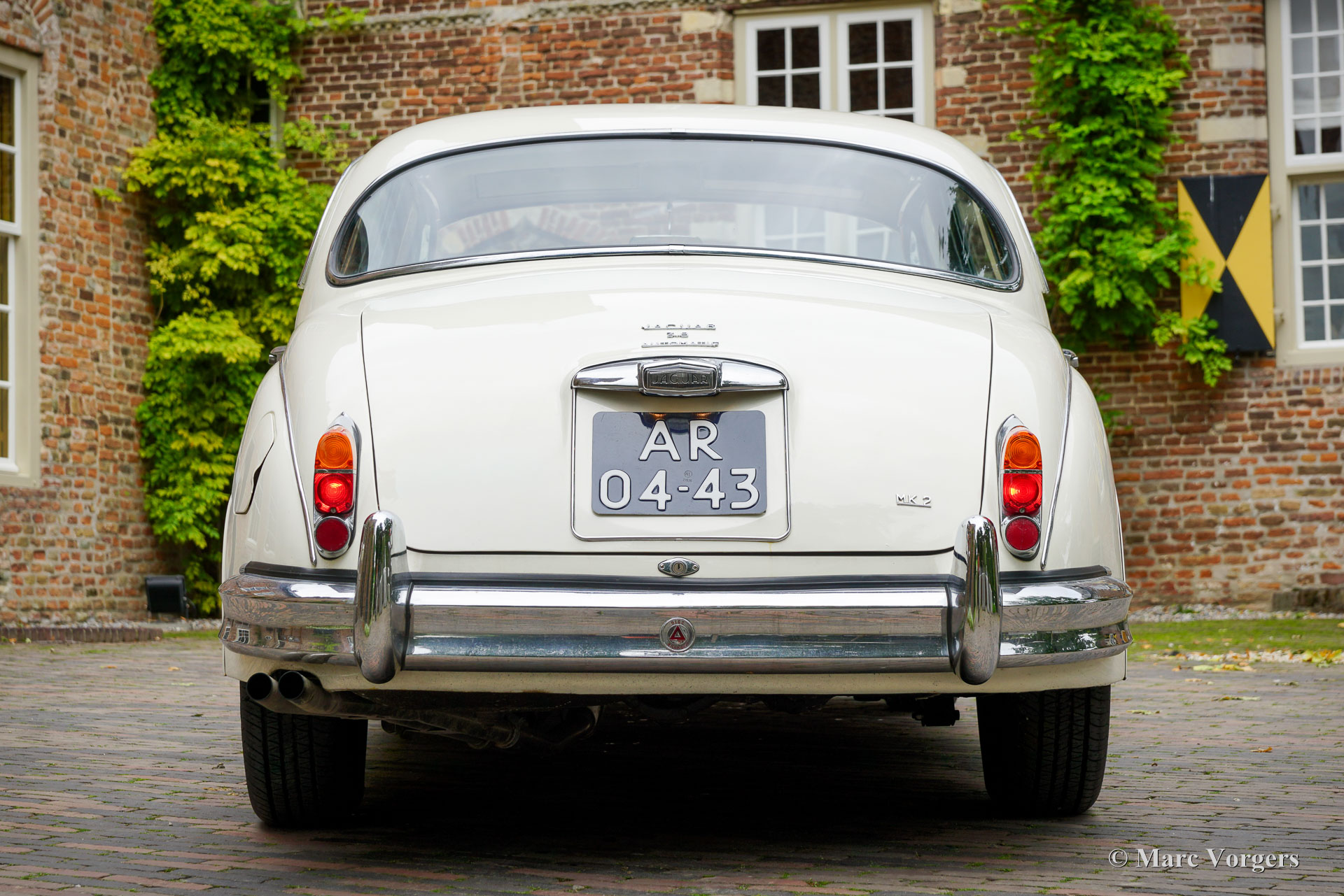 Jaguar MK II 3.8 Litre automatic, year 1962. Body finished in Old English White combined with a two-tone grey cloth/aquamarine blue vinyl interior, trimmed with black carpet. This beautiful Jaguar MK II 3.8 Litre was imported to the Netherlands on 14 July 2010. The automobile was purchased by the current owner on 6 April 2017. In 2017 the automatic gearbox was repaired, and the steering pump was inspected with the odometer reading 522 miles. In June 2019 the car underwent an extensive service by a Jaguar specialist in the Netherlands. Several oil leaks were repaired, the dynamo was overhauled, the voltage regulator renewed and adjusted, the rubber engine mounts renewed, carburettors cleaned and refurbished, and the fuel tank renewed. The automatic gearbox was then fully overhauled. Furthermore, new Lucas Fog rangers were fitted. € 15.000 was invested in repairs and service since 2017. This vintage Jaguar is in a very good and wonderful condition inside and out. Only the back lower ends of the ‘spats’ over the rear wheels show tiny spots of corrosion (some bubbling visible in the photos). Being part of a classic car collection, the Jaguar was driven sparsely, the odometer now reads 2023 miles. The Jaguar Mk II 3.8 Litre was introduced in 1959. The MK II was a refined British saloon that combined comfort with notable performance for its time. Powered by the top of the line 3.8‑litre Jaguar XK 220 bhp straight‑six sport car engine, it offered strong acceleration (just under 10 seconds from 0-60 mph with the automatic 3-speed Borg Warner gearbox) and a smooth driving experience, making it popular with both more affluent private owners and the police. Also, the thieves’ guild appreciated the MK II; “Pure wheels for outrunnin' the Dibble.”  This example features a wonderful original interior in a stunning 1960s colour scheme. The wood dashboard and other wood finish lavishly on display all-round the interior give the interior an air of exclusivity and elegance. The car features an original Radiomobile AM radio. This vehicle is available to view and test drive by prior appointment only.