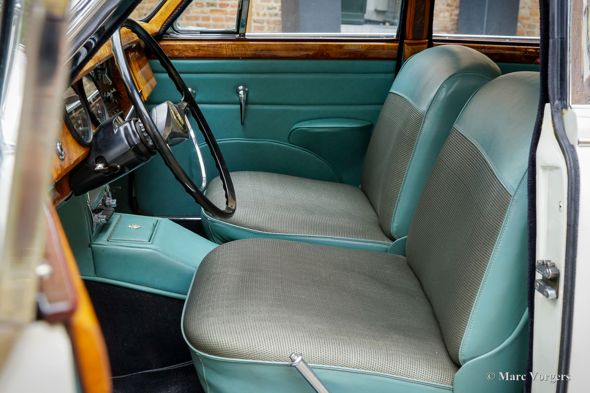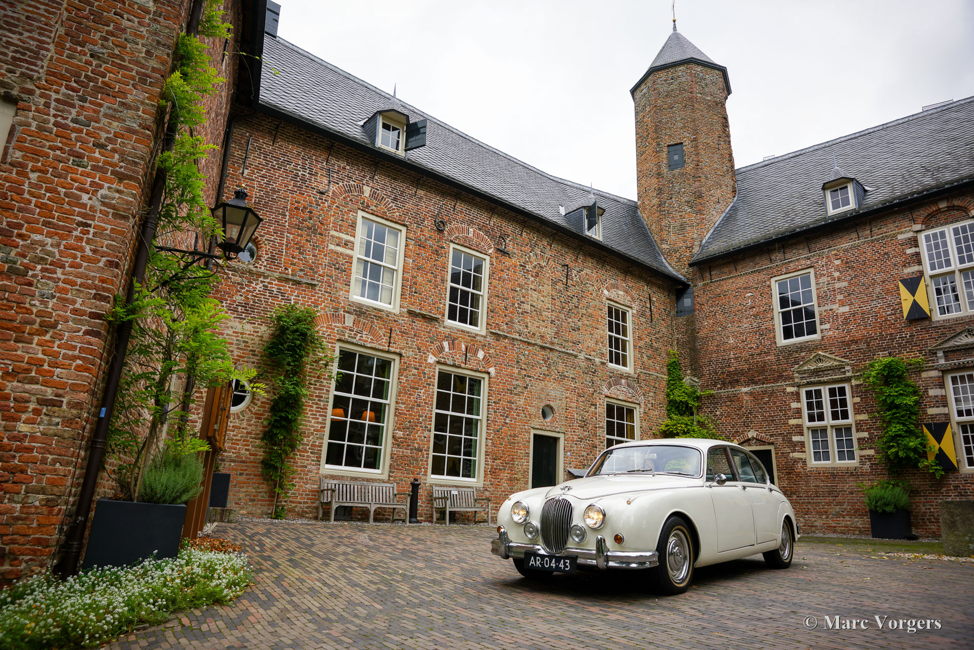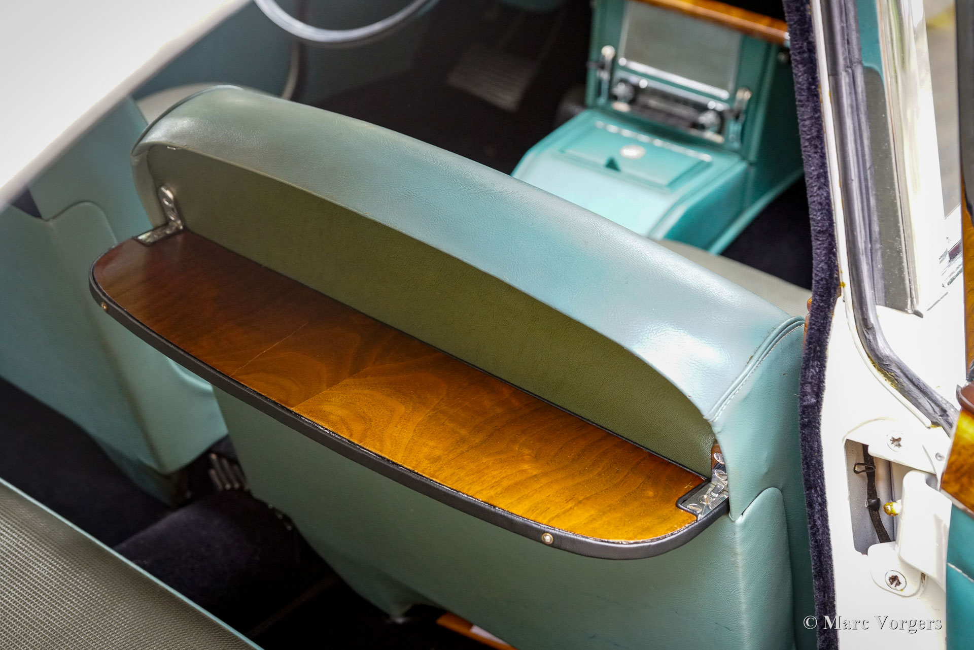 Jaguar MK II 3.8 Litre automatic, year 1962. Body finished in Old English White combined with a two-tone grey cloth/aquamarine blue vinyl interior, trimmed with black carpet. This beautiful Jaguar MK II 3.8 Litre was imported to the Netherlands on 14 July 2010. The automobile was purchased by the current owner on 6 April 2017. In 2017 the automatic gearbox was repaired, and the steering pump was inspected with the odometer reading 522 miles. In June 2019 the car underwent an extensive service by a Jaguar specialist in the Netherlands. Several oil leaks were repaired, the dynamo was overhauled, the voltage regulator renewed and adjusted, the rubber engine mounts renewed, carburettors cleaned and refurbished, and the fuel tank renewed. The automatic gearbox was then fully overhauled. Furthermore, new Lucas Fog rangers were fitted. € 15.000 was invested in repairs and service since 2017. This vintage Jaguar is in a very good and wonderful condition inside and out. Only the back lower ends of the ‘spats’ over the rear wheels show tiny spots of corrosion (some bubbling visible in the photos). Being part of a classic car collection, the Jaguar was driven sparsely, the odometer now reads 2023 miles. The Jaguar Mk II 3.8 Litre was introduced in 1959. The MK II was a refined British saloon that combined comfort with notable performance for its time. Powered by the top of the line 3.8‑litre Jaguar XK 220 bhp straight‑six sport car engine, it offered strong acceleration (just under 10 seconds from 0-60 mph with the automatic 3-speed Borg Warner gearbox) and a smooth driving experience, making it popular with both more affluent private owners and the police. Also, the thieves’ guild appreciated the MK II; “Pure wheels for outrunnin' the Dibble.”  This example features a wonderful original interior in a stunning 1960s colour scheme. The wood dashboard and other wood finish lavishly on display all-round the interior give the interior an air of exclusivity and elegance. The car features an original Radiomobile AM radio. This vehicle is available to view and test drive by prior appointment only.