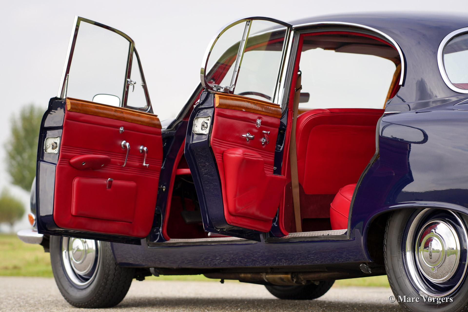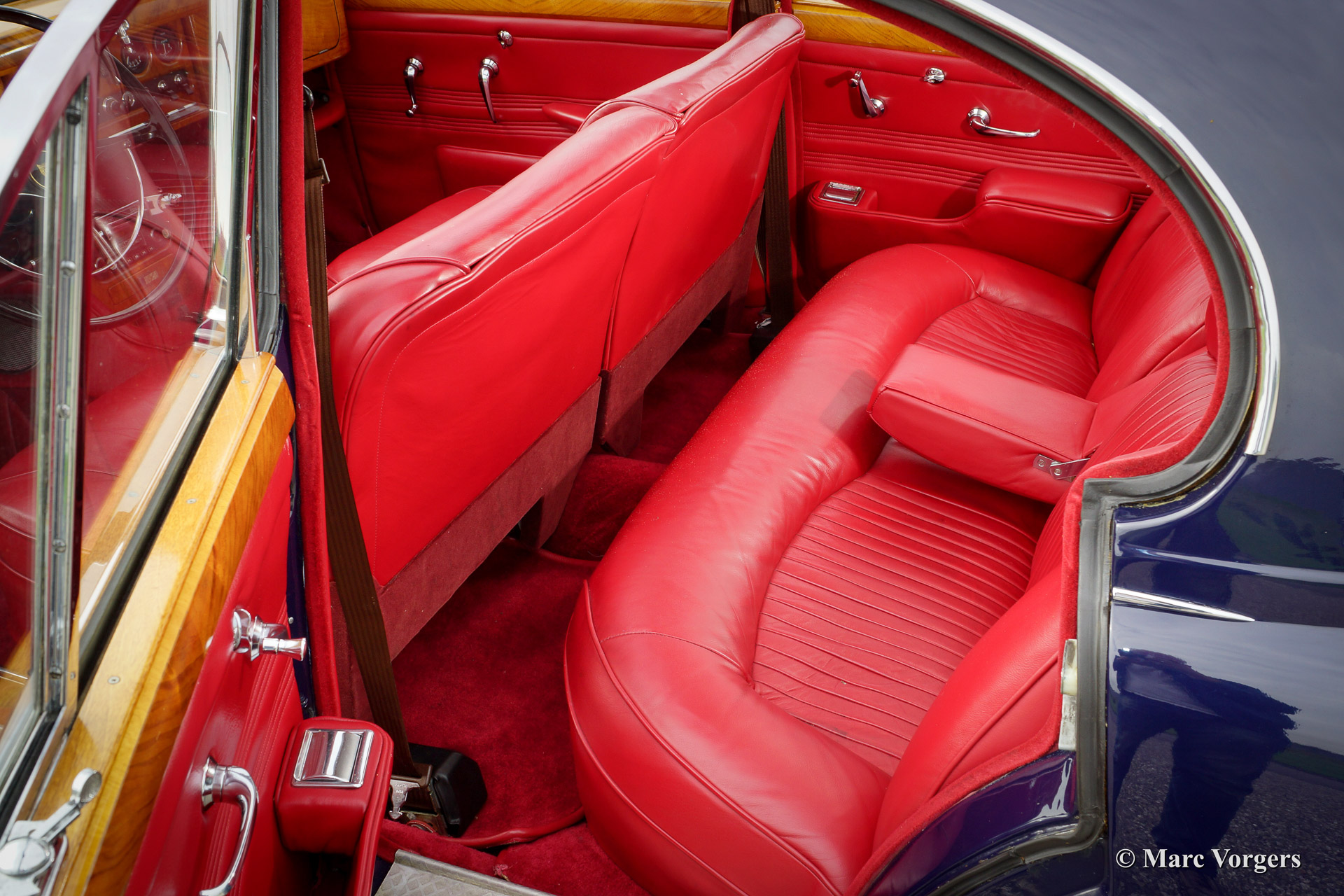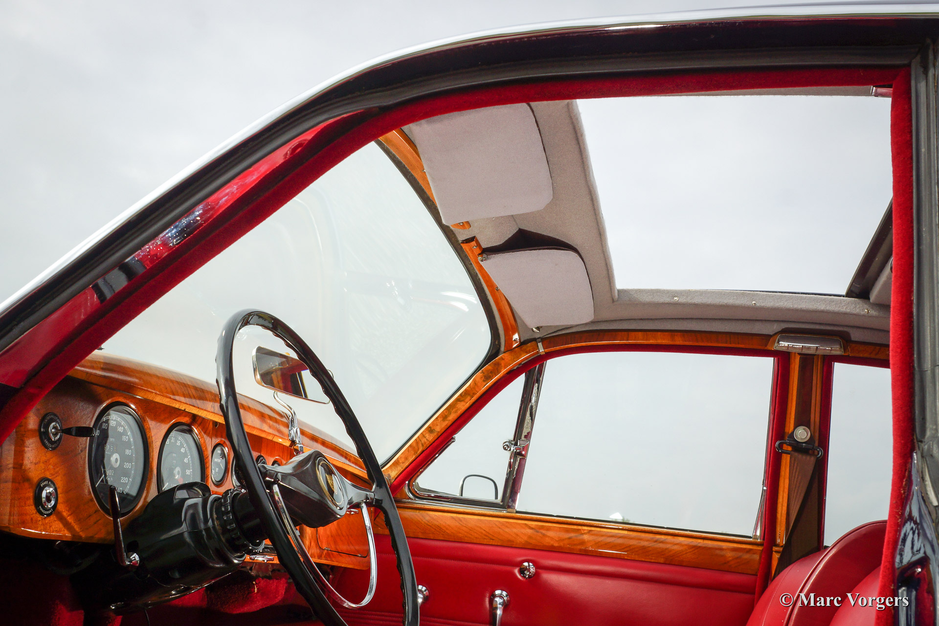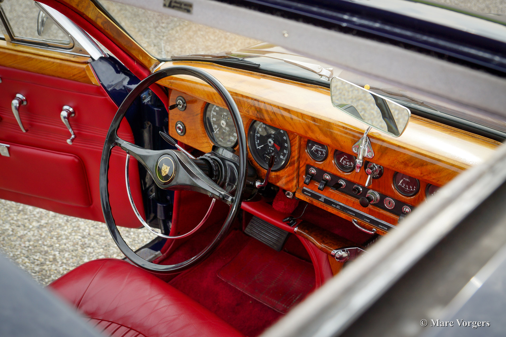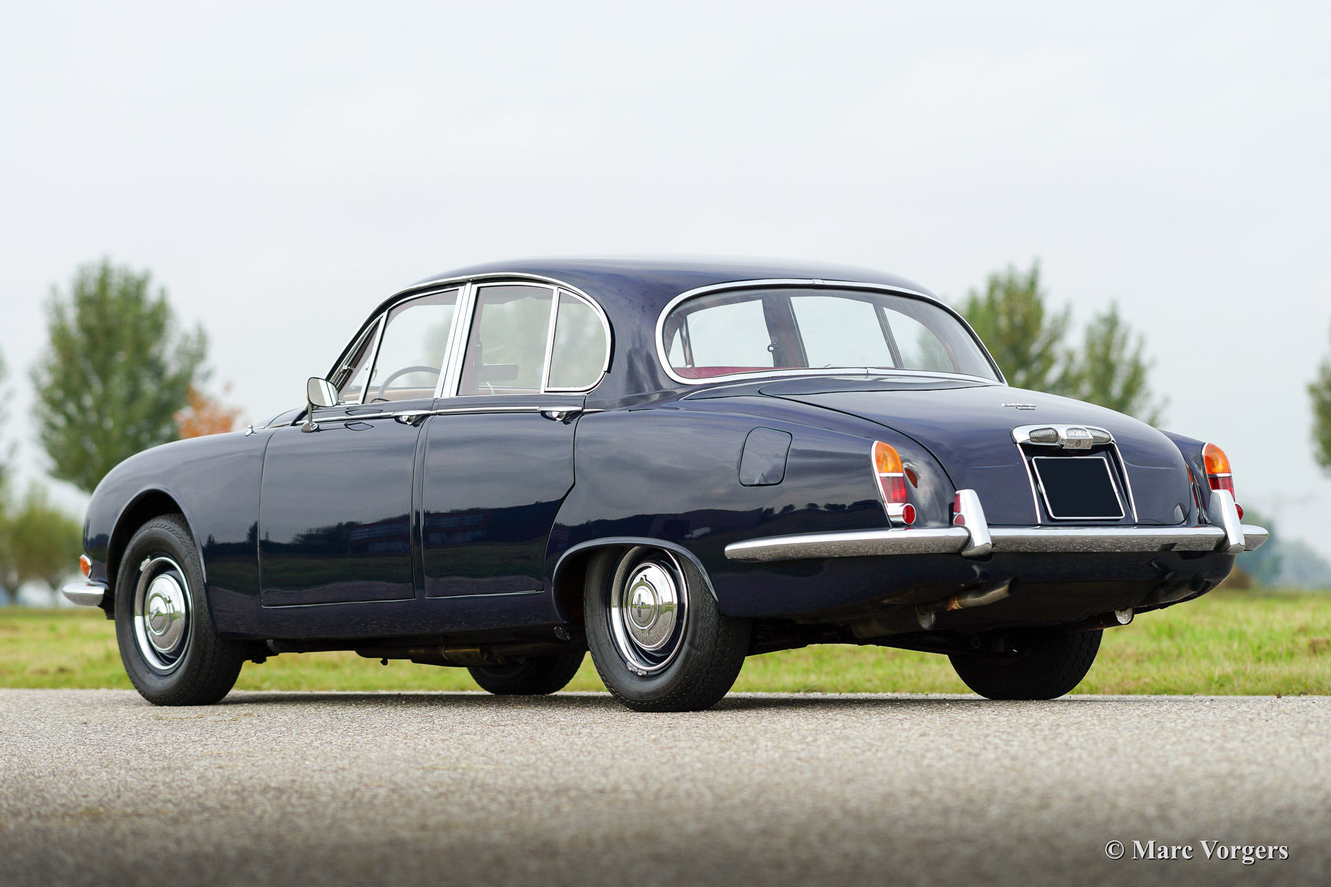 Jaguar S-type 3.4 Litre saloon, year 1965. Chassis number P1B25539BW. Colour dark blue with a red leather interior. The delightful Jaguar S-type is the bigger brother of the Jaguar Mk II. This automobile was extensively restored a few years ago and the car is in superb (excellent+) condition. The automobile was sold new in the Netherlands where it started it's service as the board limousine of the 'Van Gend & Loos' company. The Jaguar features a very plush and luxurious interior, automatic gearbox, radio, two additional driving lamps at front and a factory original sliding roof! Further more the car comes well documented with service invoices and a Heritage certificate.