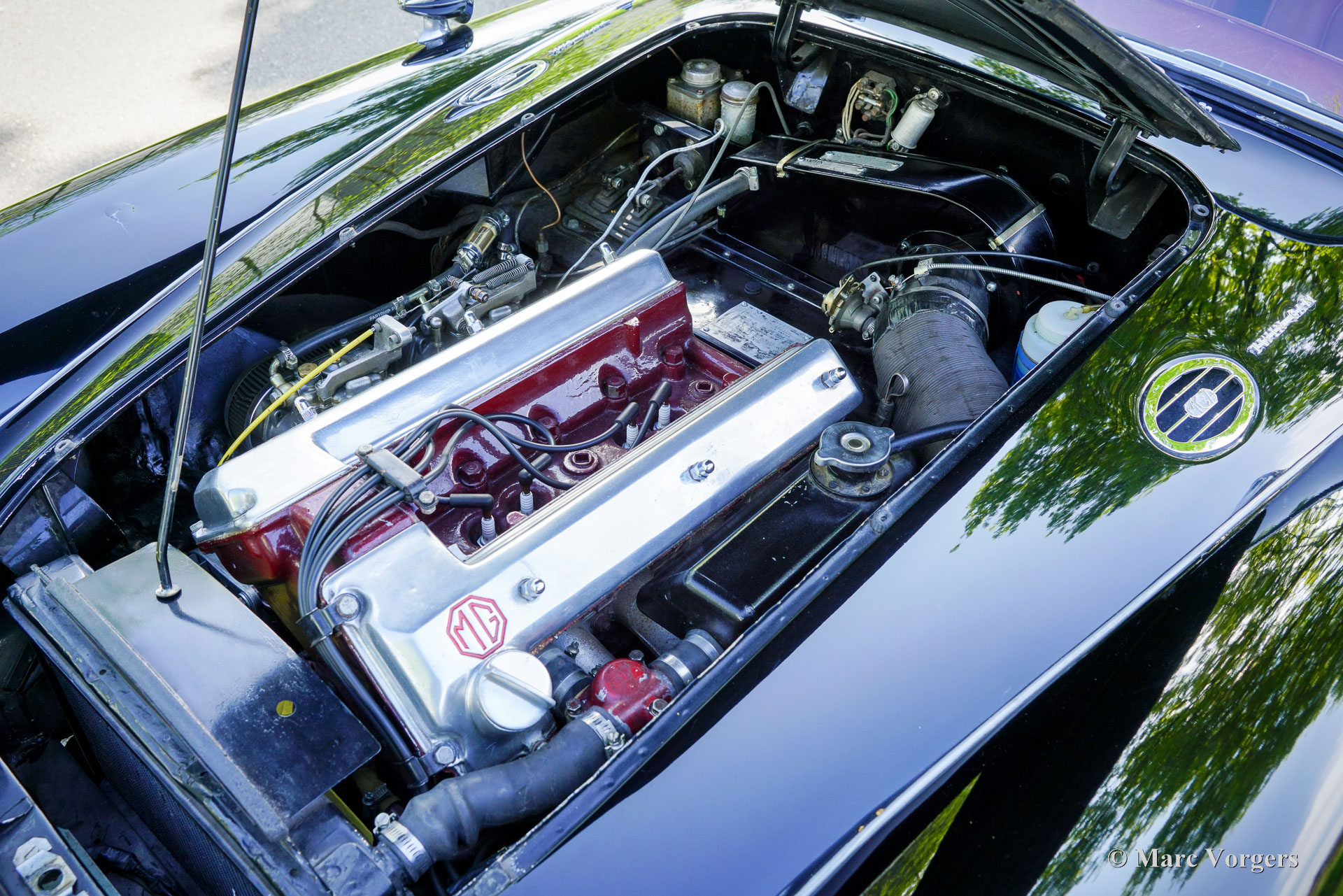 The year 1955 saw the introduction of the MGA. With this design the MG broke new grounds. After its predecessors MG TD and MG TF, which were largely based on the pre-war MG TB, it was a roadster with a very modern sporty design. Like its predecessors, the MGA was a great success and, like before, the greater part was sold in America. Until 1959, the MGA was equipped with a 1459 cc four-cylinder engine. From that year, the car was fitted with a 1588 cc four-cylinder. A 1622 cc four-cylinder engine replaced the 1588 cc. engine in 1961. The early MGA versions had very good drum brakes until 1959, but after that year, the MG A was equipped with disc brakes on the front wheels. April 1958 saw the introduction of a very special MGA; the Twin Cam. This MGA featured a special twin cam engine fitted with double overhead camshafts. The Twin Cam engine was based upon the standard 1500 B-series engine but extensively up rated and engineered. The engine block was fabricated of cast iron and the cylinder head was made of aluminium. The high revving Twin Cam engine delivered a power output of 108 bhp., 40 bhp more than the standard 1500 engine which delivered 68 bhp. Not only the engine was special, the car was also fitted with disc brakes all round and special Twin Cam disk wheels with central locking eared wheel nuts. Between 1958 and 1960 1788 MGA Twin Cam roadster models were build. The coupe is scarcer; only 323 units left the factory. The last MGA, a 1600 Mk II left the factory gate in May 1962. The MGA was succeeded by the MGB.