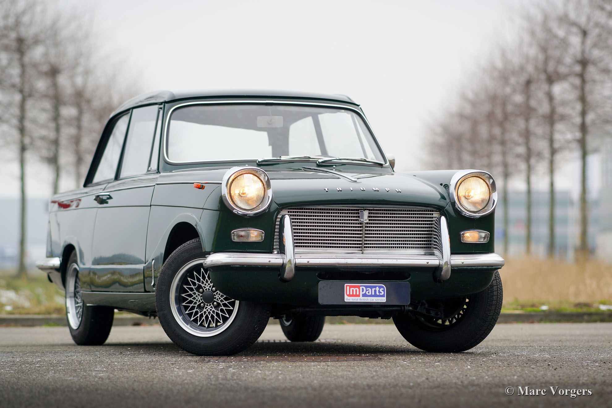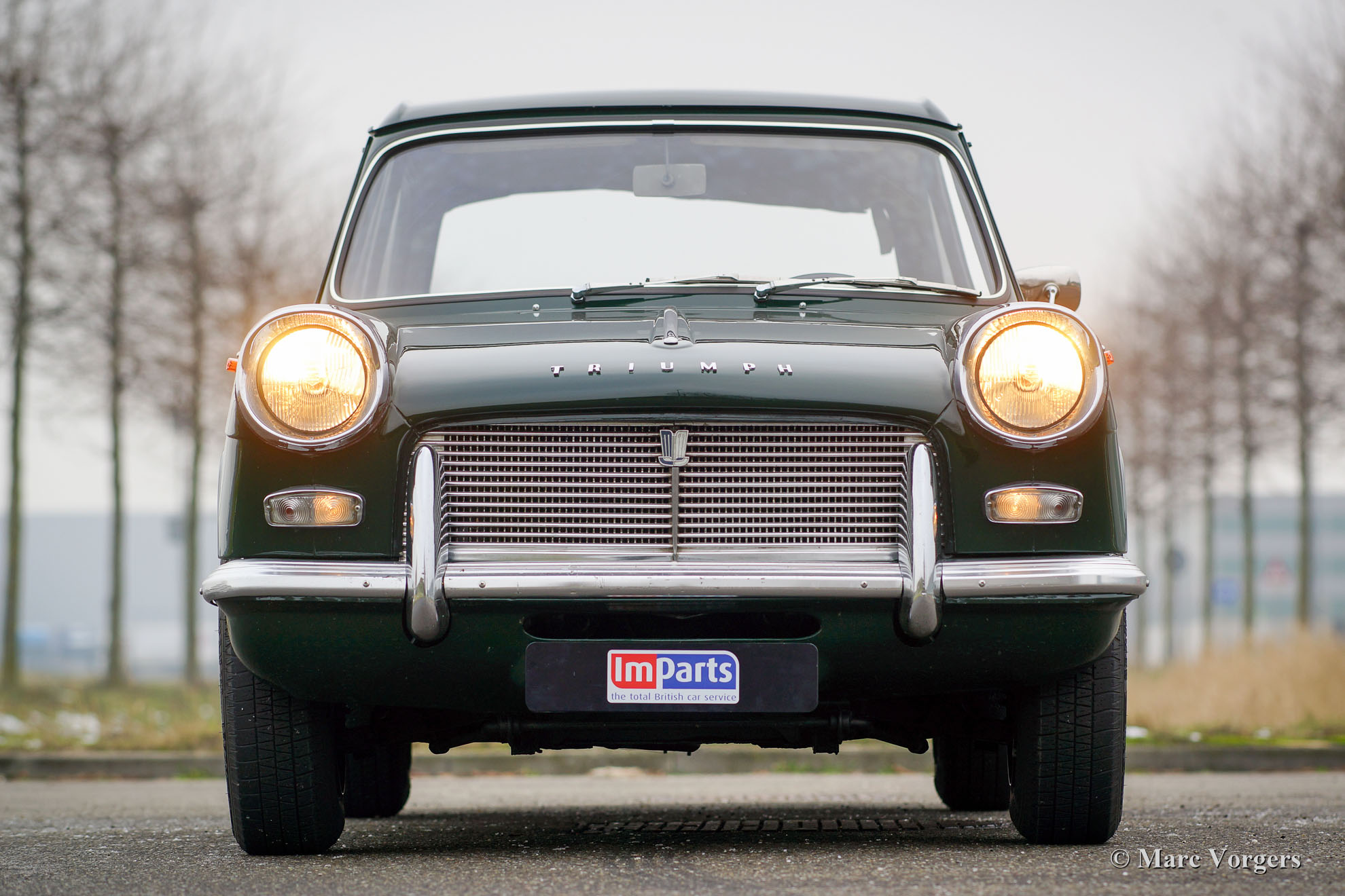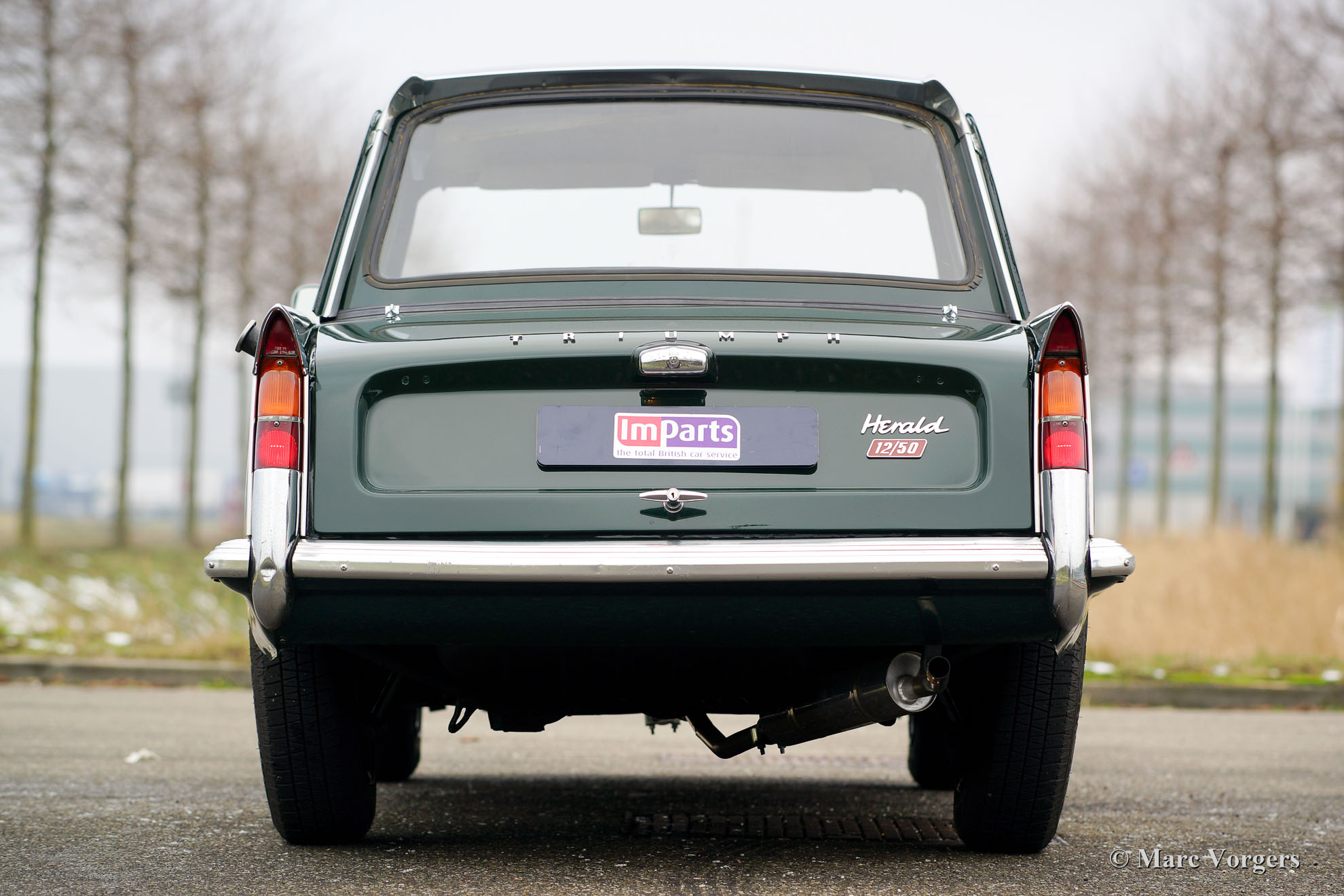 Triumph Herald 12/50, year 1966. Colour British Racing Green with a black leatherette interior. This very nice Triumph was sold new in Belgium. A few years ago the car found a new owner in the Netherlands. This Triumph Herald was restored a few years ago, the car is in very good condition and the car drives very well. The car features beautiful light alloy wheels which match the car beautifully, the original steel wheels with chrome hub-caps are also included.