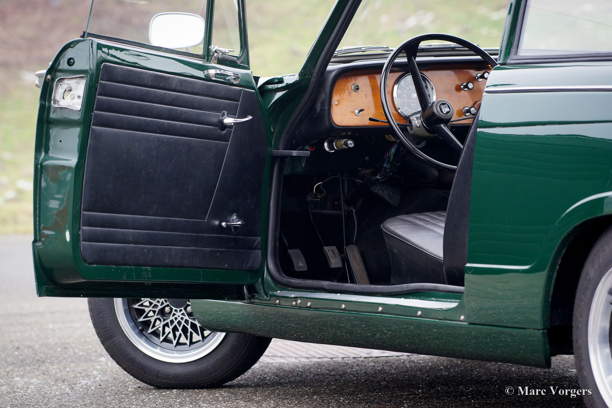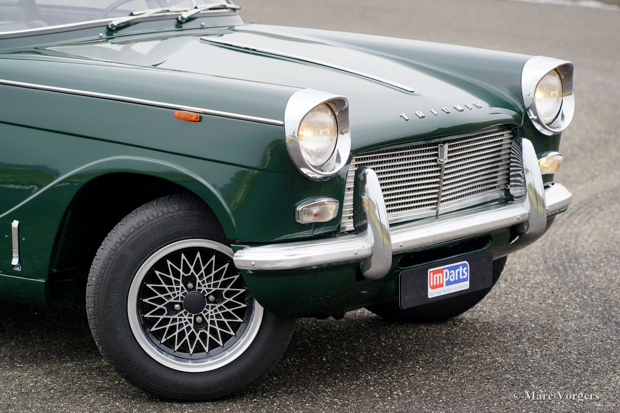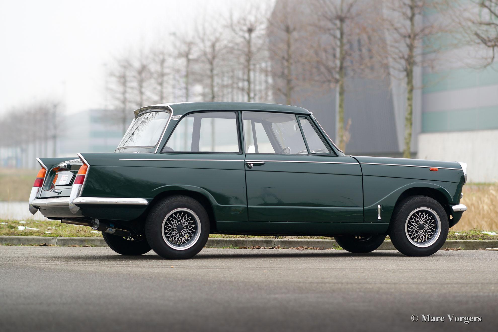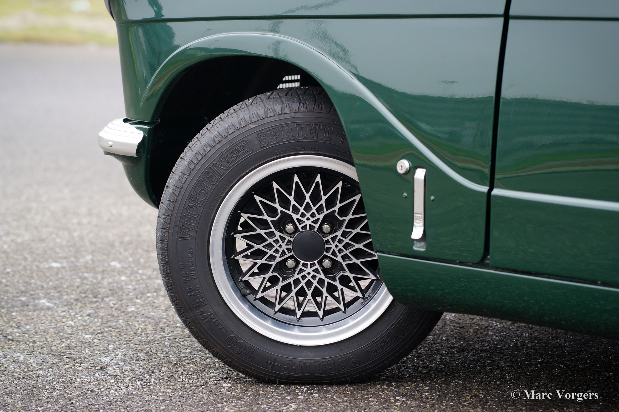 Triumph Herald 12/50, year 1966. Colour British Racing Green with a black leatherette interior. This very nice Triumph was sold new in Belgium. A few years ago the car found a new owner in the Netherlands. This Triumph Herald was restored a few years ago, the car is in very good condition and the car drives very well. The car features beautiful light alloy wheels which match the car beautifully, the original steel wheels with chrome hub-caps are also included.
