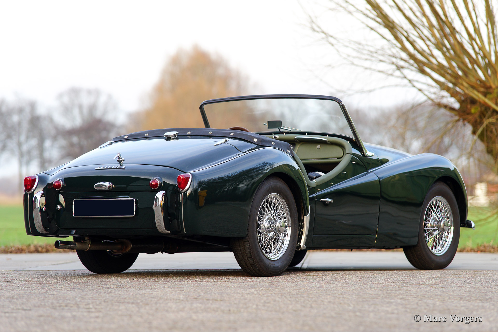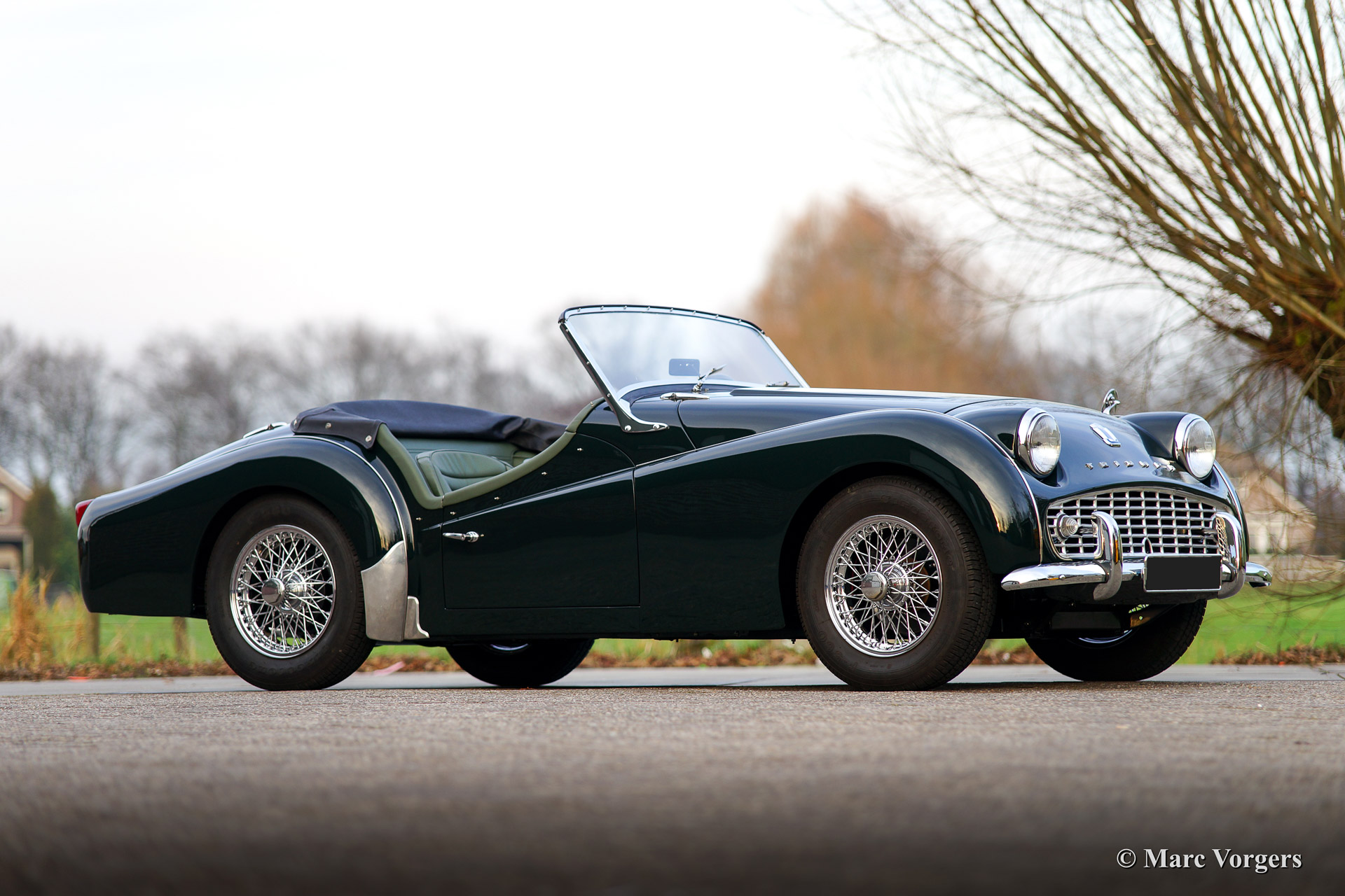 Triumph TR 3a, year 1959. Colour dark British Racing Green with a suede green leather interior. Black soft top and side screens. This fabulous TR 3a was extensively 'body off' restored and overhauled. This'Triumph Sports' is a very handsome car featuring chrome wire wheels and a sports steering wheel with wooden rim.