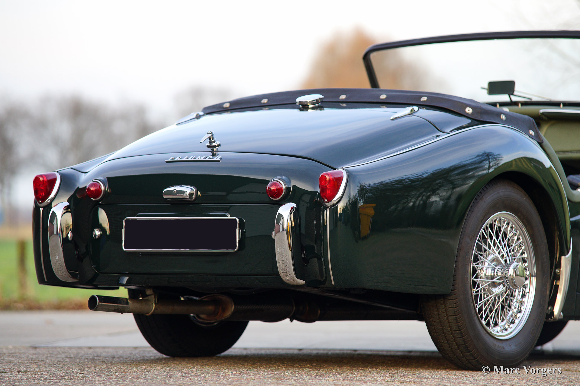 The Triumph TR 3 was uprated twice during the entire production period. In 1957 the car became a wider grille, door handles on the outside and slightly recessed headlamps and was named TR 3a then. In 1960-61 the cylinder capacity was enlarged to 2138 cc. giving a capacity of 104 bhp. and extra torque. Also the fully synchronized TR4 gearbox was incorporated. The car was then named TR 3b. The TR 3 is a pure two-person roadster, a classic generously giving you the fifties British sports car feeling, rough but honest. It comes with a simple soft-top for weather protection. Separate clip-on side screens can additionally be attached to the doors.