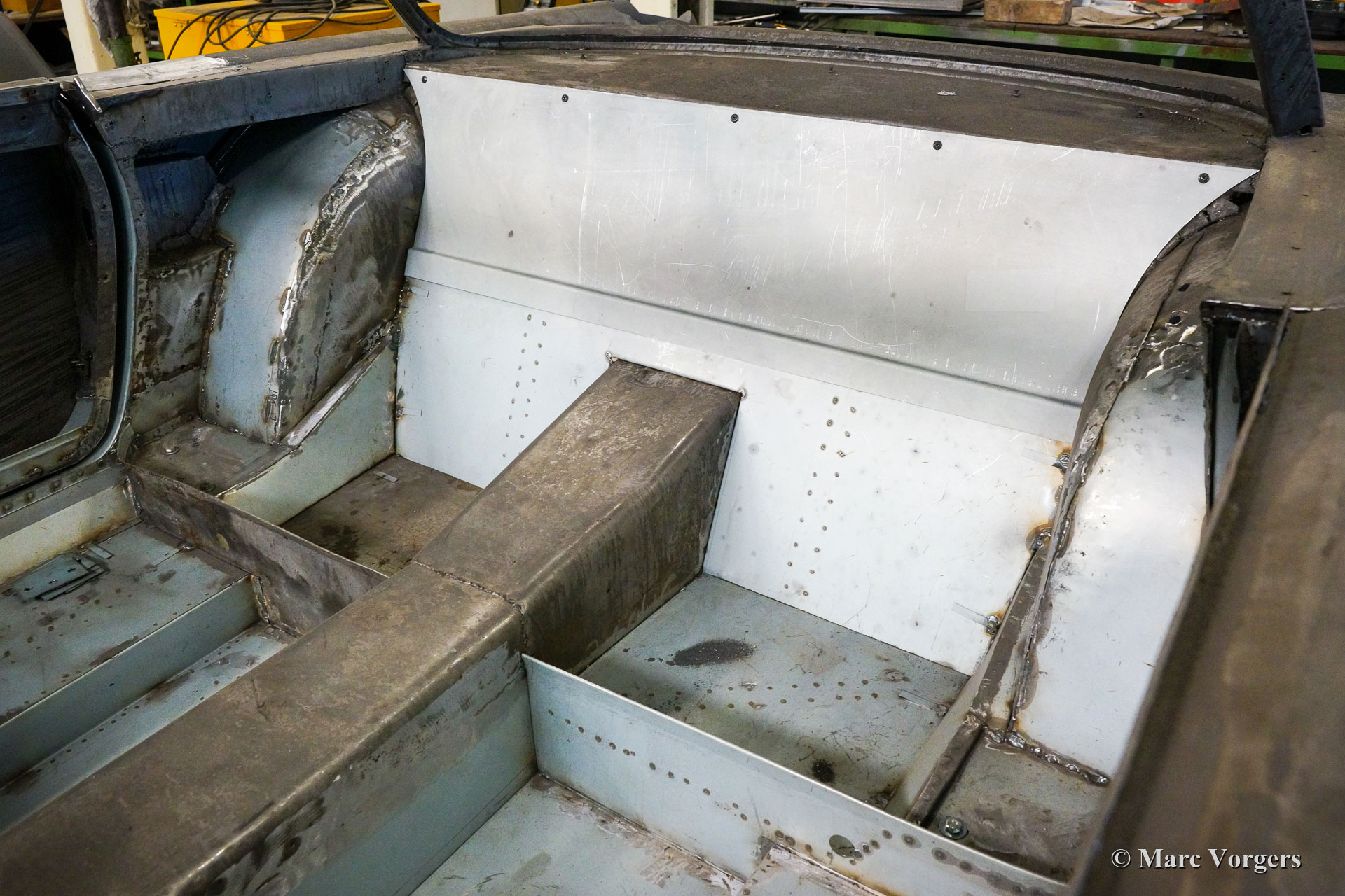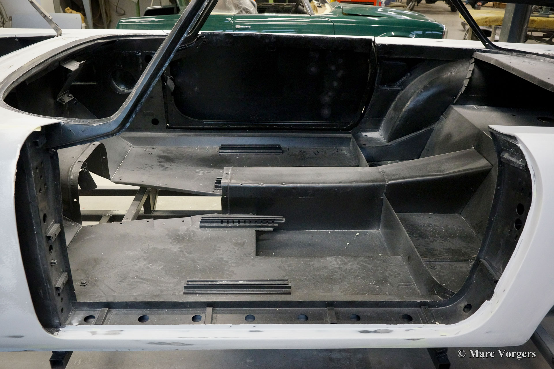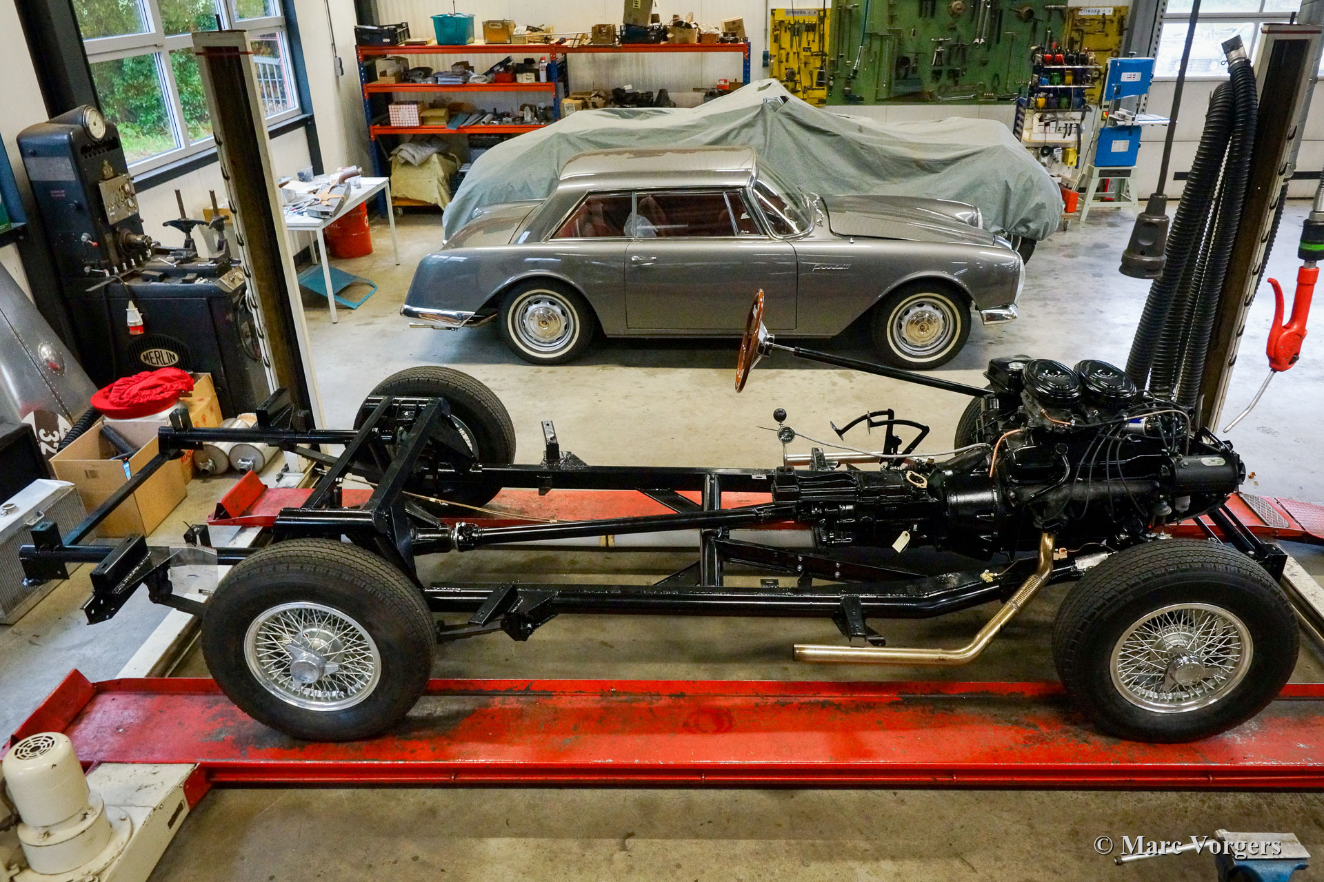 The restoration. The automobile was fully stripped. The body paint was stripped in a special bathing process. The body of this Facel II was rebuilt with new sheet metal up to the waistline. On the left side some sheet metal was renewed in the past (door and rear wing). Following the sheet metal restoration, the body was given a KTL (dipping bath) coating by a specialist firm. The KTL primer reaches all the metal surfaces of the body, also inside all the seams and hollow spaces. The V8 engine was fully overhauled and restored. In the photos you can see the mechanics busy assembling pistons on the connecting rods. The piston pins were cooled in dry ice to -78 degrees Celsius (shrinkage) while the connecting rods were heated to a few hundred degrees (expansion) at the location of the small end. The assembly must be done very quickly, after a few seconds the piston pin expands and the 'small end' shrinks, so that the piston pin stays firmly in place. The chassis was fully restored and completed with the fitment of the engine, gearbox, suspension, and all other mechanical components. As the bodywork returned KTL coated, the body was smoothened and painted. With the chassis and the body ‘married’ again the car was completed to send it to our upholstery partner. As the Facel II was returned to us the windshield and the final interior and exterior parts were fitted. After that the car was tested and adjusted during 500 testing kilometres before it was delivered to its owner.