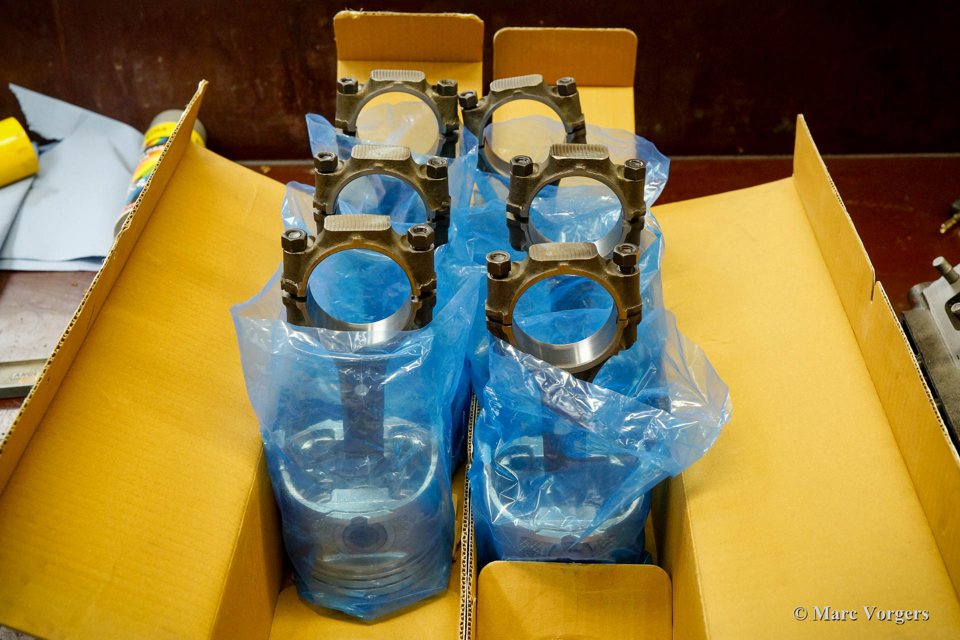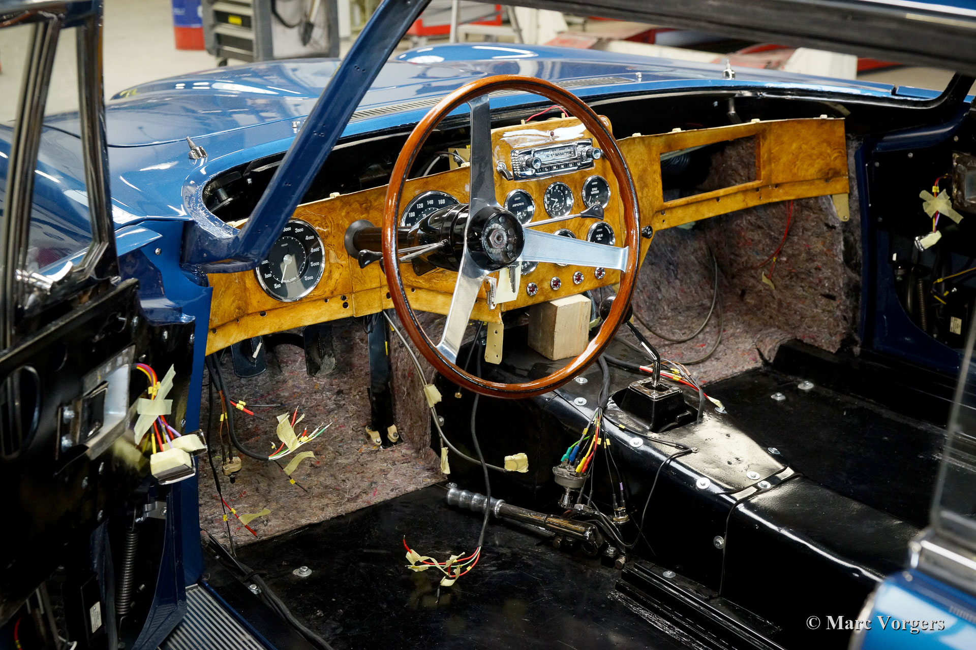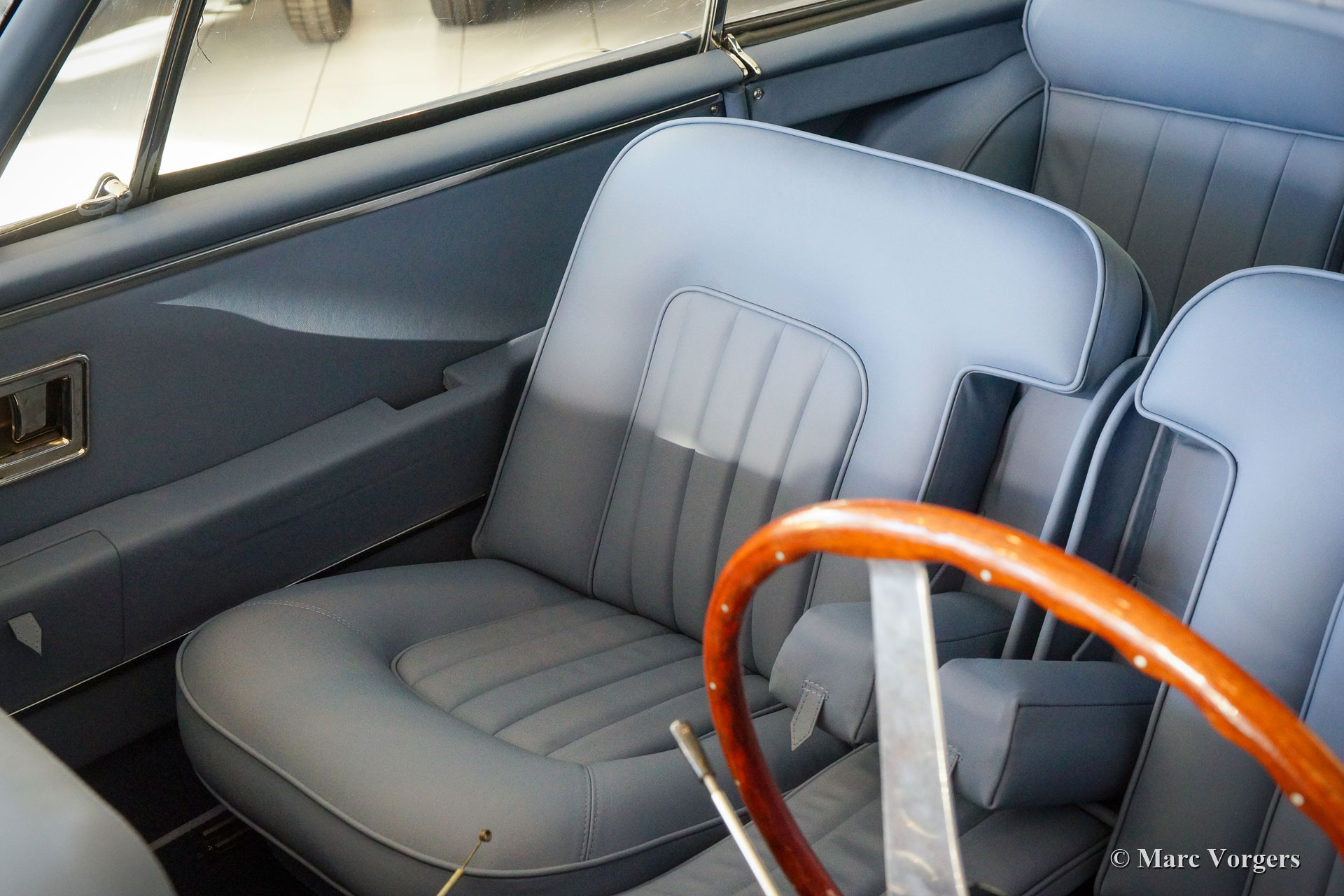 The restoration. The automobile was fully stripped. The body paint was stripped in a special bathing process. The body of this Facel II was rebuilt with new sheet metal up to the waistline. On the left side some sheet metal was renewed in the past (door and rear wing). Following the sheet metal restoration, the body was given a KTL (dipping bath) coating by a specialist firm. The KTL primer reaches all the metal surfaces of the body, also inside all the seams and hollow spaces. The V8 engine was fully overhauled and restored. In the photos you can see the mechanics busy assembling pistons on the connecting rods. The piston pins were cooled in dry ice to -78 degrees Celsius (shrinkage) while the connecting rods were heated to a few hundred degrees (expansion) at the location of the small end. The assembly must be done very quickly, after a few seconds the piston pin expands and the 'small end' shrinks, so that the piston pin stays firmly in place. The chassis was fully restored and completed with the fitment of the engine, gearbox, suspension, and all other mechanical components. As the bodywork returned KTL coated, the body was smoothened and painted. With the chassis and the body ‘married’ again the car was completed to send it to our upholstery partner. As the Facel II was returned to us the windshield and the final interior and exterior parts were fitted. After that the car was tested and adjusted during 500 testing kilometres before it was delivered to its owner.