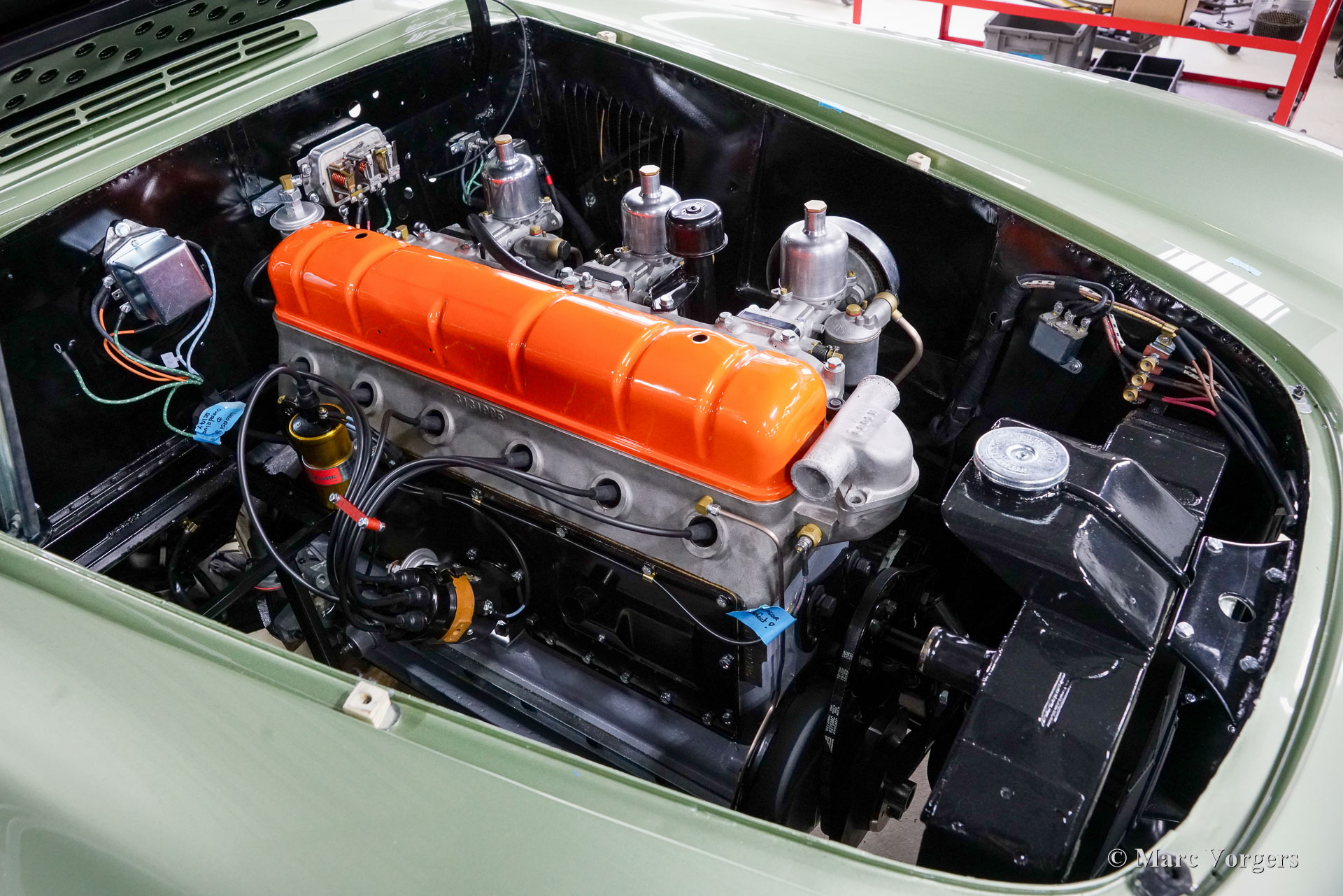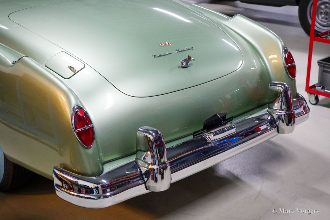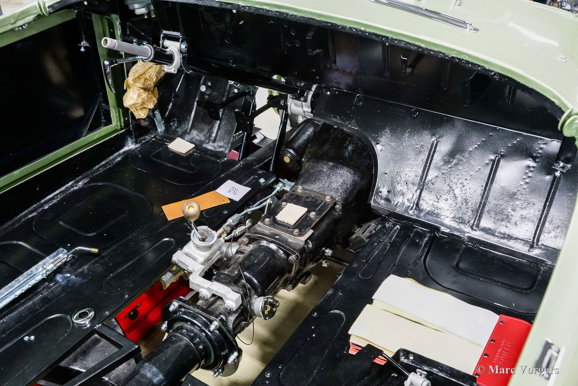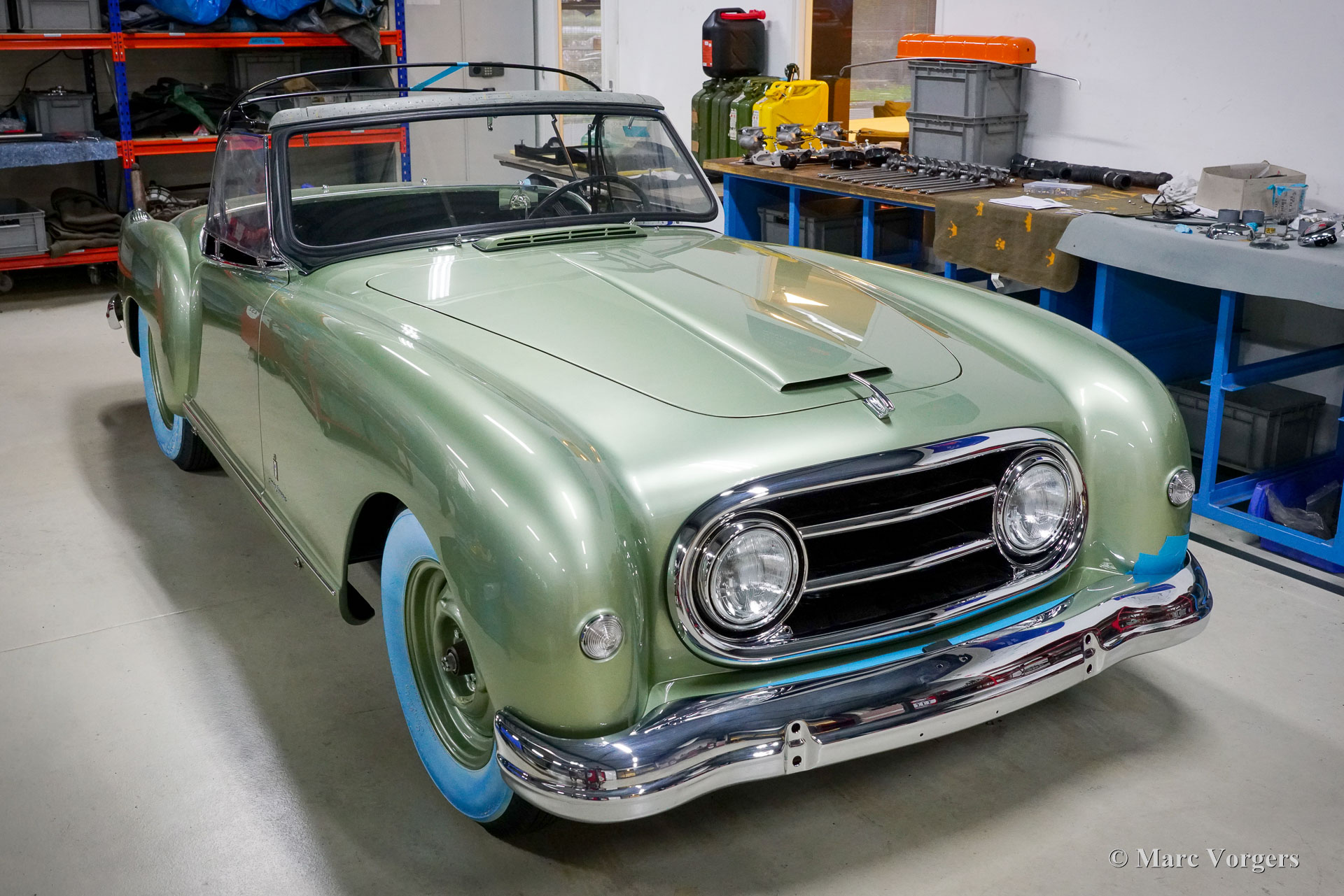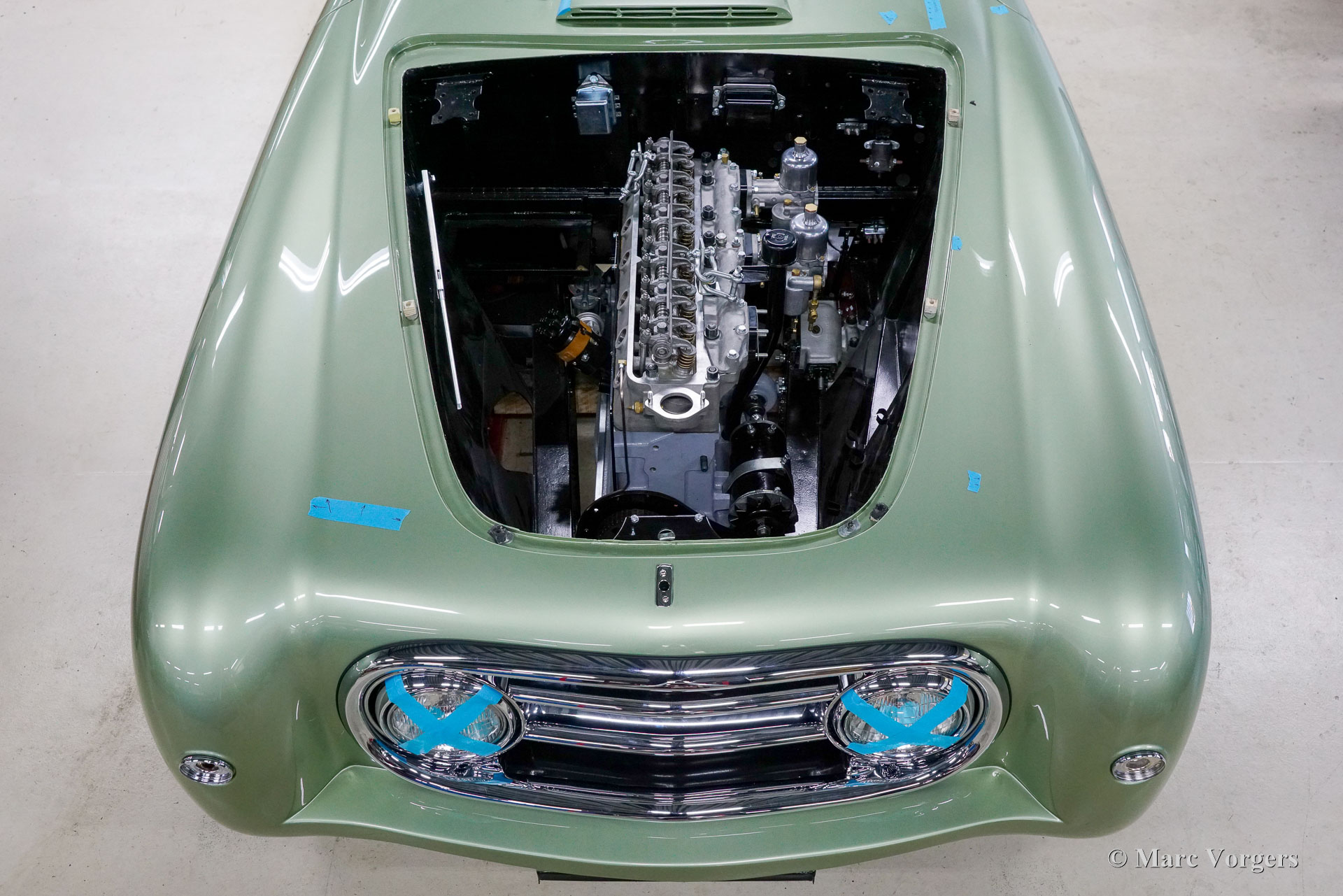 This rare and gorgeous 1953 Nash Healey Pininfarina Roadster was sold new in the USA. A few years back the automobile was found in a complete and still fully functional condition. The car was finished in white with a two-tone blue/ grey interior and a black vinyl hood. All the original details were still present. The Nash Healey was completely dismantled, and our craftsmen had to work many hours restoring the sheet metal of the bodywork starting from the bare metal. After that, the bodywork was passed over in the skilled hands of our partner paint shop to receive a top-class light green metallic 2K paint system and a gloss black protective underbody coating. In the meantime, all the mechanical components were cleaned, overhauled, and rebuilt by the specialists in our technical workshop. The 4.1 Litre straight six engine was slightly modified to deliver a few more horsepower, and to increase the reliability. A new induction manifold was engineered and cast to accommodate 3 S.U. H6 carburettors instead of the original two Carter carbs. The gearbox, differential, rear axle, and drive axle were overhauled and painted in the correct colours. The very special Healey independent front suspension system was also fully rebuilt. This wonderful Nash Healey project is being carried out to the highest concours standards of perfection.