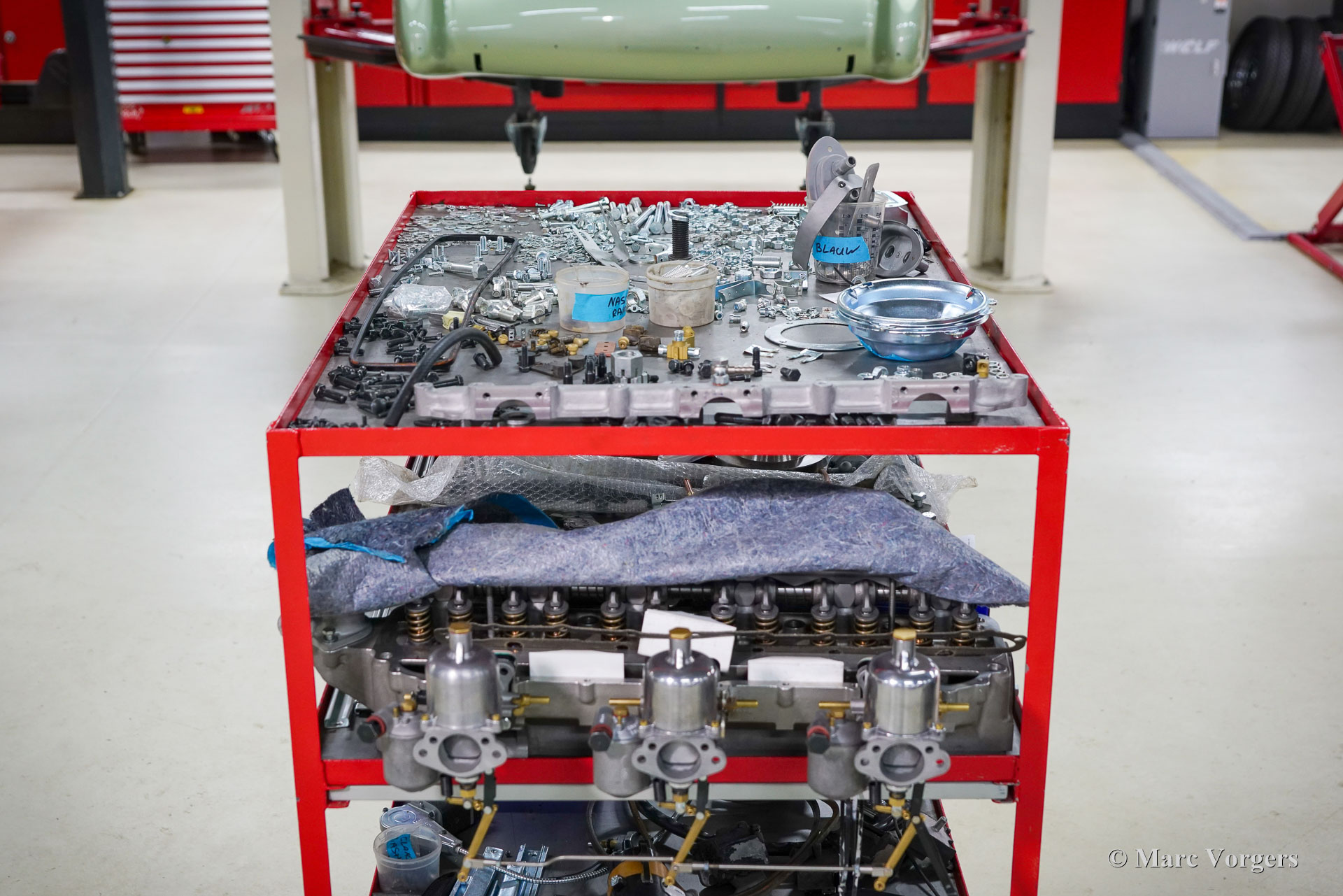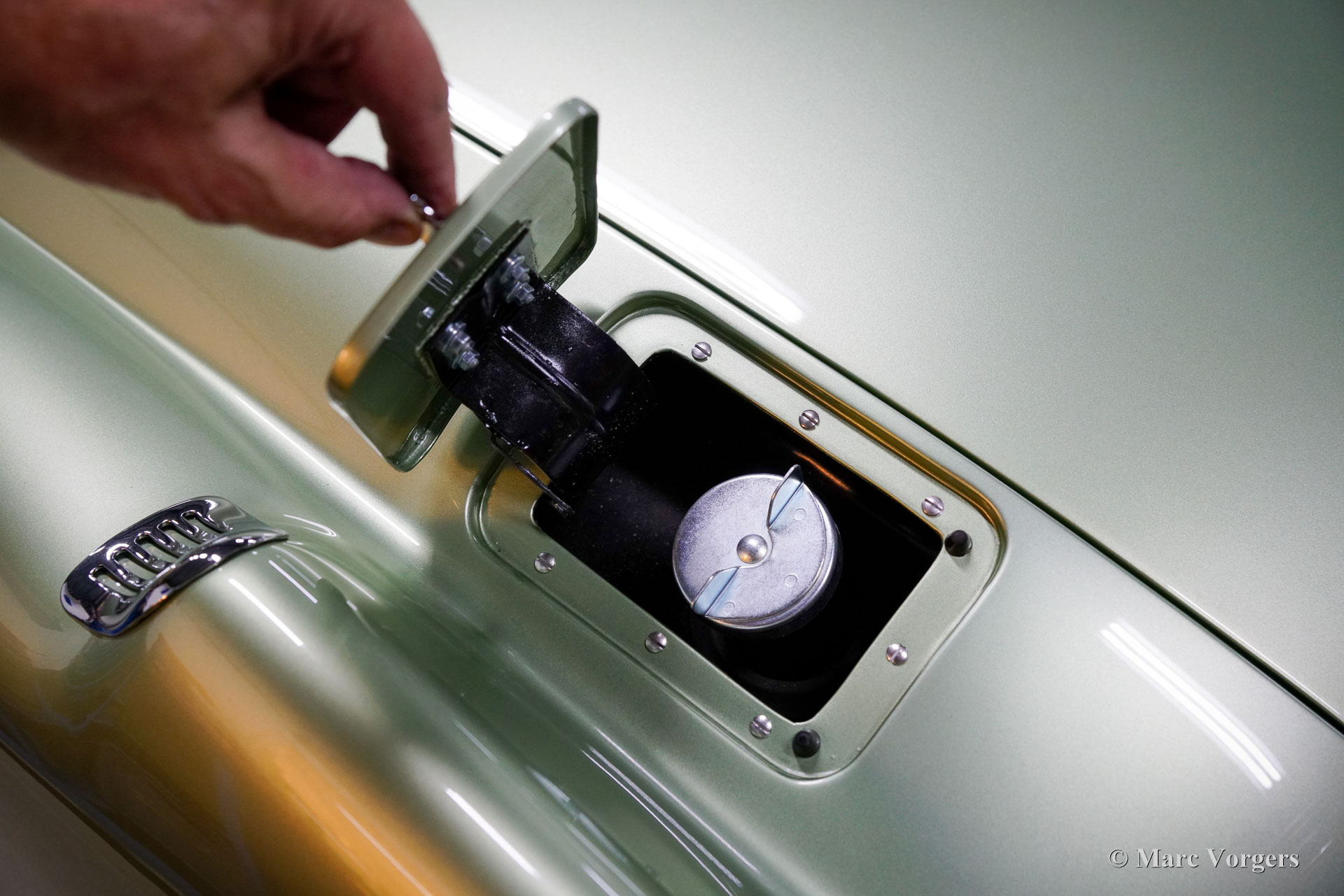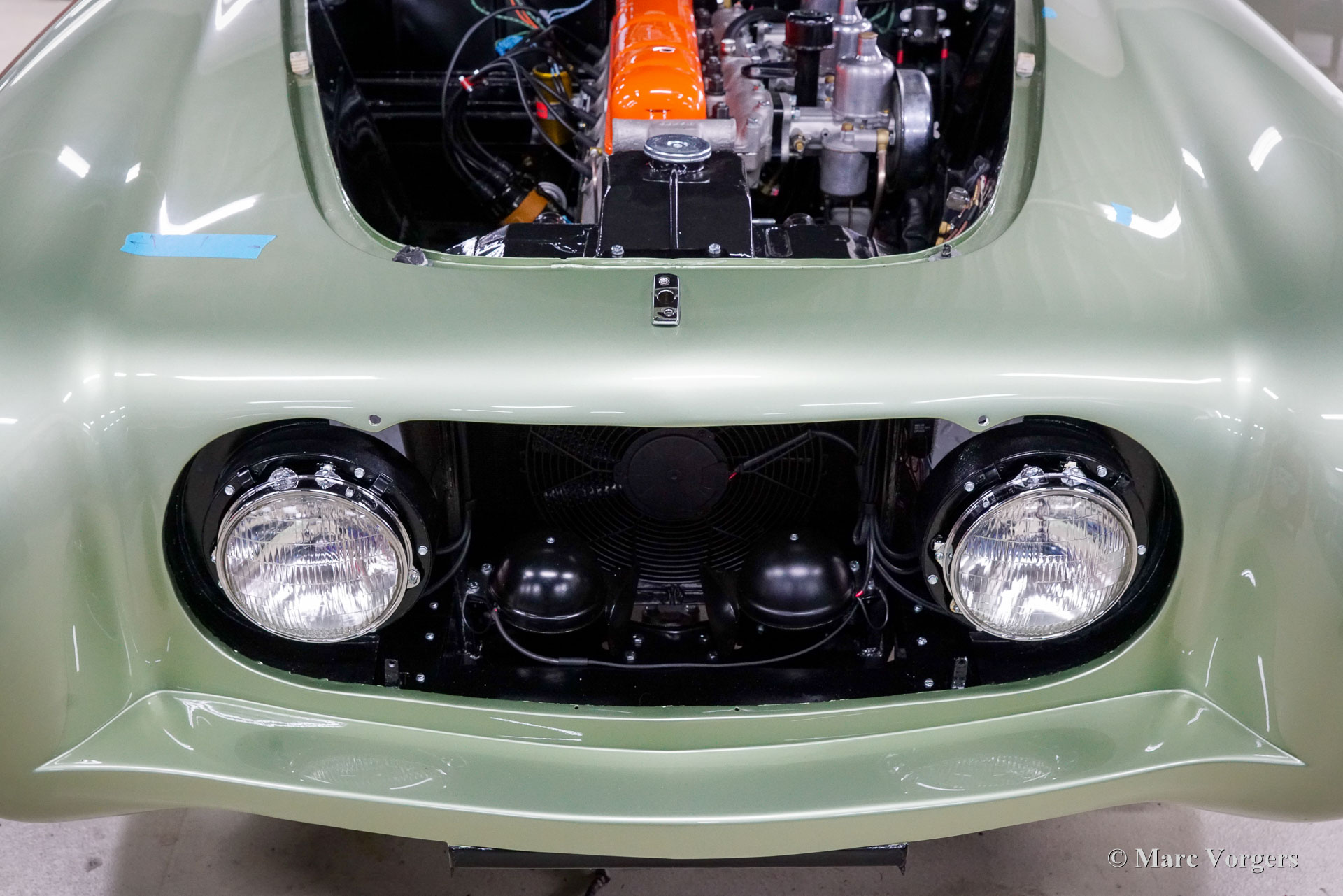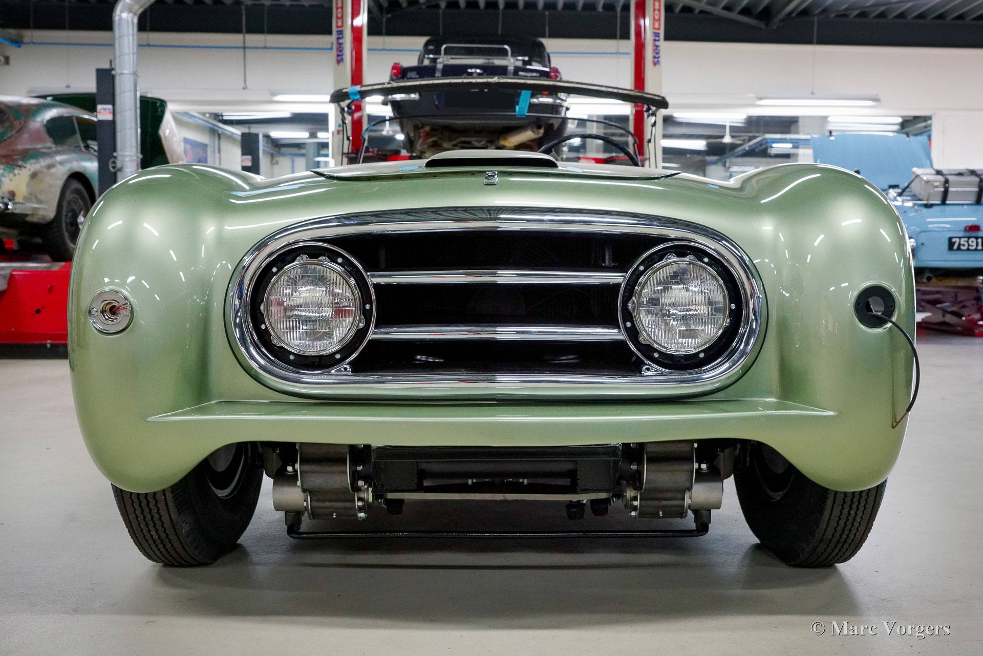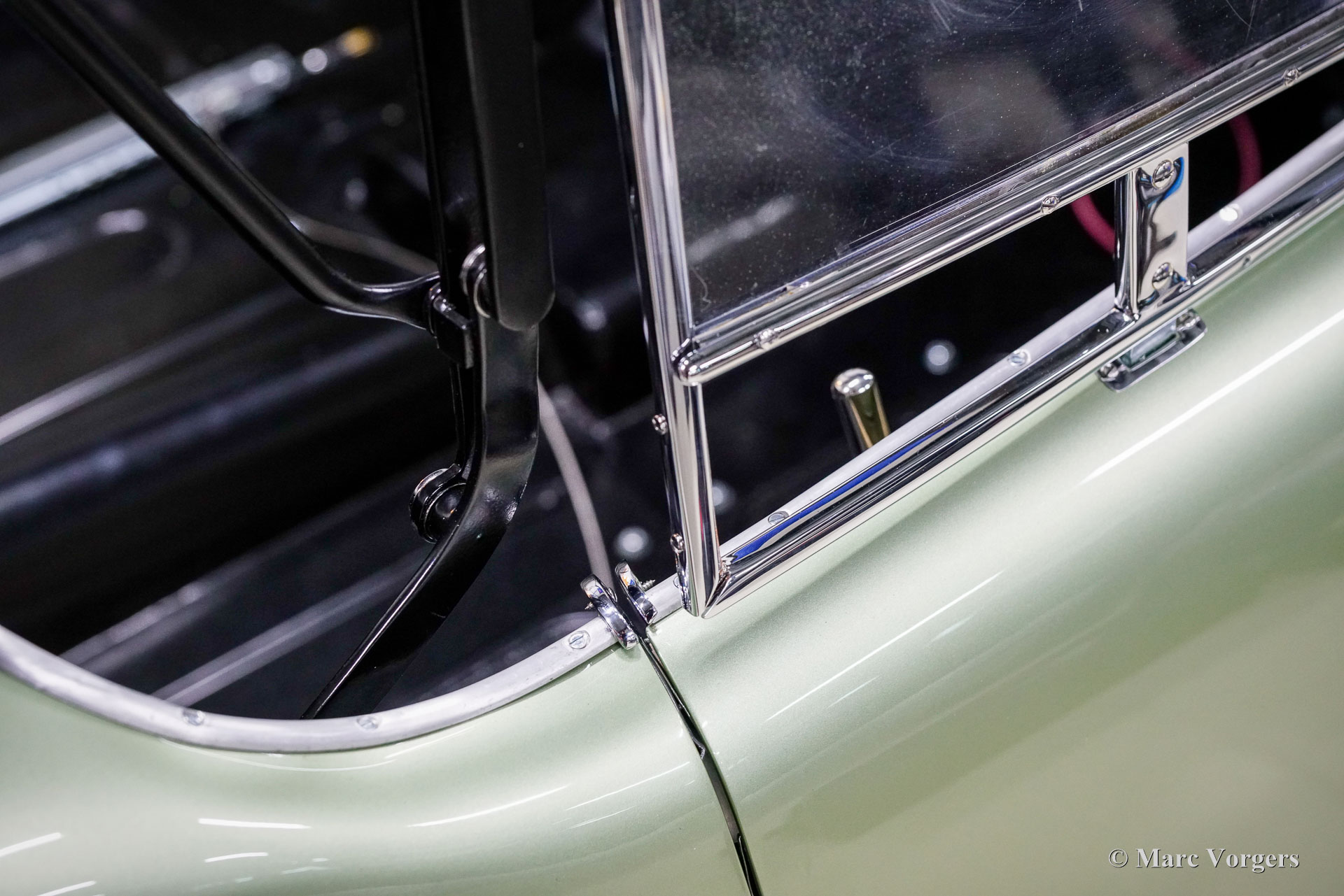 This rare and gorgeous 1953 Nash Healey Pininfarina Roadster was sold new in the USA. A few years back the automobile was found in a complete and still fully functional condition. The car was finished in white with a two-tone blue/ grey interior and a black vinyl hood. All the original details were still present. The Nash Healey was completely dismantled, and our craftsmen had to work many hours restoring the sheet metal of the bodywork starting from the bare metal. After that, the bodywork was passed over in the skilled hands of our partner paint shop to receive a top-class light green metallic 2K paint system and a gloss black protective underbody coating. In the meantime, all the mechanical components were cleaned, overhauled, and rebuilt by the specialists in our technical workshop. The 4.1 Litre straight six engine was slightly modified to deliver a few more horsepower, and to increase the reliability. A new induction manifold was engineered and cast to accommodate 3 S.U. H6 carburettors instead of the original two Carter carbs. The gearbox, differential, rear axle, and drive axle were overhauled and painted in the correct colours. The very special Healey independent front suspension system was also fully rebuilt. This wonderful Nash Healey project is being carried out to the highest concours standards of perfection.