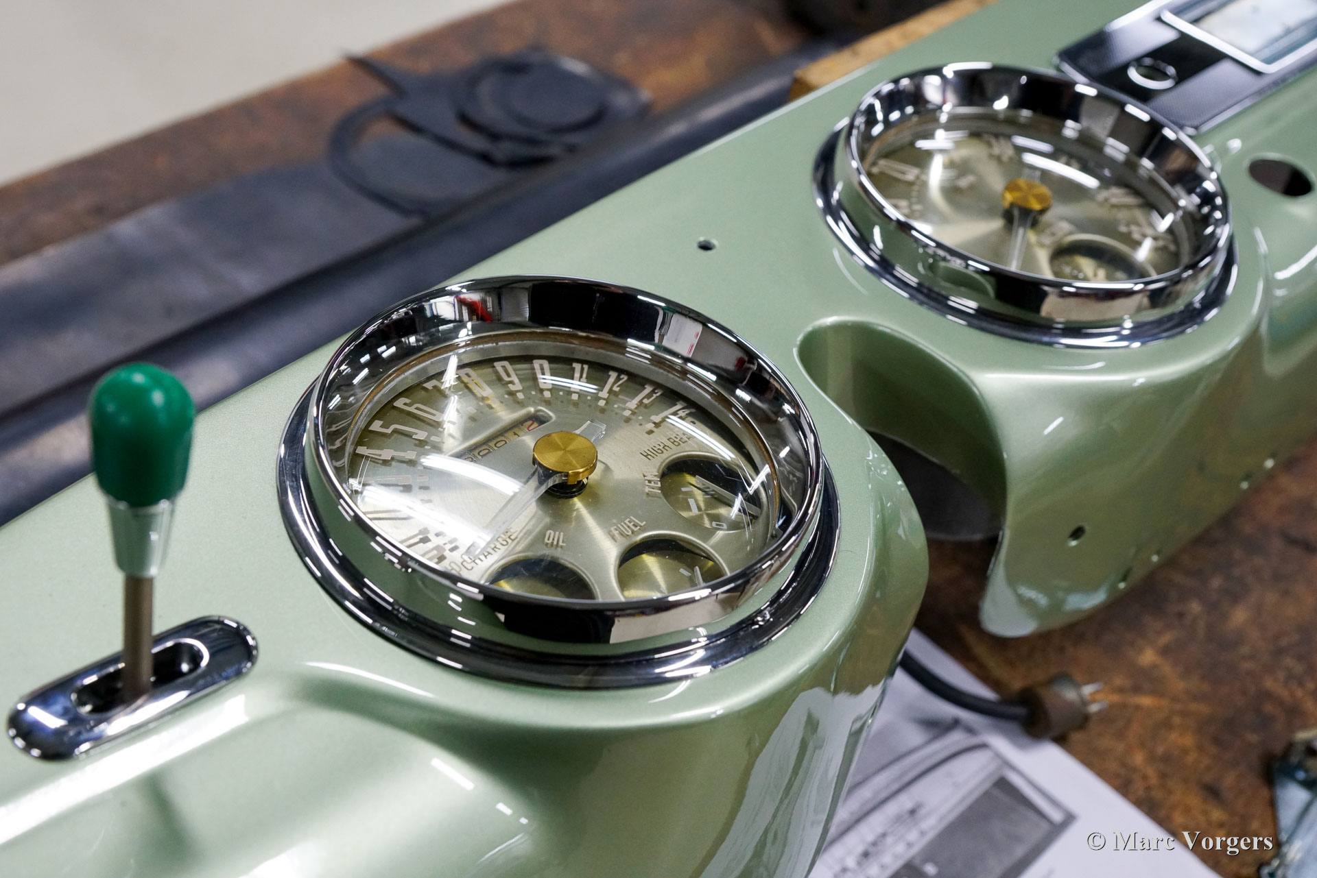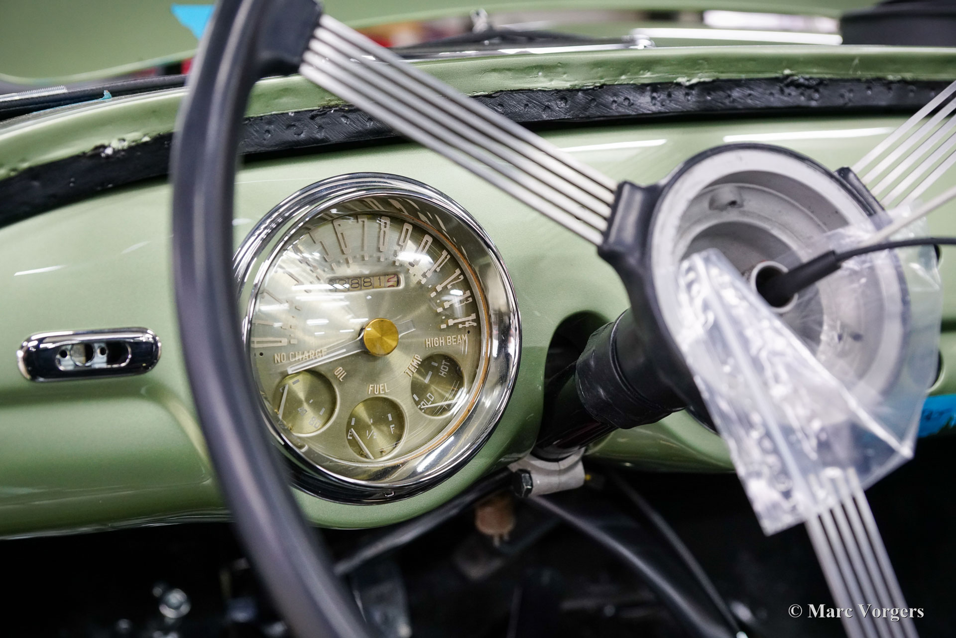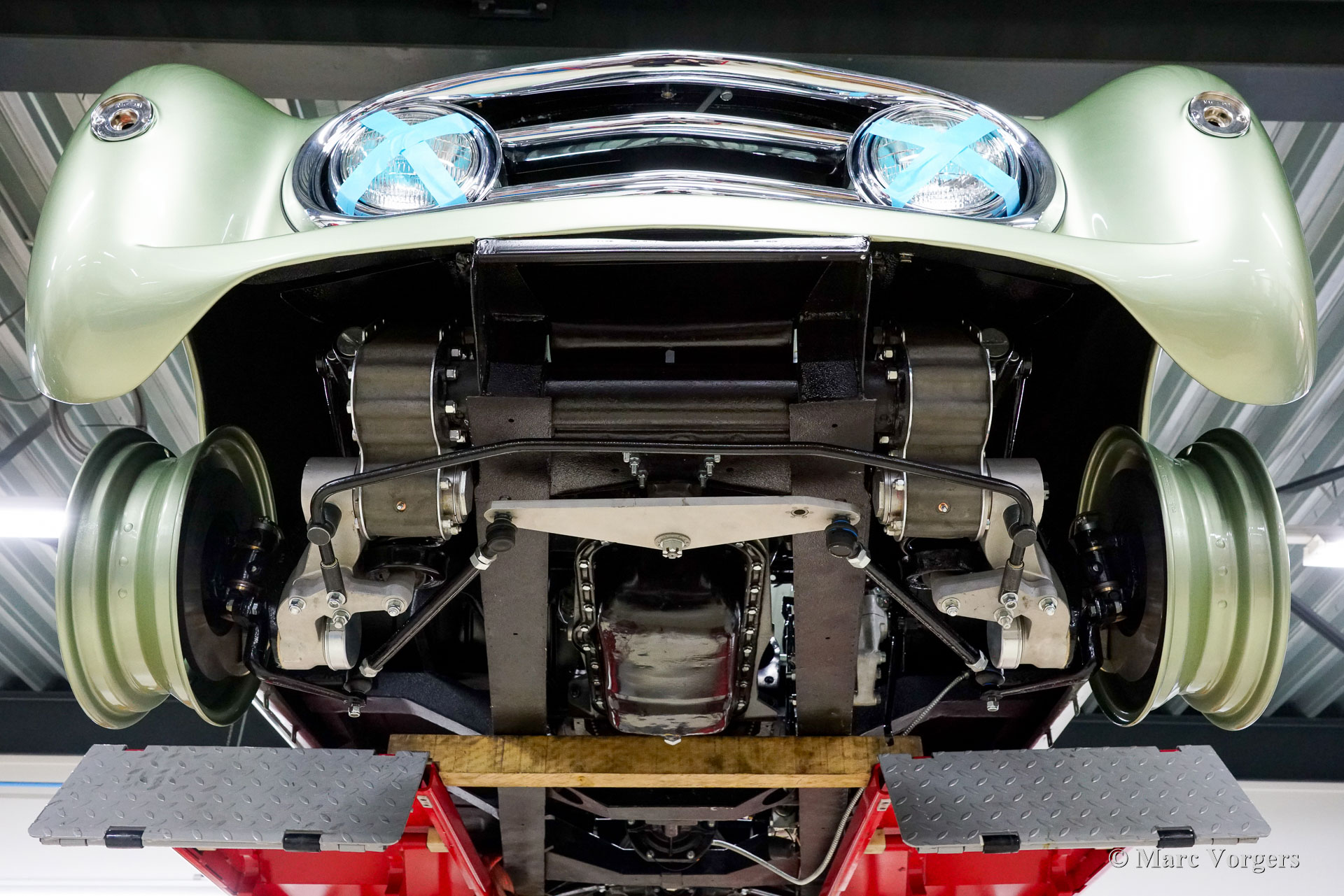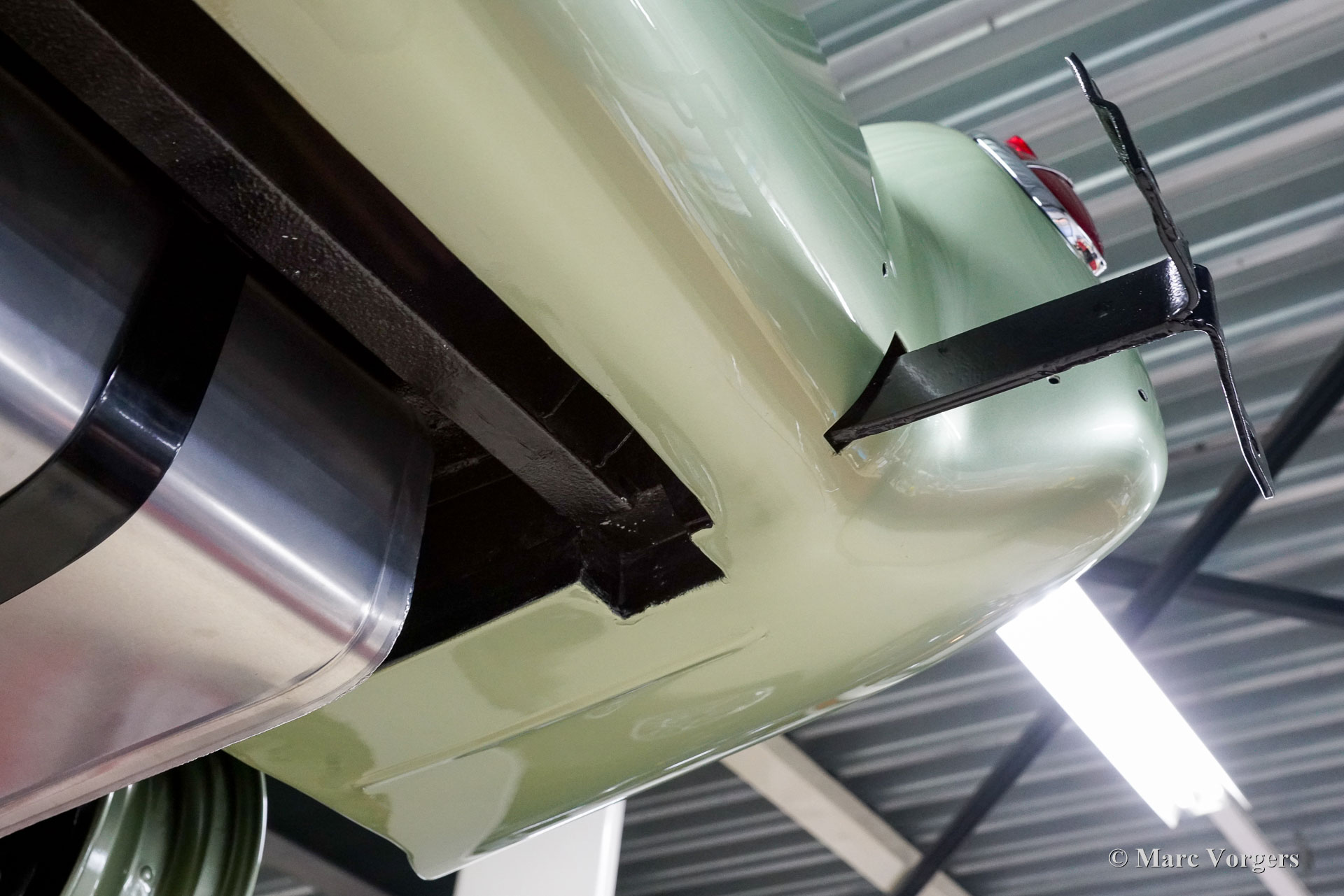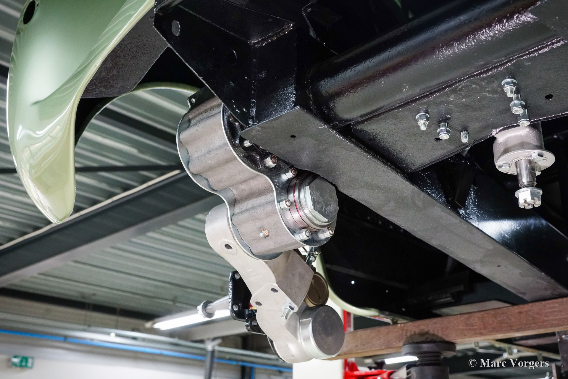 This rare and gorgeous 1953 Nash Healey Pininfarina Roadster was sold new in the USA. A few years back the automobile was found in a complete and still fully functional condition. The car was finished in white with a two-tone blue/ grey interior and a black vinyl hood. All the original details were still present. The Nash Healey was completely dismantled, and our craftsmen had to work many hours restoring the sheet metal of the bodywork starting from the bare metal. After that, the bodywork was passed over in the skilled hands of our partner paint shop to receive a top-class light green metallic 2K paint system and a gloss black protective underbody coating. In the meantime, all the mechanical components were cleaned, overhauled, and rebuilt by the specialists in our technical workshop. The 4.1 Litre straight six engine was slightly modified to deliver a few more horsepower, and to increase the reliability. A new induction manifold was engineered and cast to accommodate 3 S.U. H6 carburettors instead of the original two Carter carbs. The gearbox, differential, rear axle, and drive axle were overhauled and painted in the correct colours. The very special Healey independent front suspension system was also fully rebuilt. This wonderful Nash Healey project is being carried out to the highest concours standards of perfection.