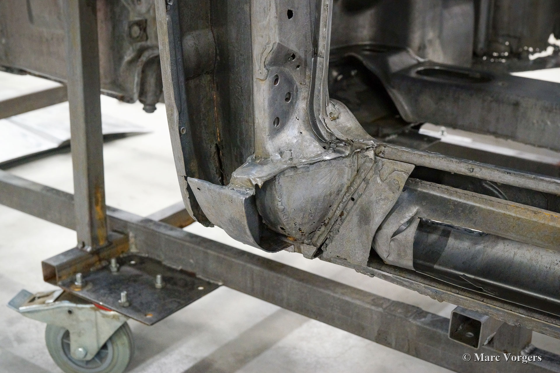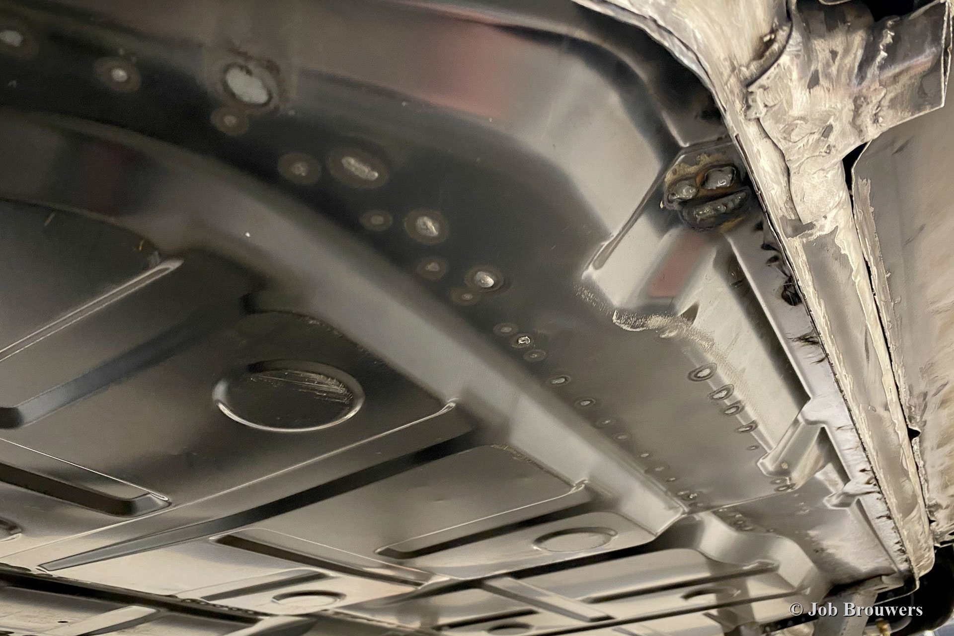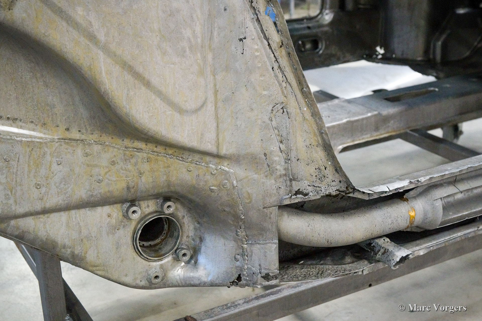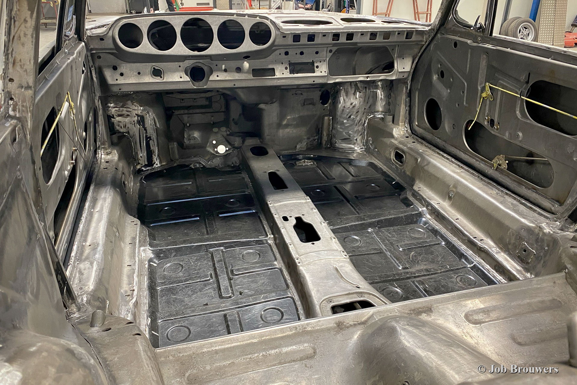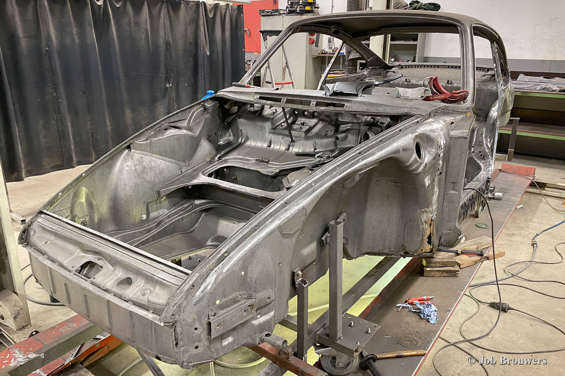 This 1968 Porsche 911 2 Litre Short Wheelbase (SWB) has received a full body restoration by Classic Job. As the owner purchased the car it looked quite a picture as it was 'restored' in the past. Soon it became clear that the quality of the bodywork was not as it should be, and the car was brought to classic Job to set things right. The floor panels were found to be 'doubled' so the owner decided to have the bodywork restored properly. The car was stripped, and the bodywork was sent off to have all the paint and coatings stripped off in a special bath. In the photos you can now see the 'naked' bodywork and all the badly executed sheet metal work that was done to it and all the remaining rust. The floor panels were cut out before the paint was fully stripped. A lot of sheet metal work was carried out.