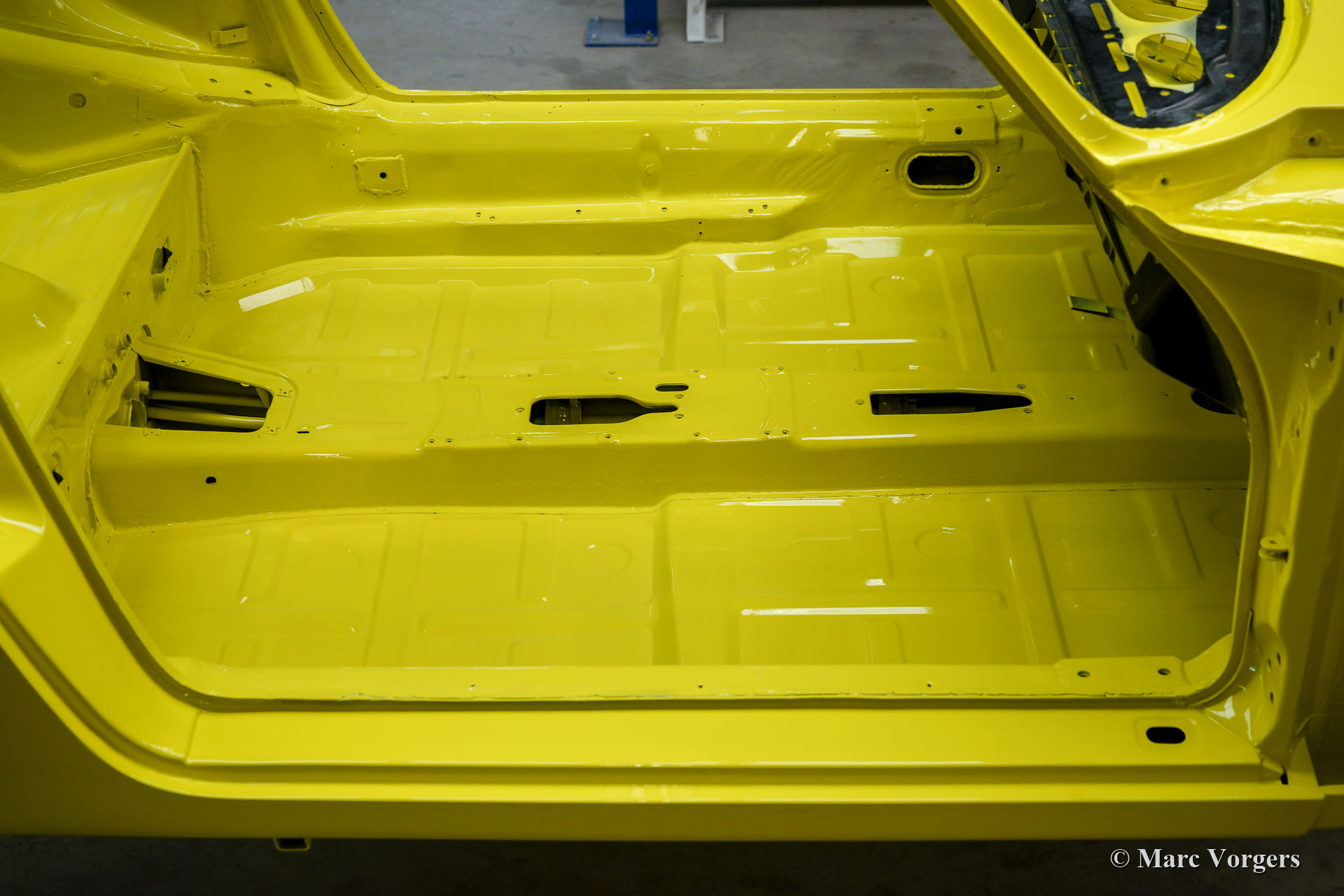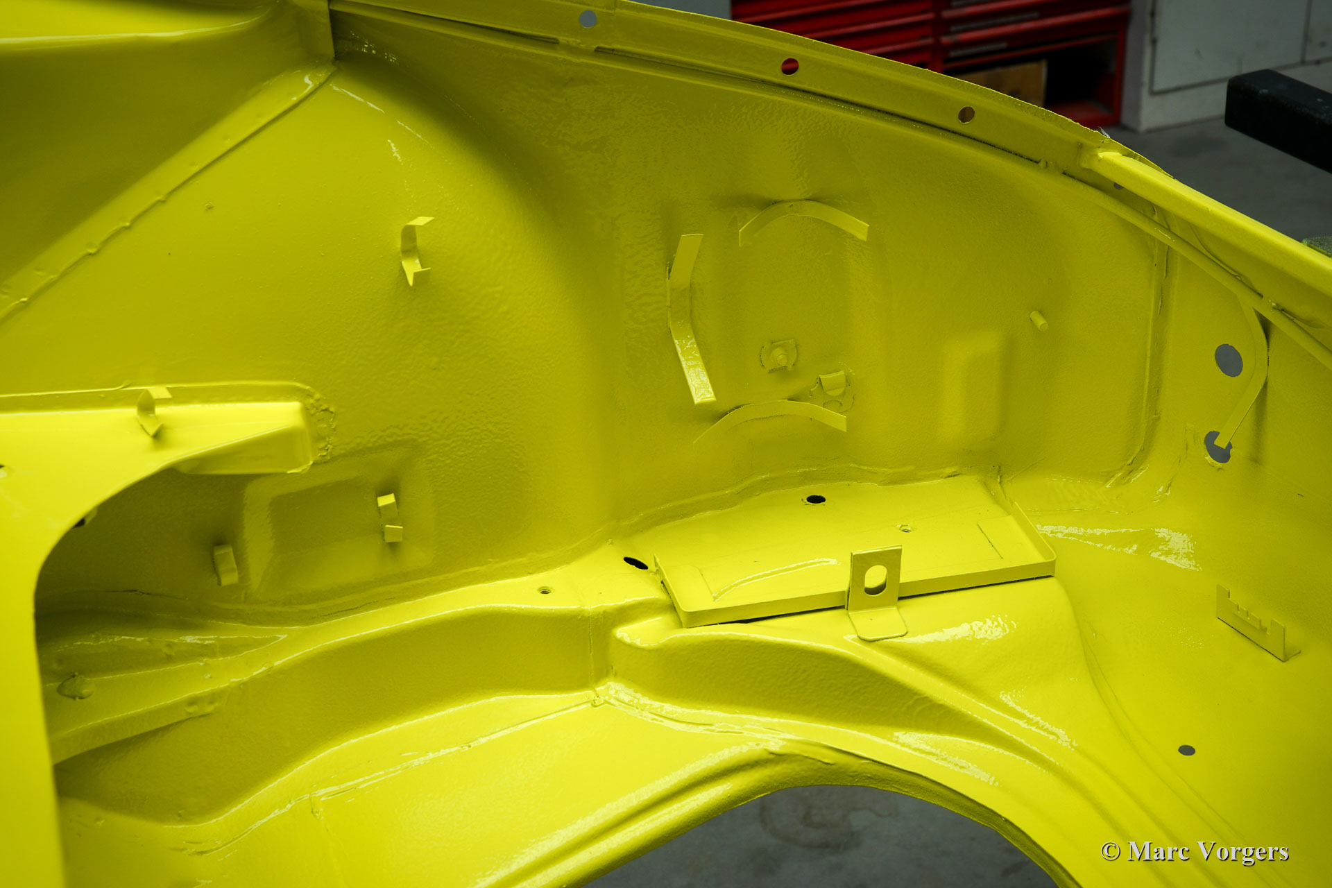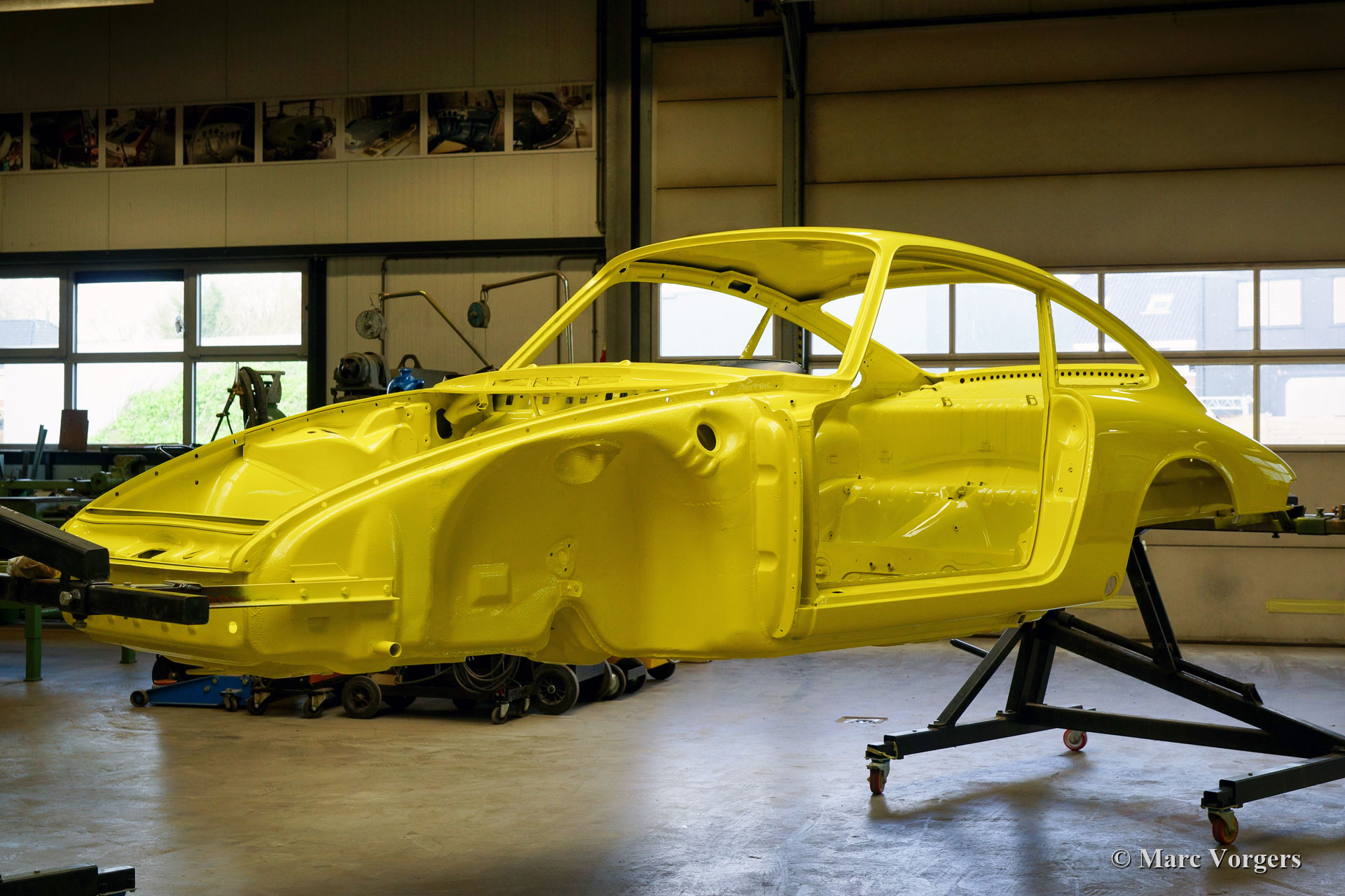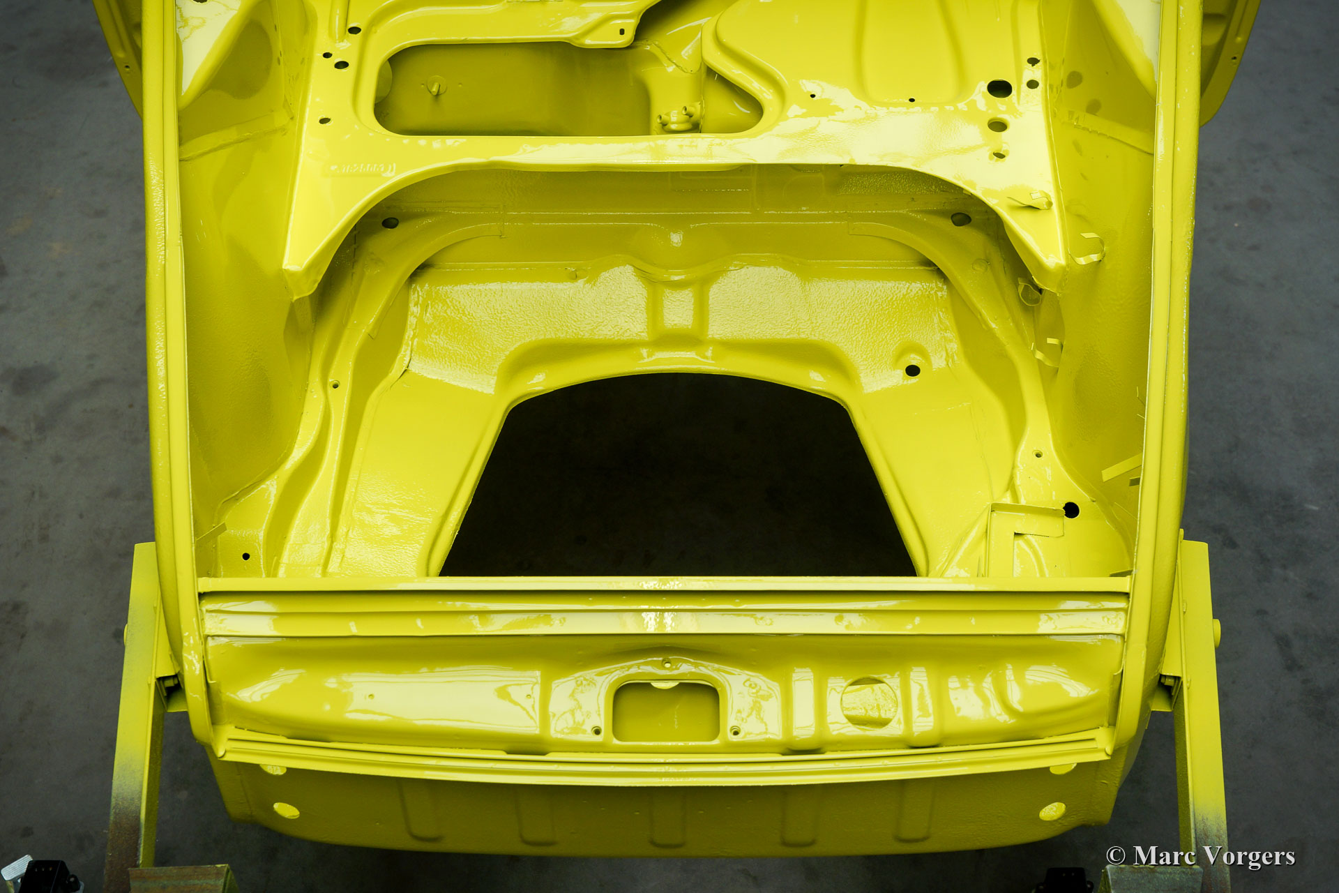 After completion of the sheet metal work the body was given a black KTL coating (primer) in a dip bath. This way, the coating covers the sheet metal inside and out, also in the seams and in the smallest hollow spaces. After that, the body was smoothened, primed and given a perfect paintjob in lemon yellow. After that, the car was rebuilt with the cleaned and refurbished original parts that were present before the restoration. Wear parts and rubbers have of course been replaced during construction. Here you have an excellent opportunity to study a Porsche 911 F-series SWB body in detail!