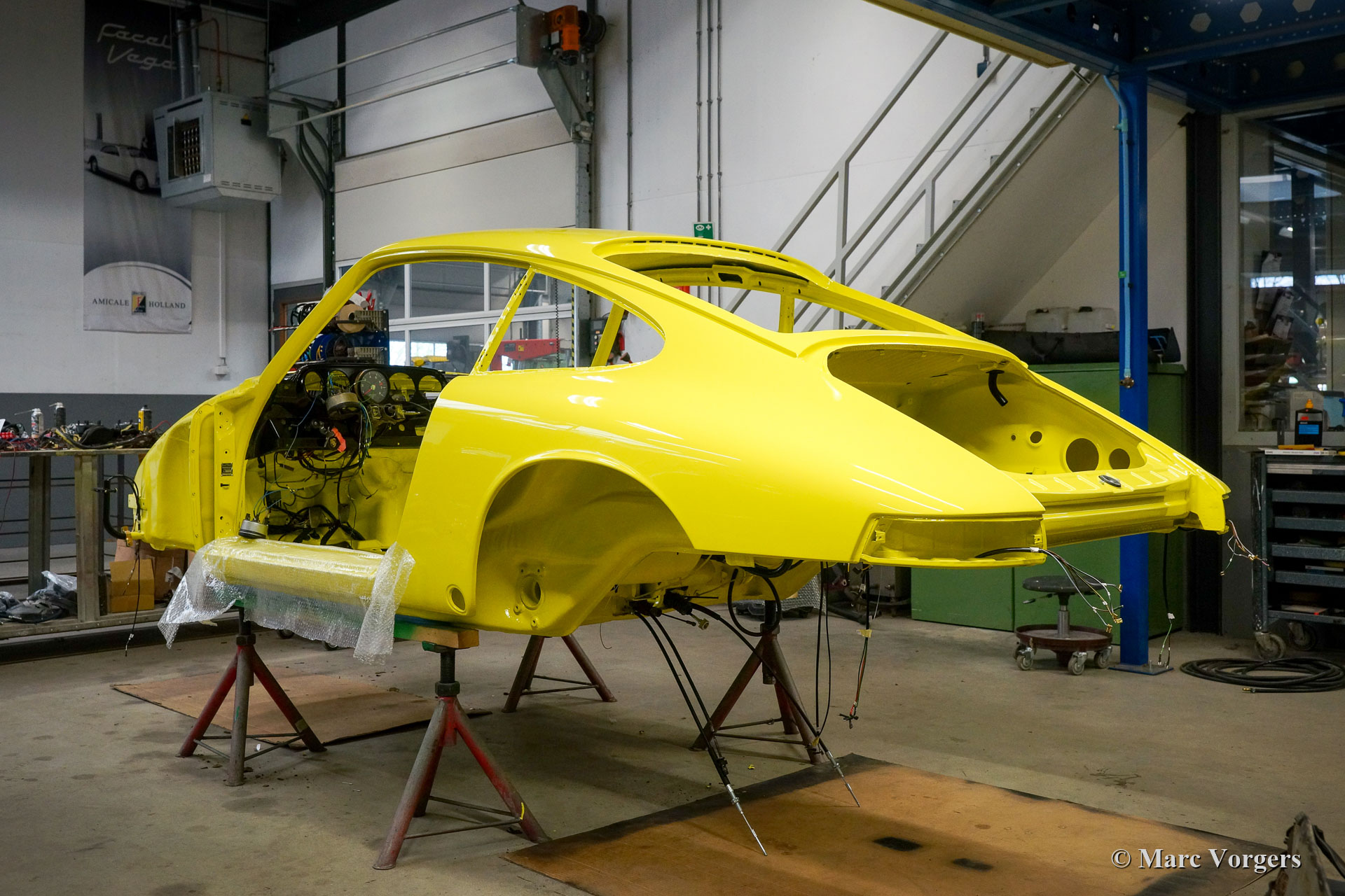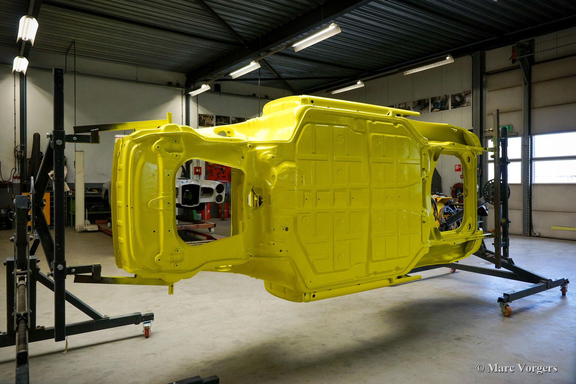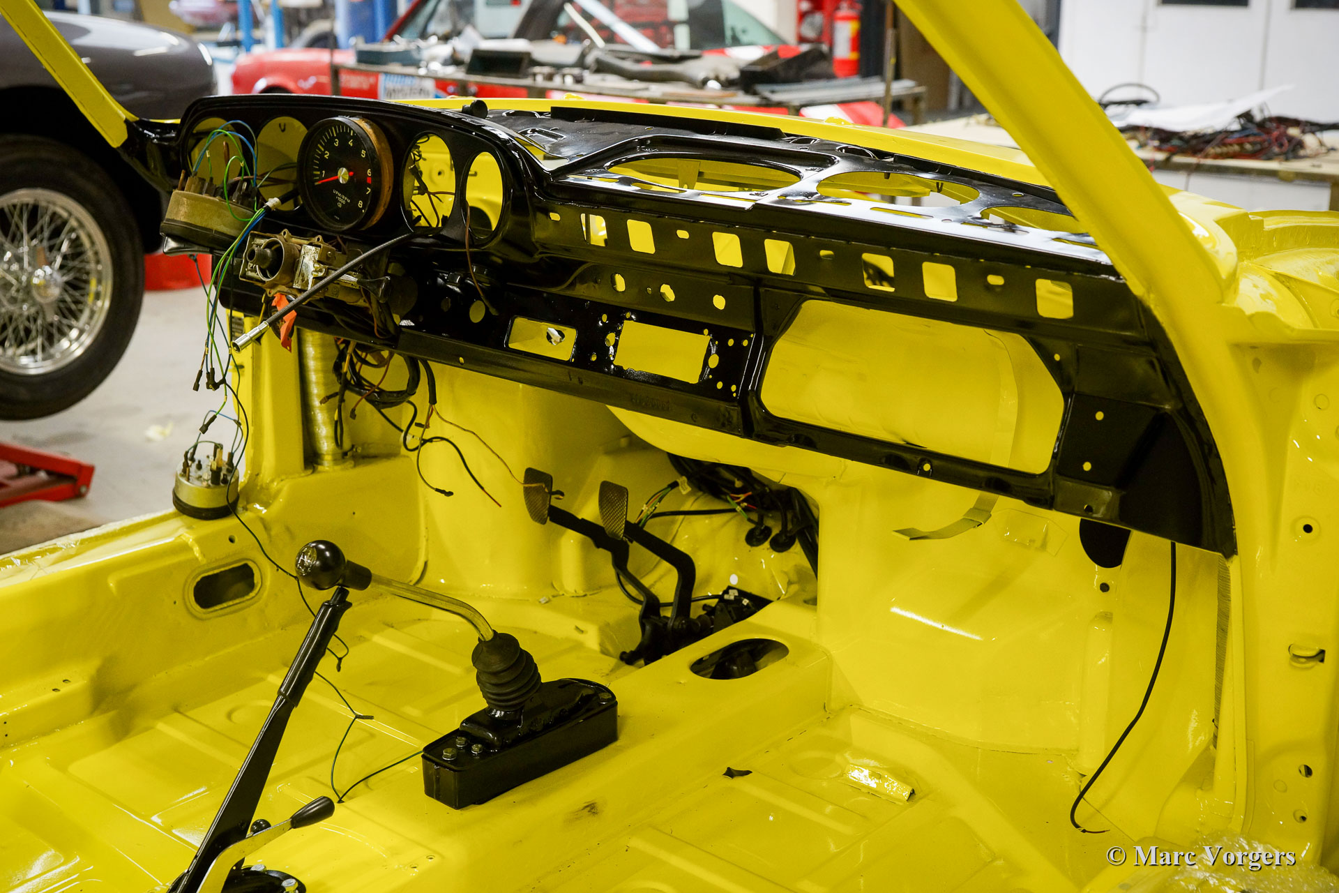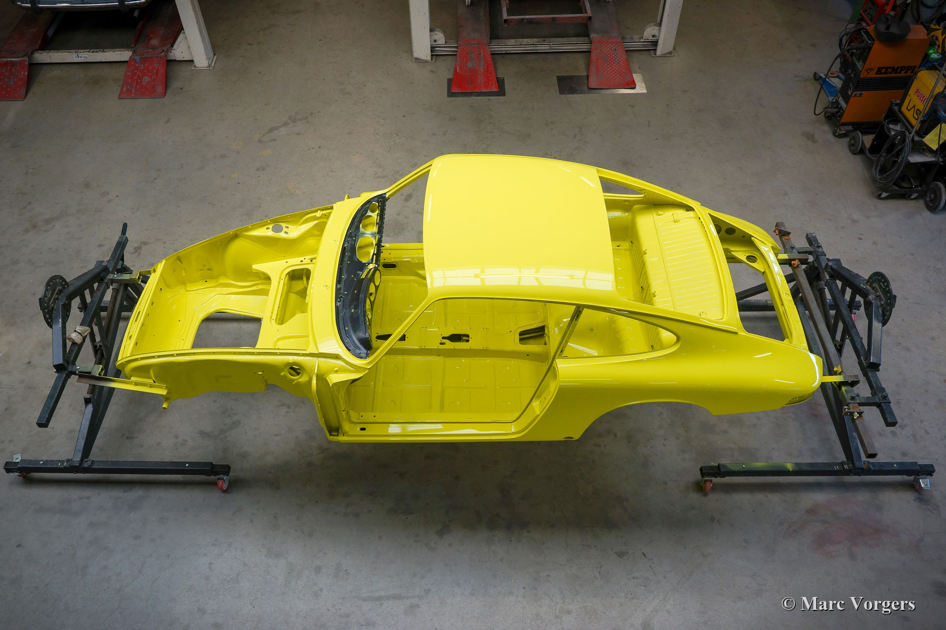 After completion of the sheet metal work the body was given a black KTL coating (primer) in a dip bath. This way, the coating covers the sheet metal inside and out, also in the seams and in the smallest hollow spaces. After that, the body was smoothened, primed and given a perfect paintjob in lemon yellow. After that, the car was rebuilt with the cleaned and refurbished original parts that were present before the restoration. Wear parts and rubbers have of course been replaced during construction. Here you have an excellent opportunity to study a Porsche 911 F-series SWB body in detail!