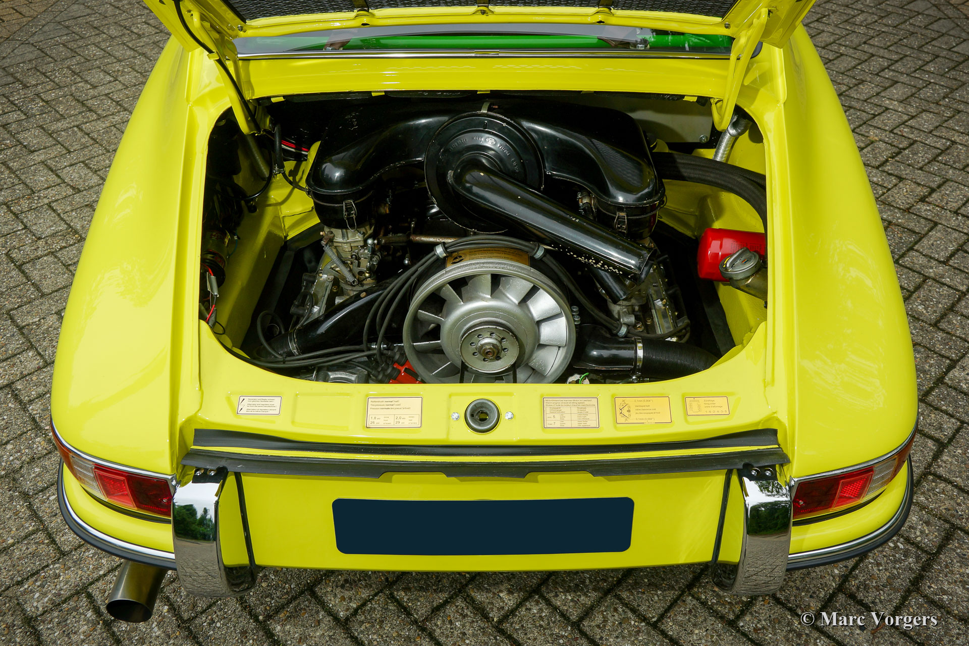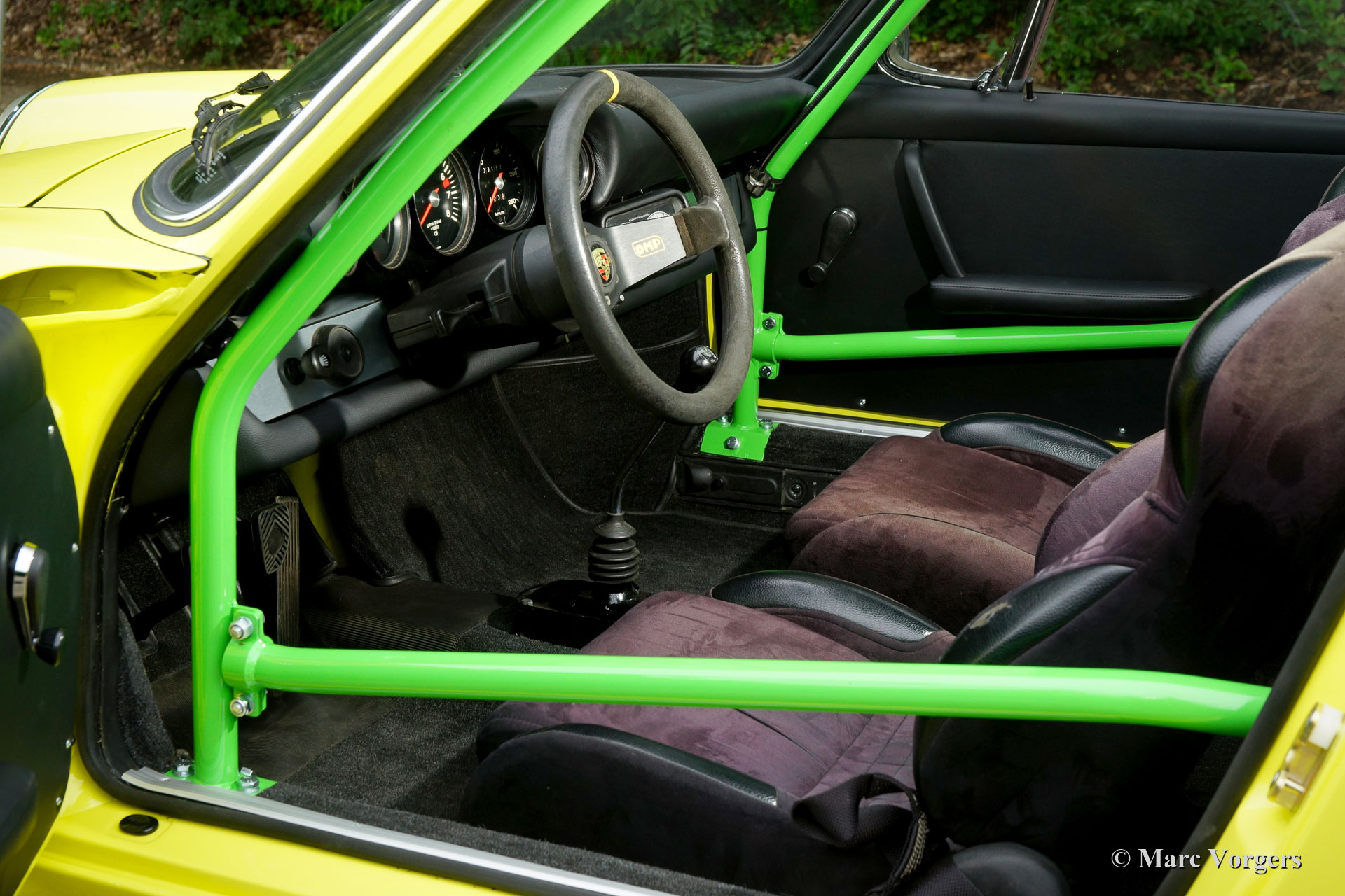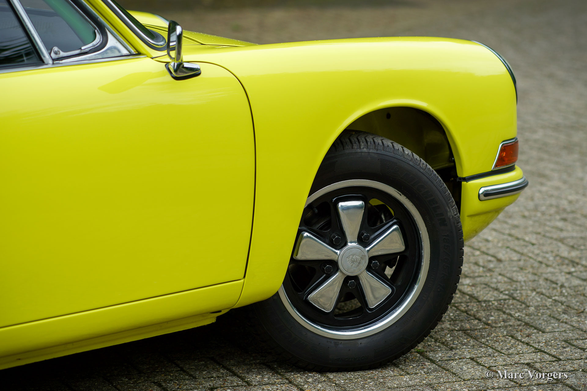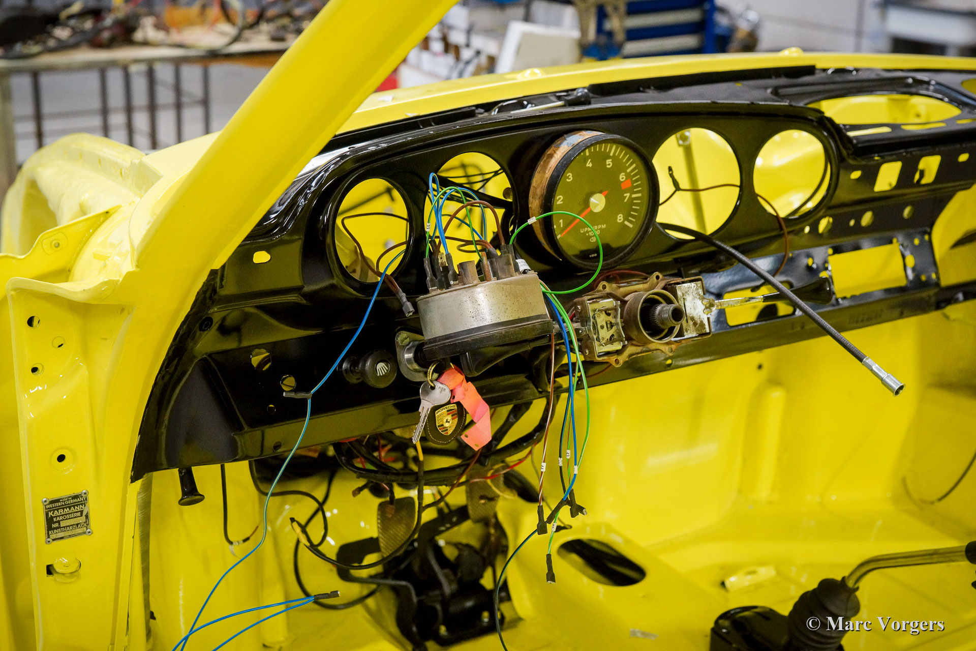 After completion of the sheet metal work the body was given a black KTL coating (primer) in a dip bath. This way, the coating covers the sheet metal inside and out, also in the seams and in the smallest hollow spaces. After that, the body was smoothened, primed and given a perfect paintjob in lemon yellow. After that, the car was rebuilt with the cleaned and refurbished original parts that were present before the restoration. Wear parts and rubbers have of course been replaced during construction. Here you have an excellent opportunity to study a Porsche 911 F-series SWB body in detail!