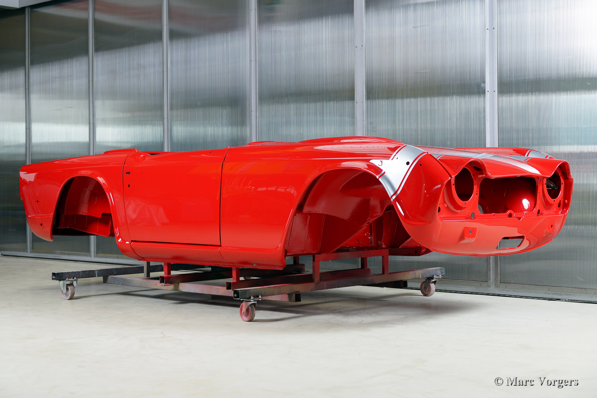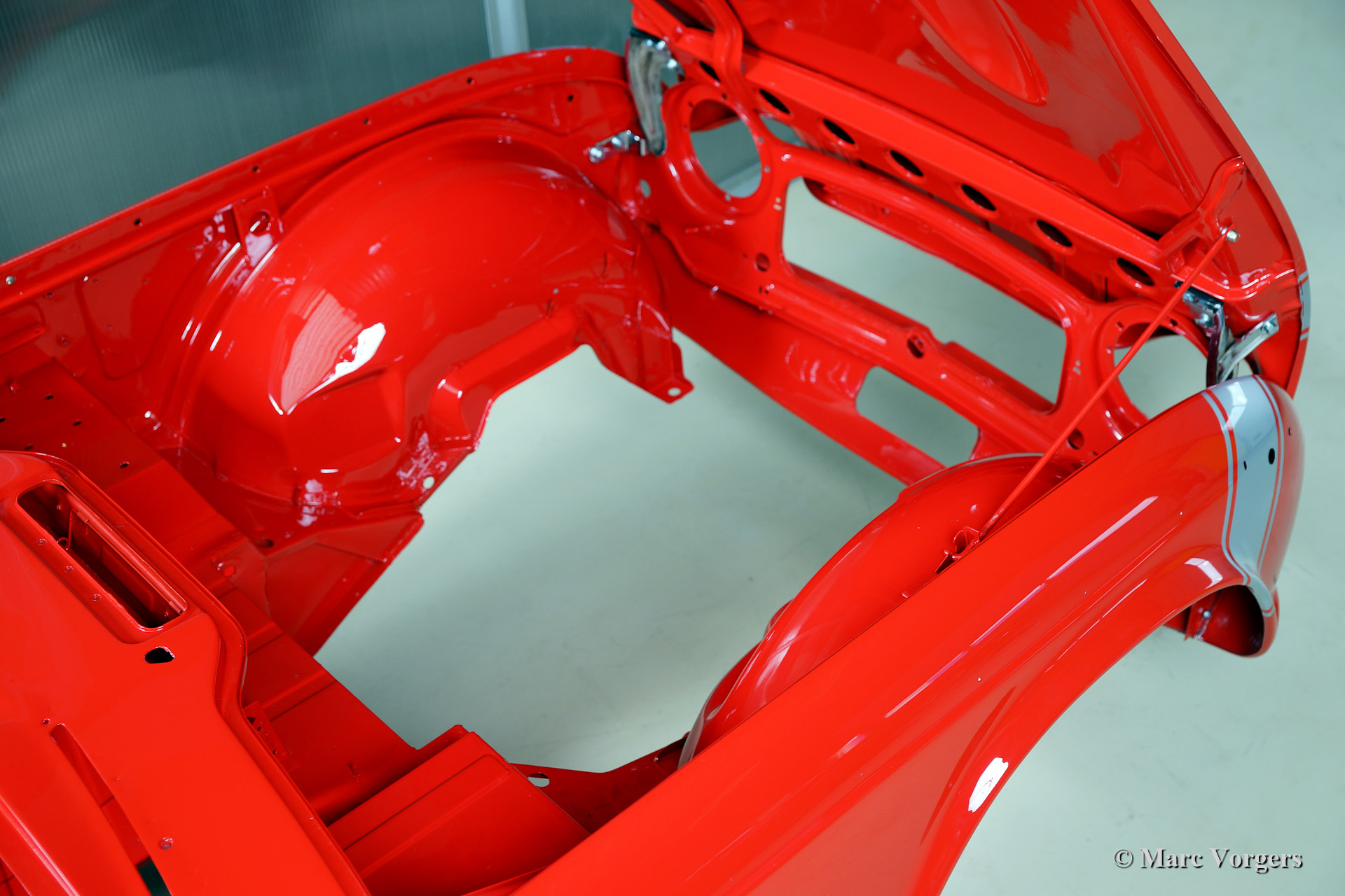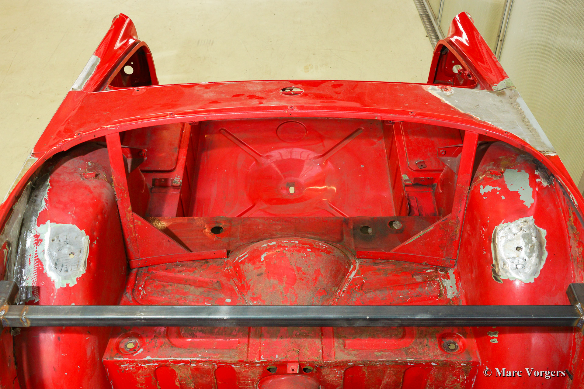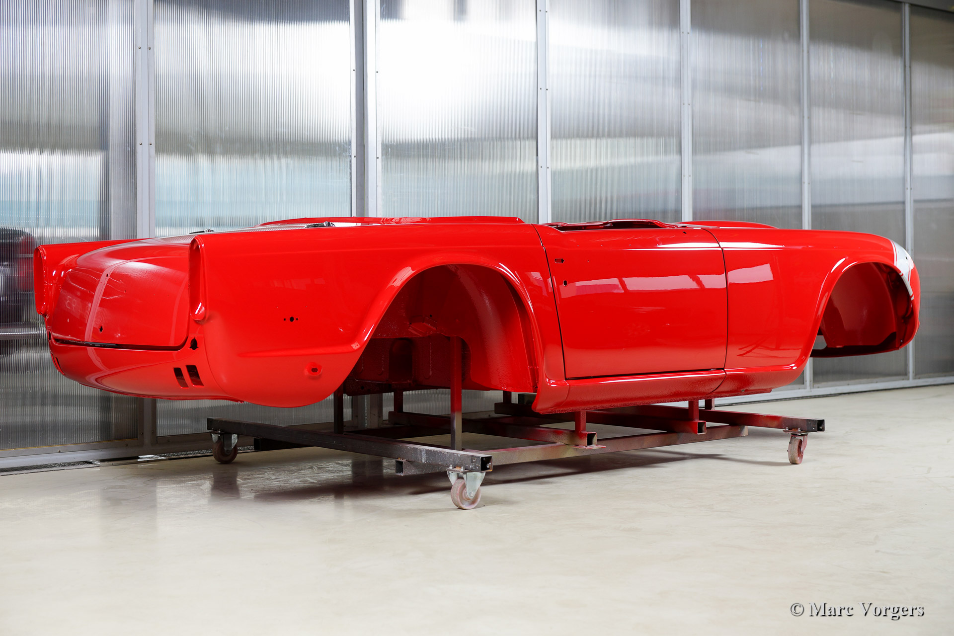 Triumph TR 250 bare metal body restoration. The car was fully stripped, paint removed, blasted and primed with epoxy. Sheet metal work carried out. Currently the body is at the paintshop. The body is sanded down to the bare metal, epoxy primed, primed, smoothened and then finished with a modern multi layer paint system.