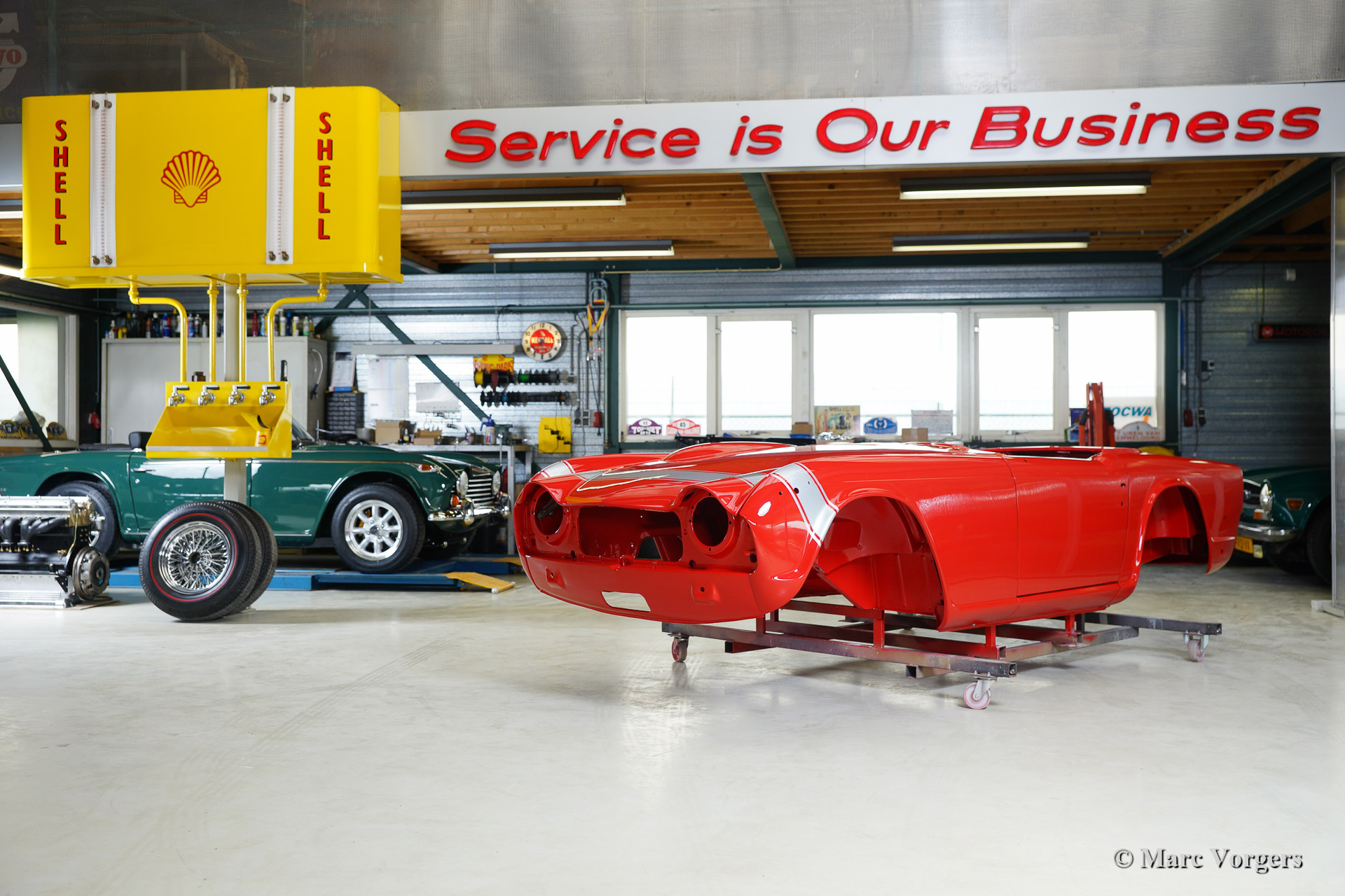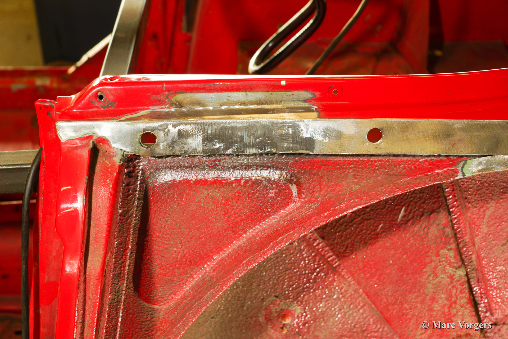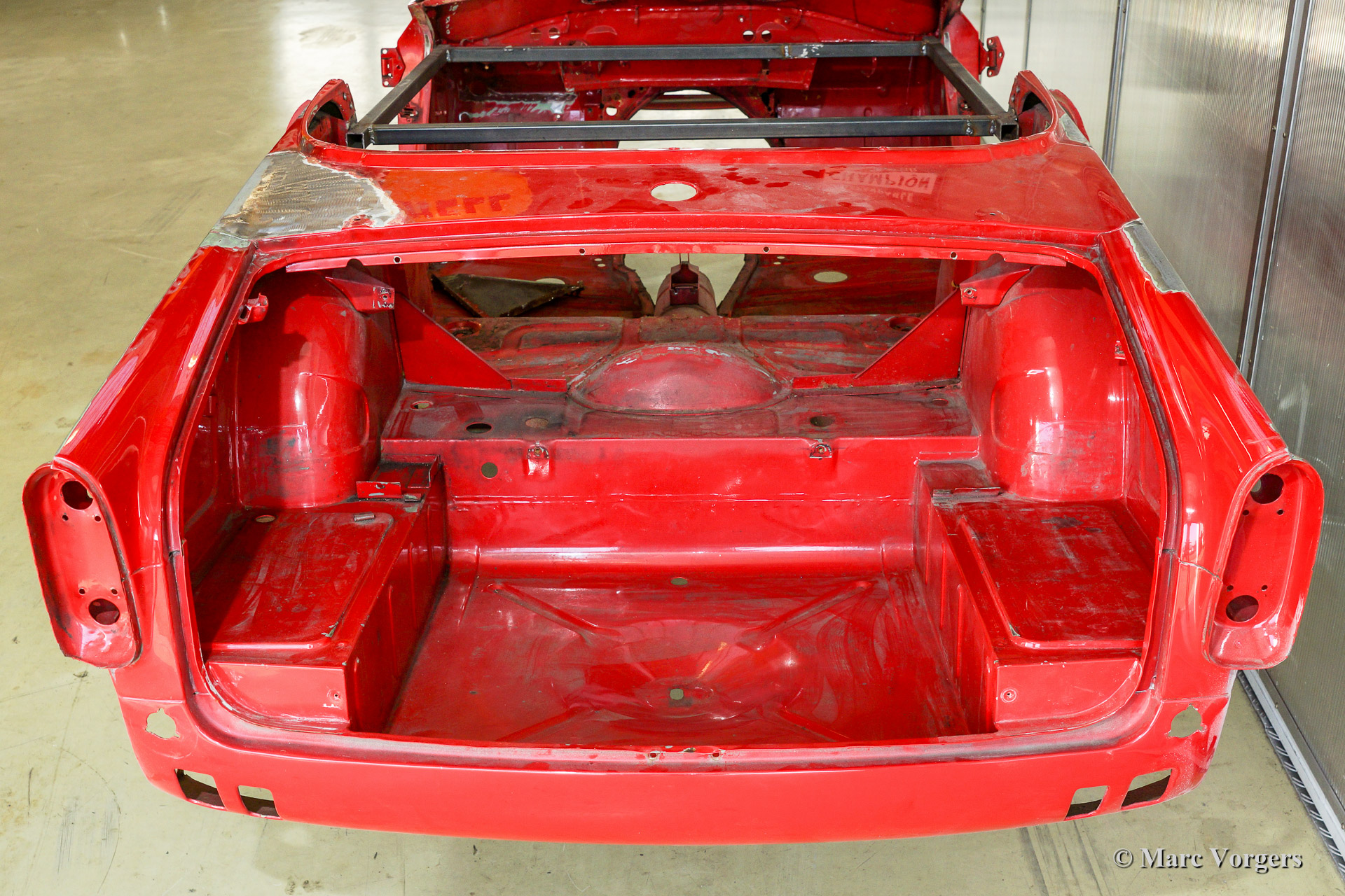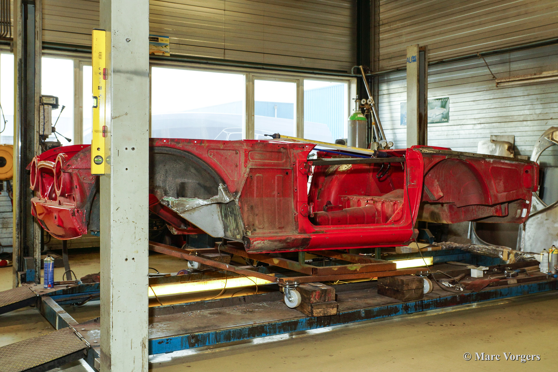 Triumph TR 250 bare metal body restoration. The car was fully stripped, paint removed, blasted and primed with epoxy. Sheet metal work carried out. Currently the body is at the paintshop. The body is sanded down to the bare metal, epoxy primed, primed, smoothened and then finished with a modern multi layer paint system.