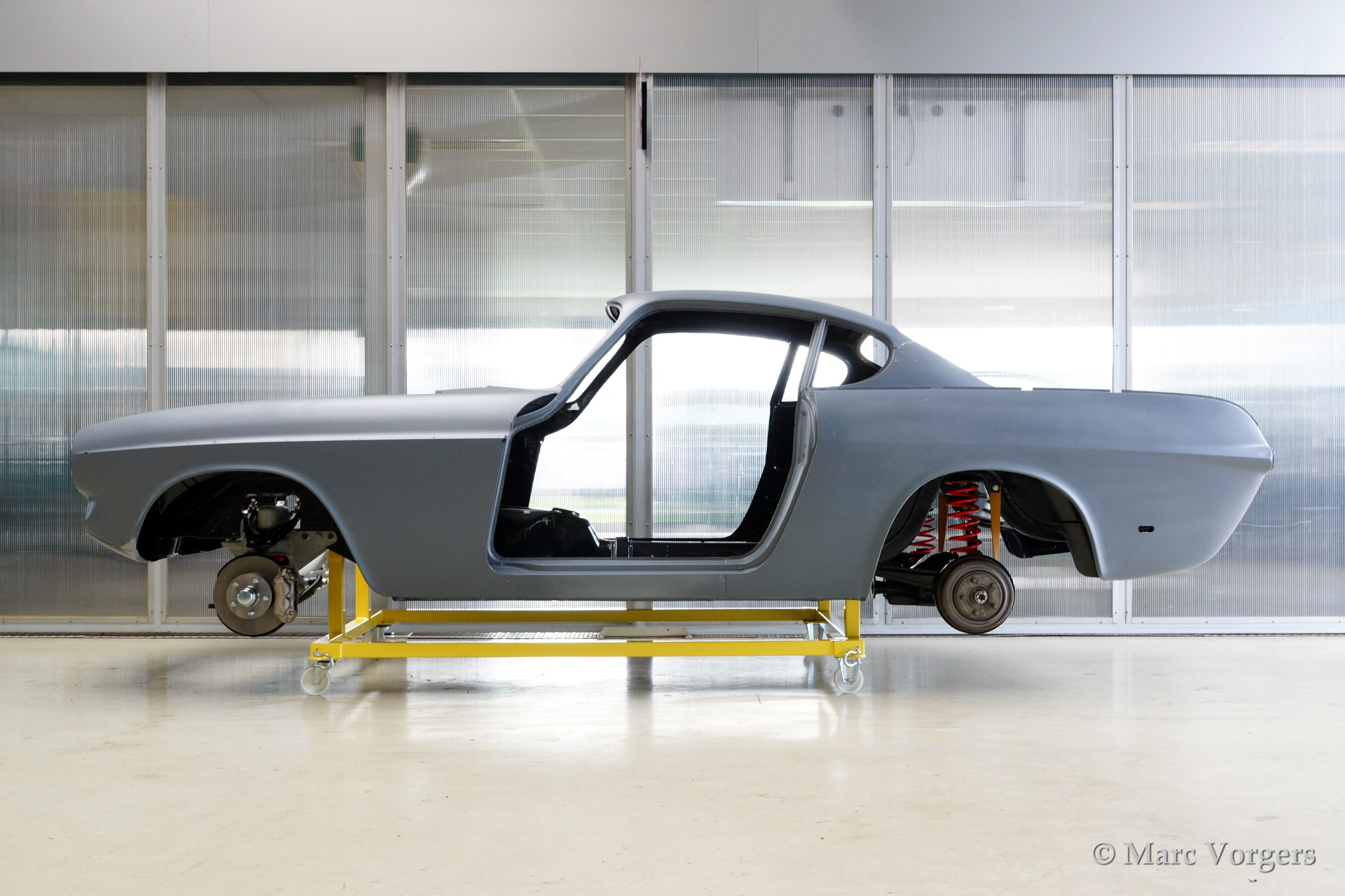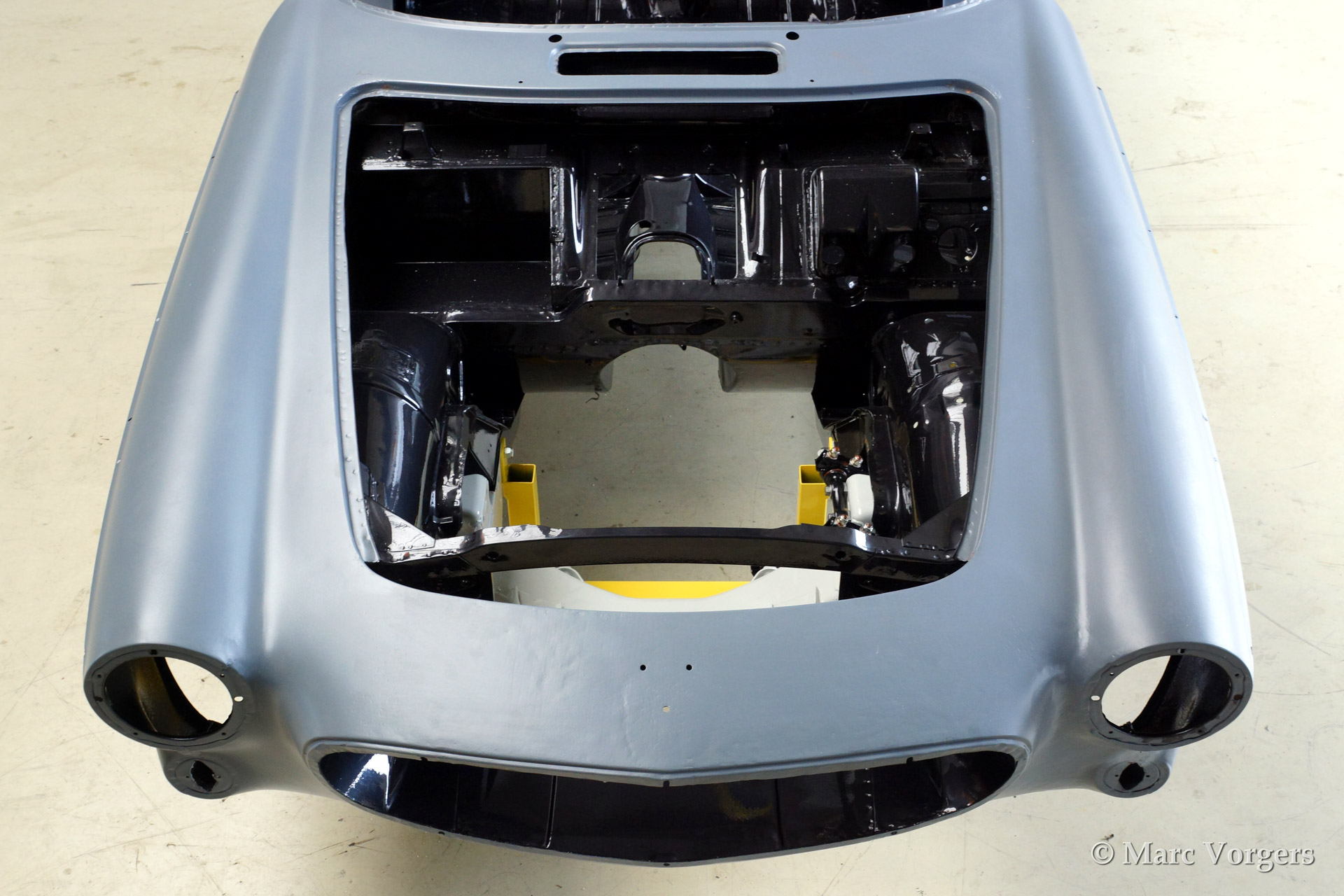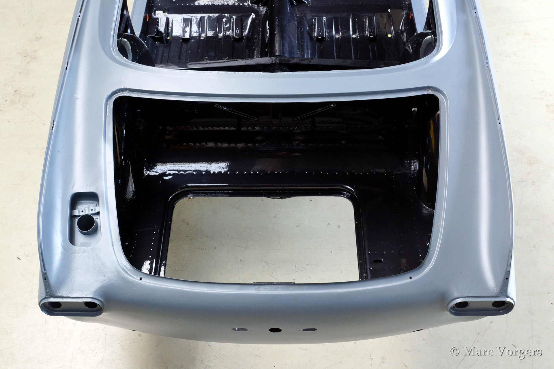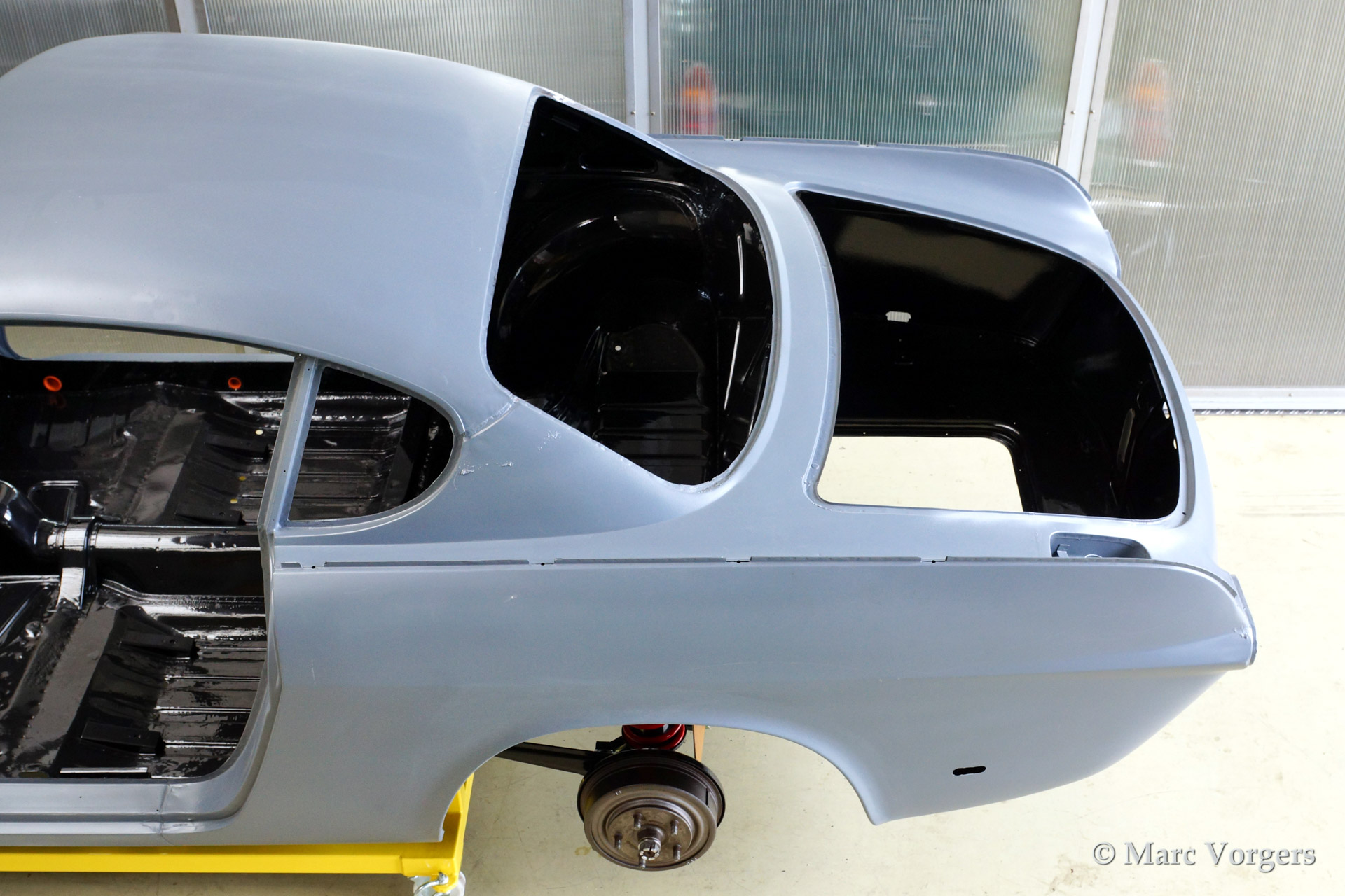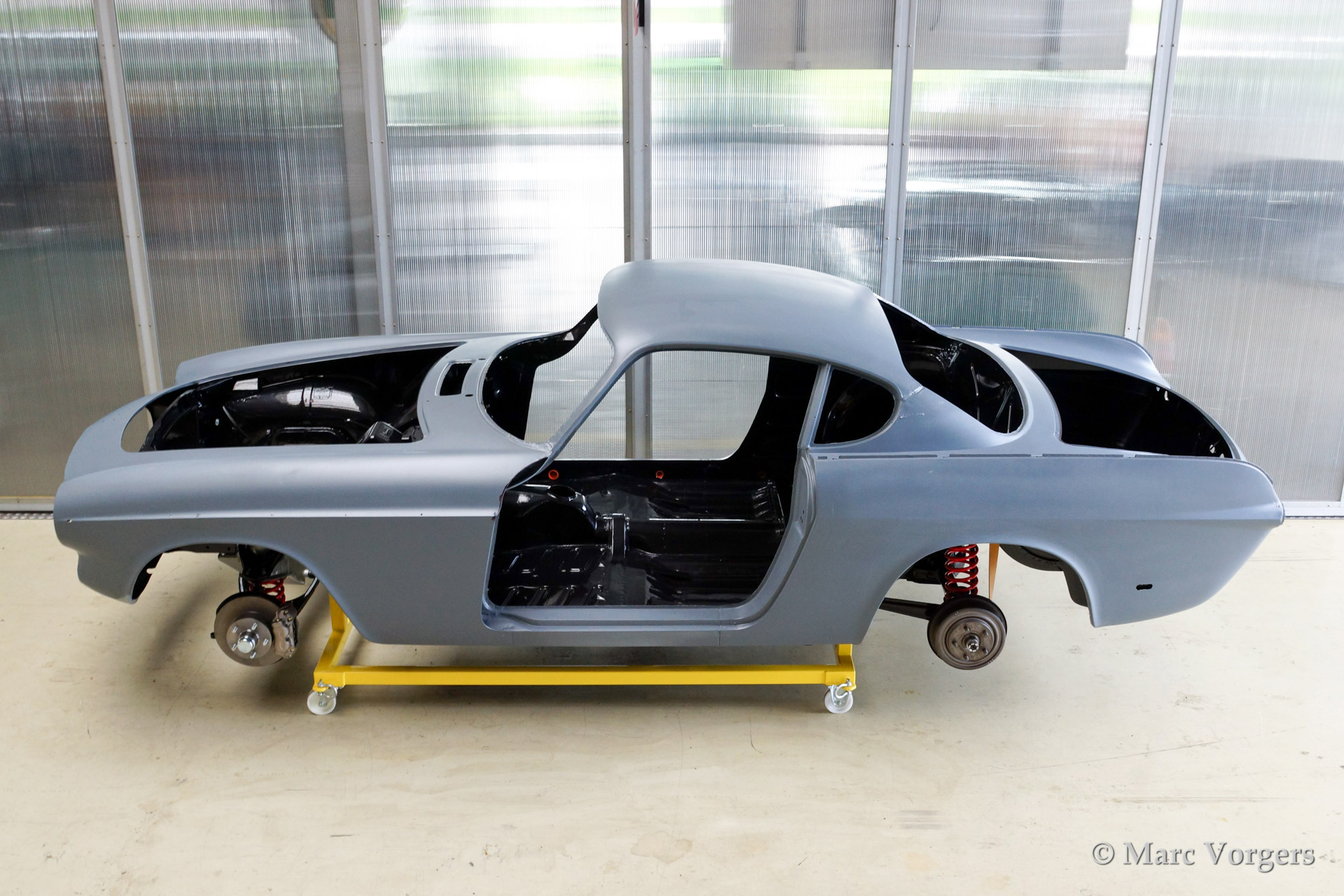 Volvo P1800 S full restoration. The car was stripped and the old paint fully removed. Then the bare metal was epoxy coated. The sheetmetal work was carried out and the body was sanded down before it received a layer of epoxy primer. The body was smoothened and primed (dark grey). The inside has been painted antracite metallic.