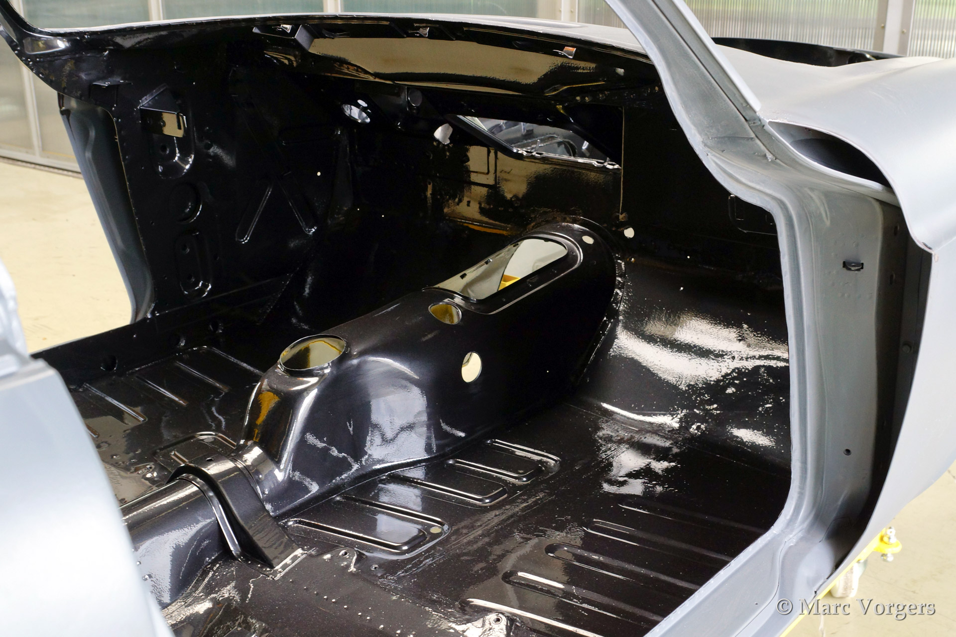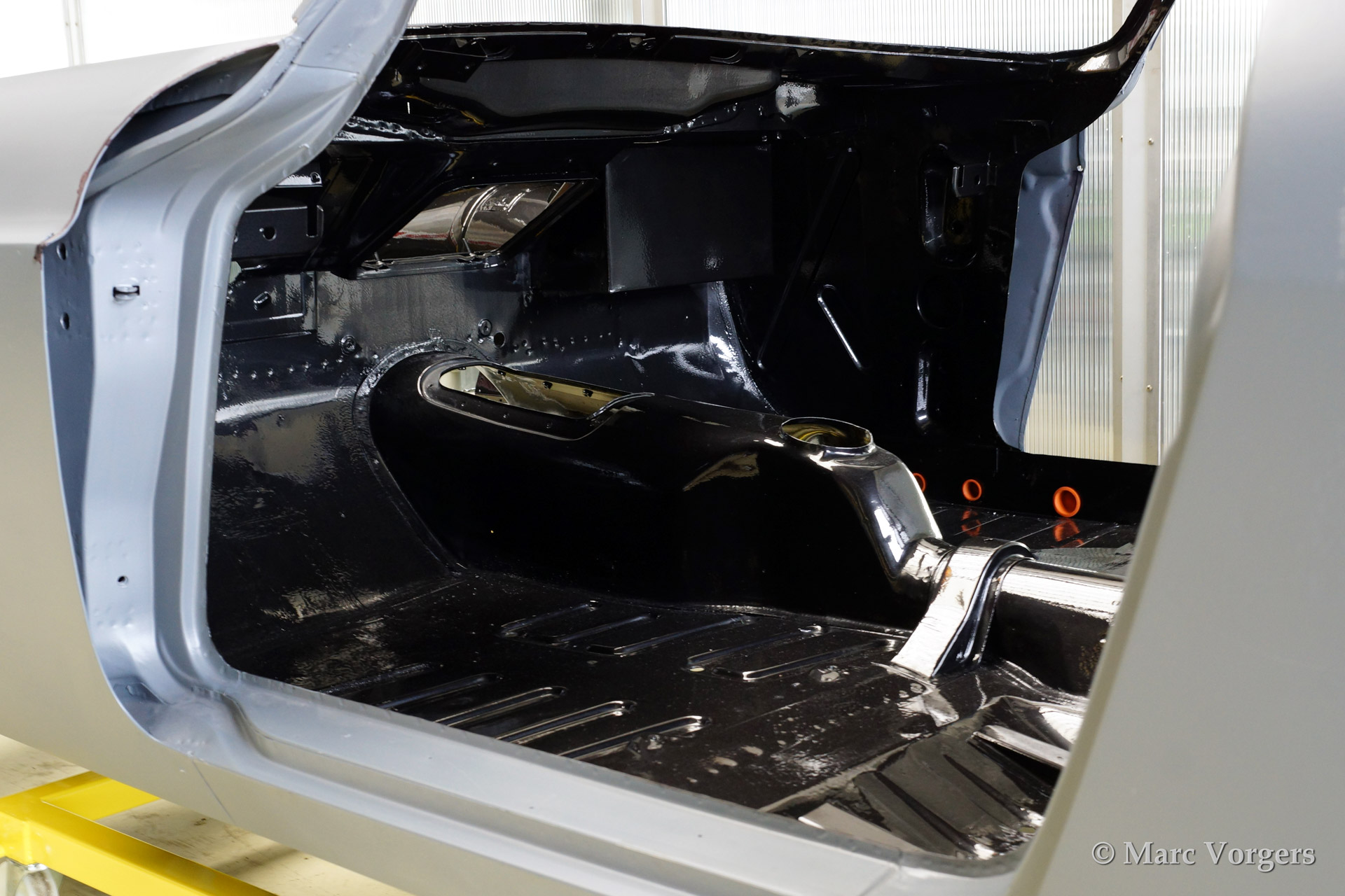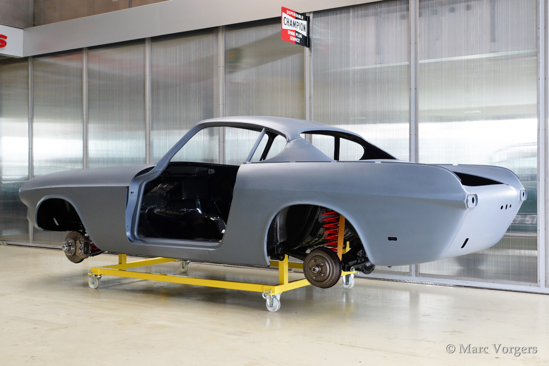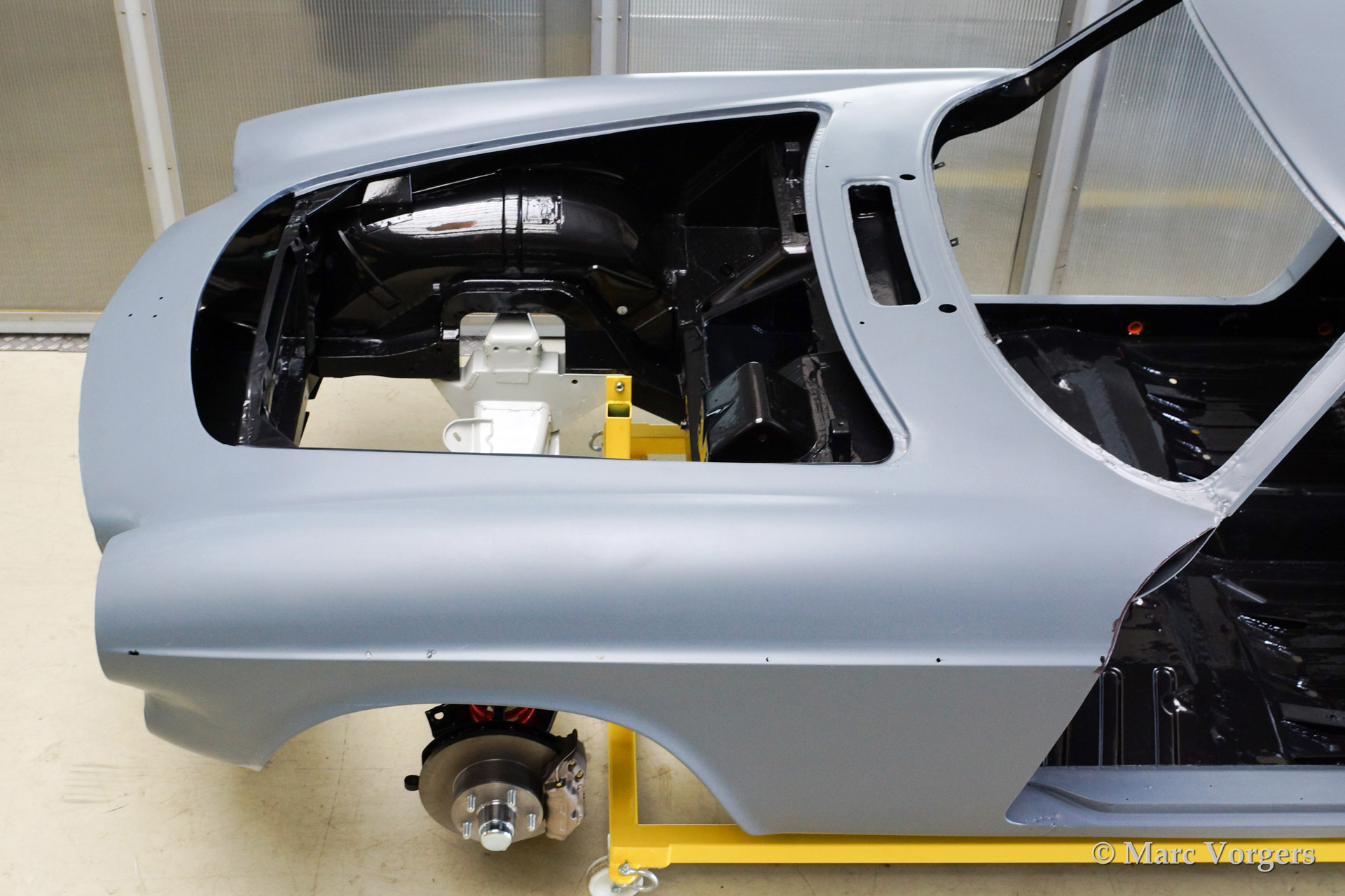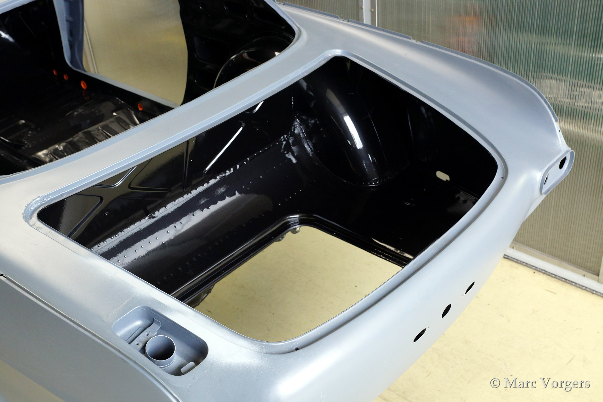 Volvo P1800 S full restoration. The car was stripped and the old paint fully removed. Then the bare metal was epoxy coated. The sheetmetal work was carried out and the body was sanded down before it received a layer of epoxy primer. The body was smoothened and primed (dark grey). The inside has been painted antracite metallic.